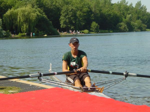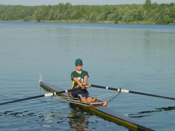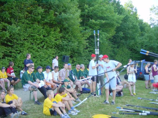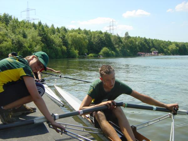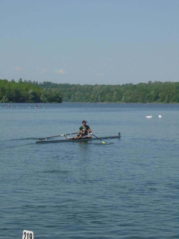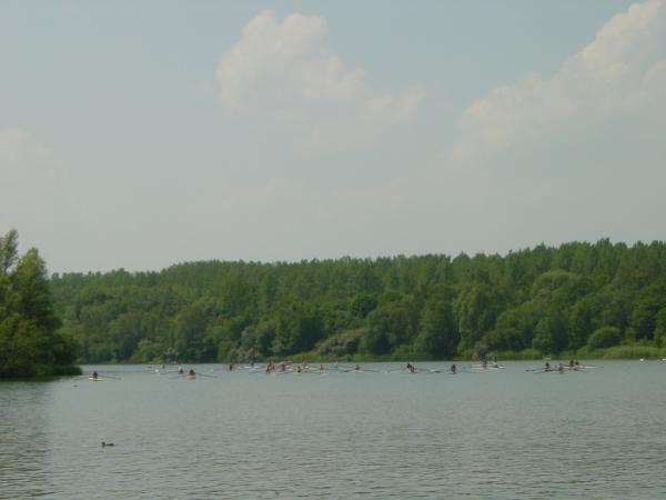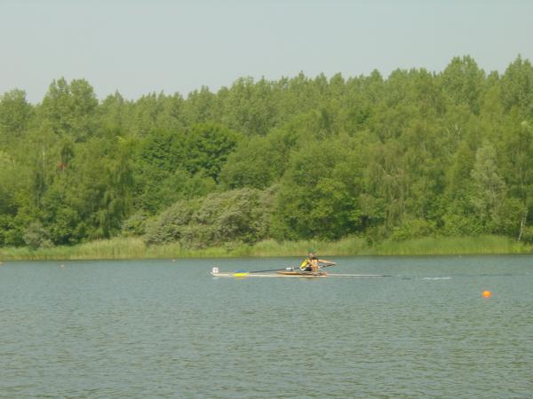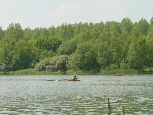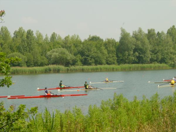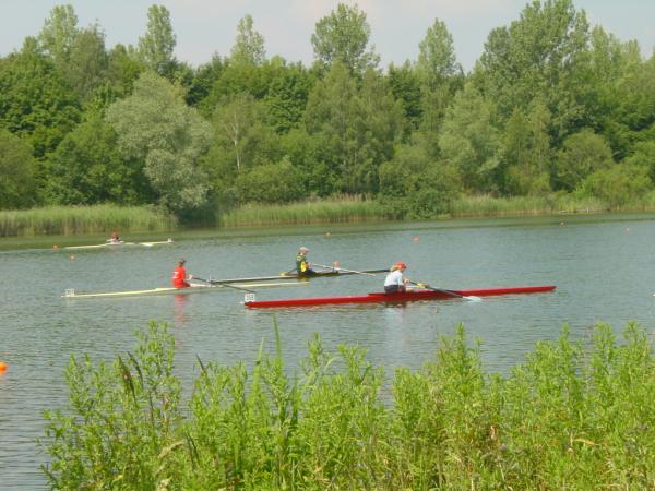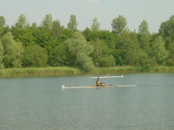 Nach der mehr als achtstündigen Anreise am Donnerstag wurde das Ruderrevier beim ersten Training erkundet – flaches Wasser mit starken Pflanzenbewuchs, jeweils zwei Starter für eine markierte Startbahn (in Eilenburg hat jeder Starter eine eigene Bahn) und sengende Hitze waren nicht gerade ideale Regattabedingungen.