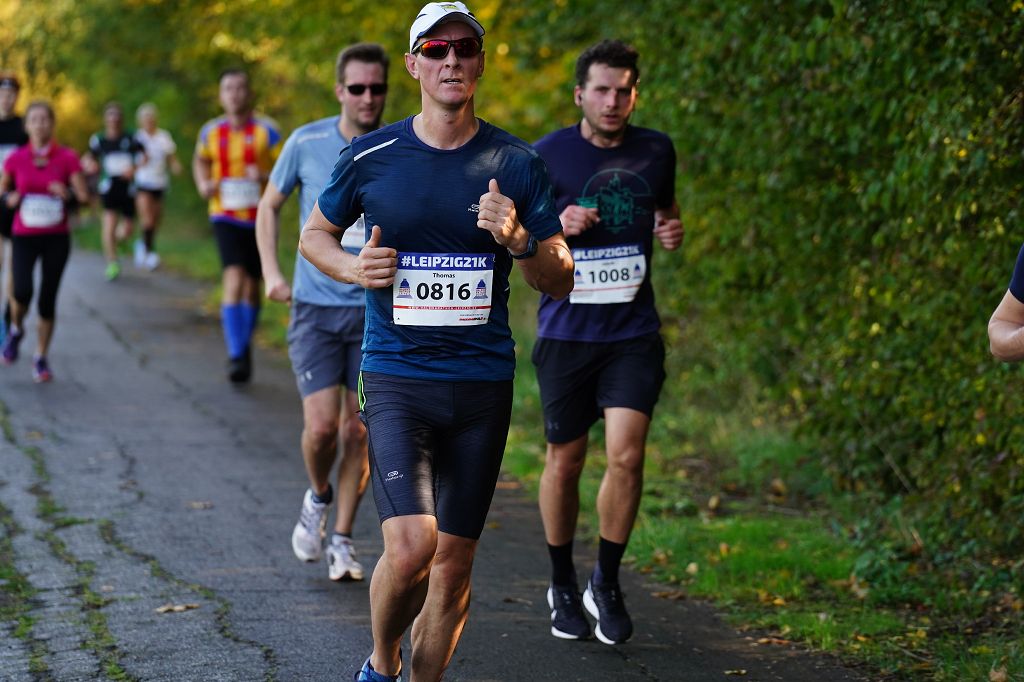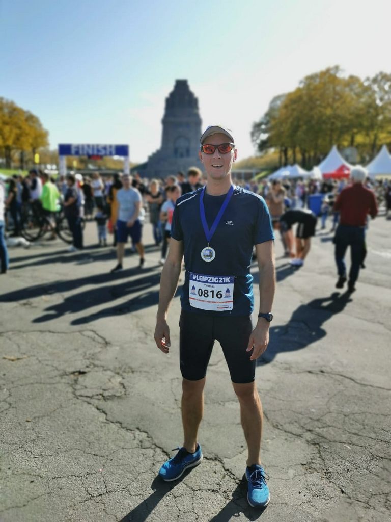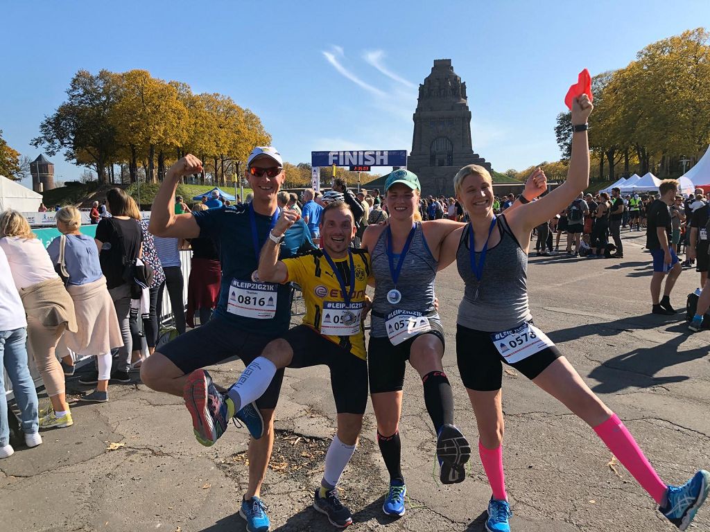 Am Sonntag holte meine Schwester, die über „Lauf geht’s“ ebenso teilnahm, mich und Anne als wichtige moralische Unterstützung um 8Uhr ab. Bis zum Start war es noch reichlich eine Stunde und so konnten noch Fotos gemacht werden, obwohl nur die einlaufende Mannschaft fotografiert werden sollte. Danach war Aufwärmen angesagt. Vor der Kulisse des Völkerschlachtdenkmals begaben wir uns 15min vor Beginn in die Starterzone. Eine Kanone als Startschuss kennen wir in Eilenburg ja, aber die Druckwelle am ganzen Körper zu spüren war schon was. Um dann ging es schon los auf die 21,095 km durch den Leipziger Süden. Vorher nicht zu viel trinken und nicht zu schnell loslaufen - das hatte ich in der Fachliteratur gelesen. Zu schnell laufen war auf den ersten Kilometer sowieso nicht möglich, da ich mitten im Pulk steckte, aber das lockerte sich nach und nach auf. Mit dem Trinken hat nicht so gut funktioniert - schon nach 2km drückte die Blase. Zum Glück ging mir kurze Zeit später der Schuh auf und da ich zum zuschnüren halten musste, erledigte ich das andere gleich mit.