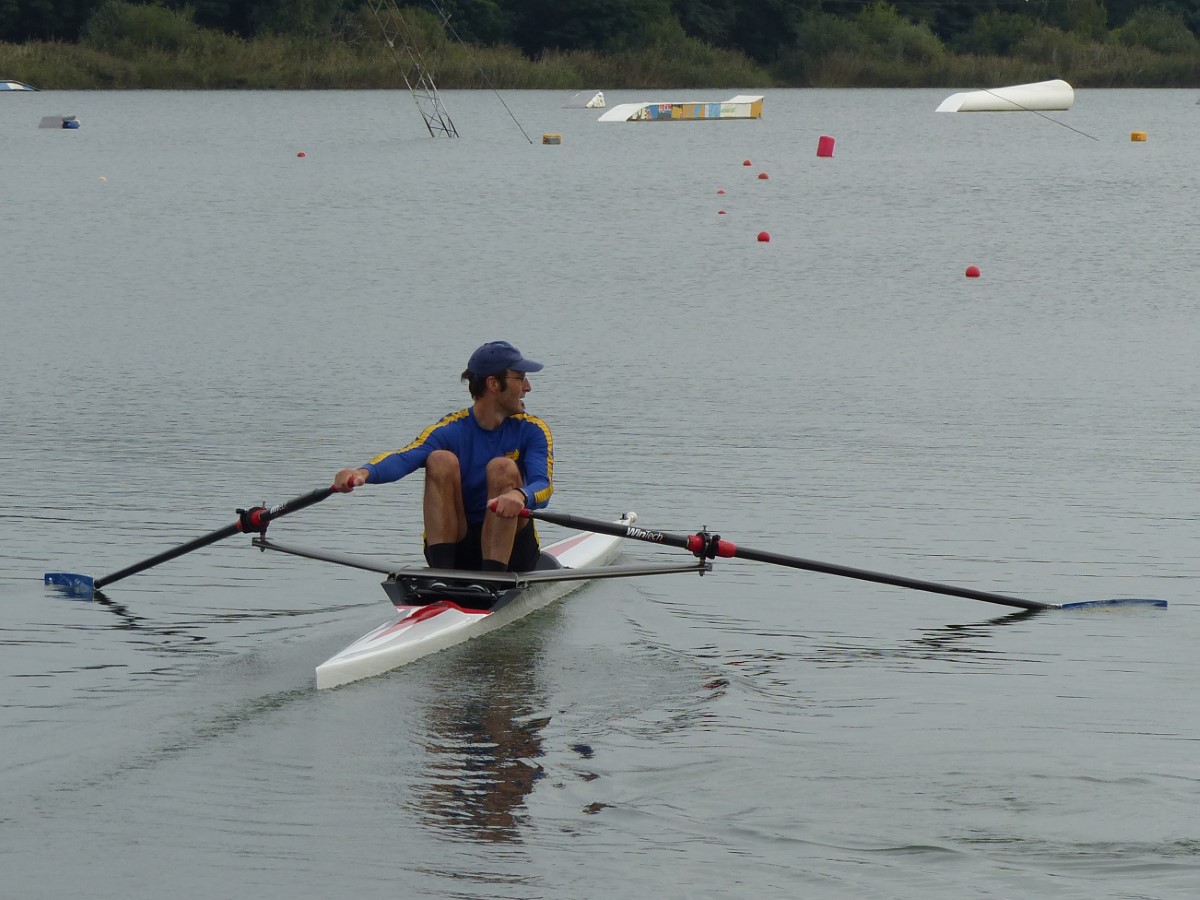 Etwas mehr Erfahrung haben gemeinhin die Mastersruderer im Alter von 27 Jahren und älter vorzuweisen. Da hier die Teilnehmerdichte sehr rückläufig ist, wurden verschiedene Alterklassen zusammen gewertet. Jüngere erhielten nach dem Zieleinlauf entsprechende Zeitaufschläge, die von vornherein festgelegt waren. Rayk Bremme-Jung hatte aufgrund seiner Gegner aus den Jahrgängen 1959 und 1946 mit zusätzlich 14 bzw. 44 Sekunden zu rechnen. Entsprechend gespannt erwartete der 1971 geborene die Auswertung des Einer-Rennens. Nach leicht verpatztem Start hatte er sich mit konstanter Leistung einen anständigen Vorsprung erarbeitet und landete auf Platz Zwei im Sechs-Boote-Feld. Am Ende reichte es für eine Bronzemedaille. Vom undankbaren 4.Rang trennte ihn nur eine Sekunde, Glück muss man haben! Der älteste Sportler konnte den 2.Platz ergattern. Dieser sei dem 75jährigen von Herzen gegönnt, zeigt es doch, wie lang ein aktives Ruderleben währen kann.