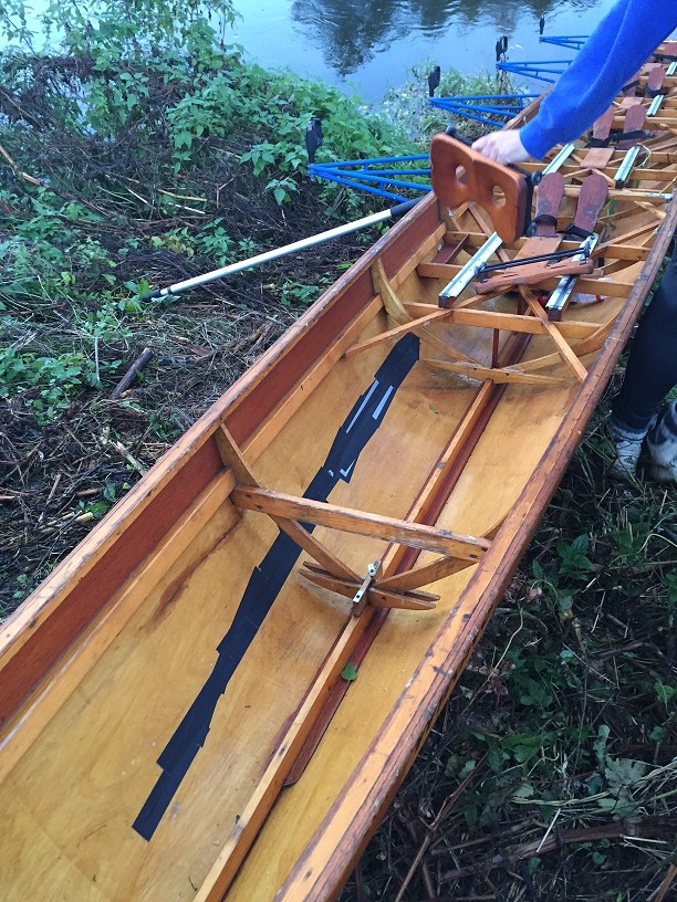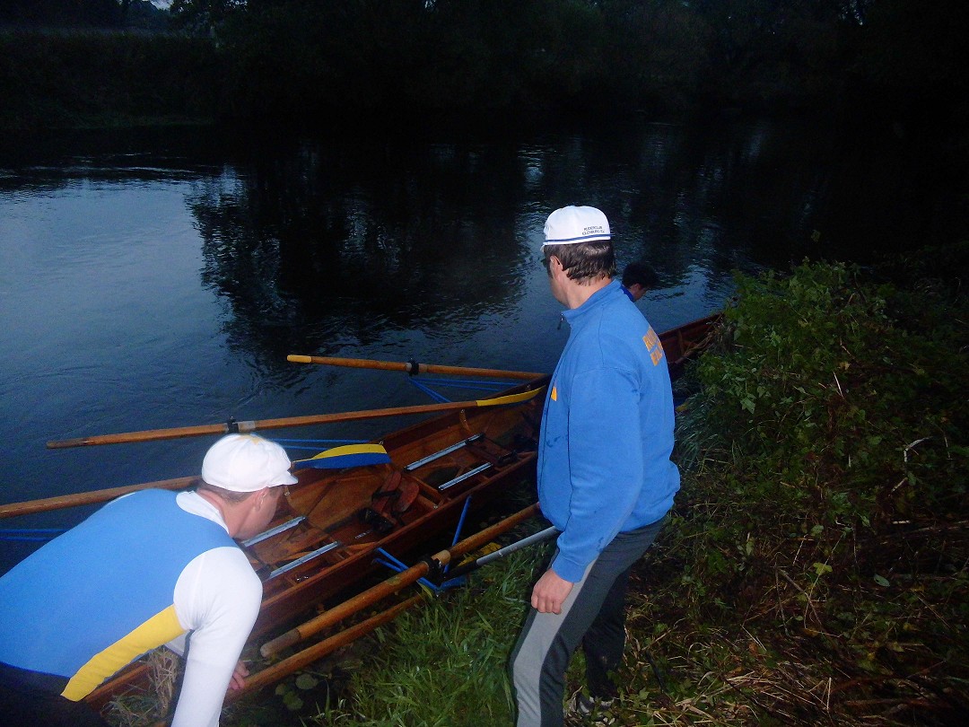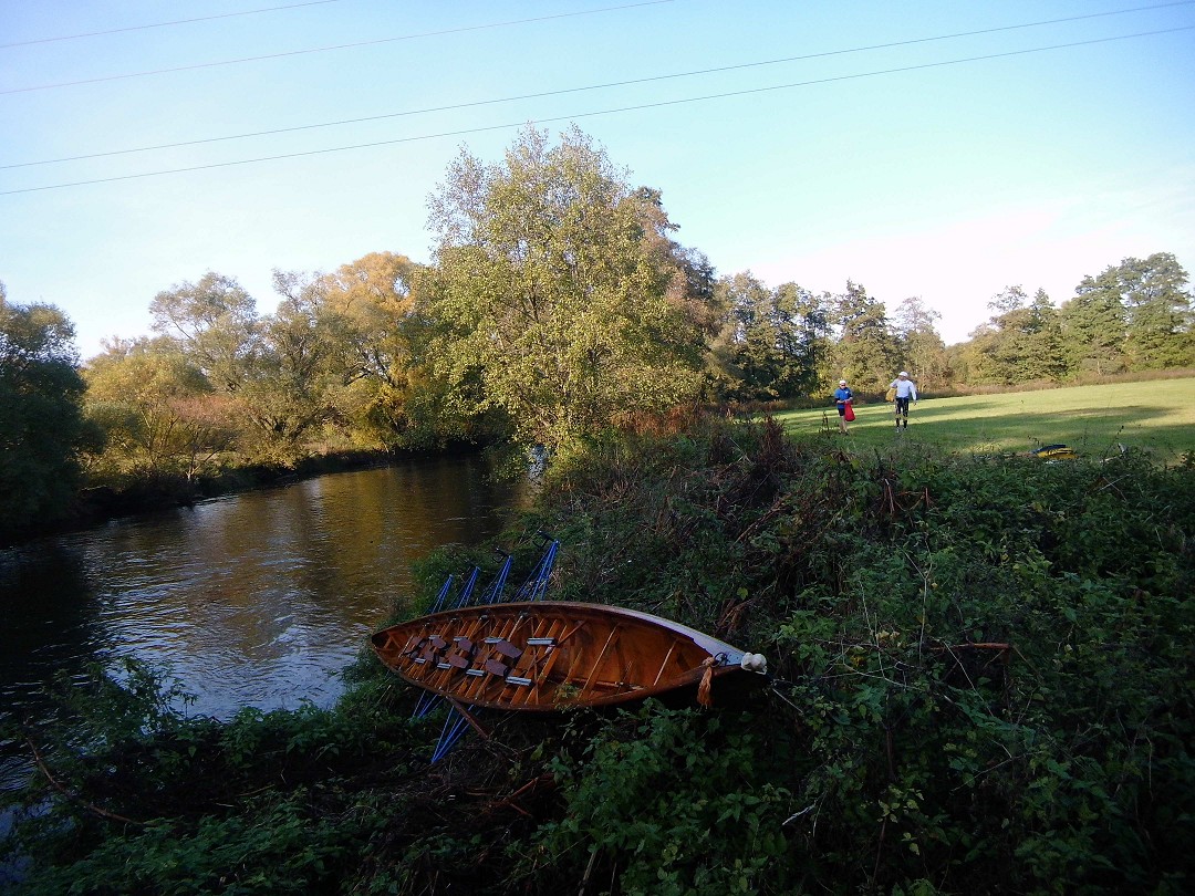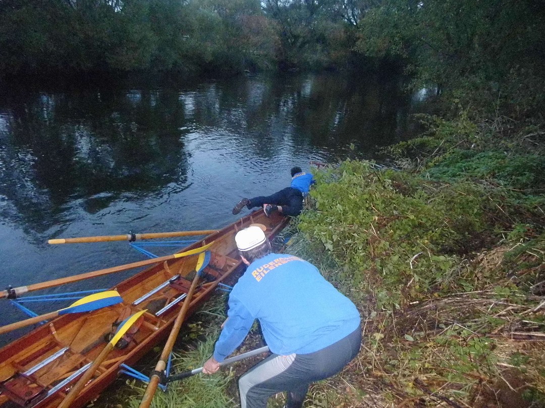 Nach der berüchtigten 2-Brückendurchfahrt glaubte die 7-köpfige Mannschaft der Wiking, es sei das gröbste überstanden. Doch ein paar hundert Meter vorm Ziel ging ein Ruck durchs Boot. Im Bug wurde ein Wassereinbruch gemeldet, der sich zügig auch im Heck bemerkbar machte. Ein Ast mitten im Strom und unterhalb der Wasserlinie hatte die Fahrt fürs erste beendet. Man schaffte gerade noch, trockenen Fußes das rettende aber steile Ufer zu erreichen und das Boot zu entladen. Die nachfolgenden Kameraden wurden gewarnt, so dass es keine weiteren Verluste gab. Das leere Boot konnte zu einer flacheren Stelle getreidelt, trockengelegt und vor der Abfahrt provisorisch „getaped“ werden.