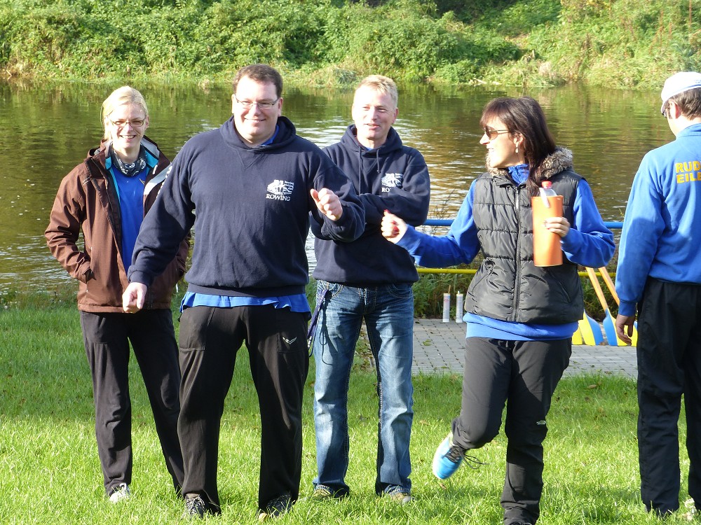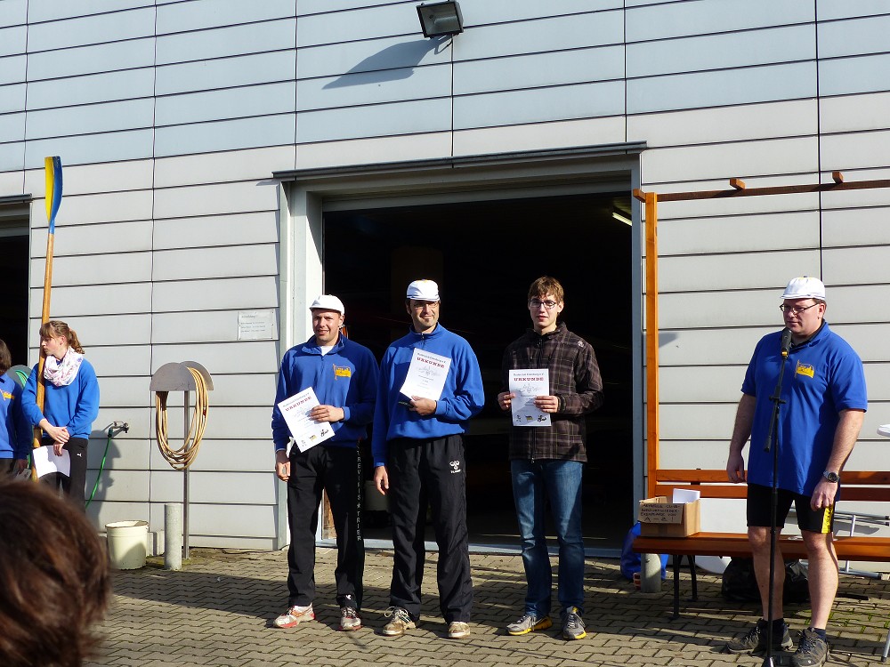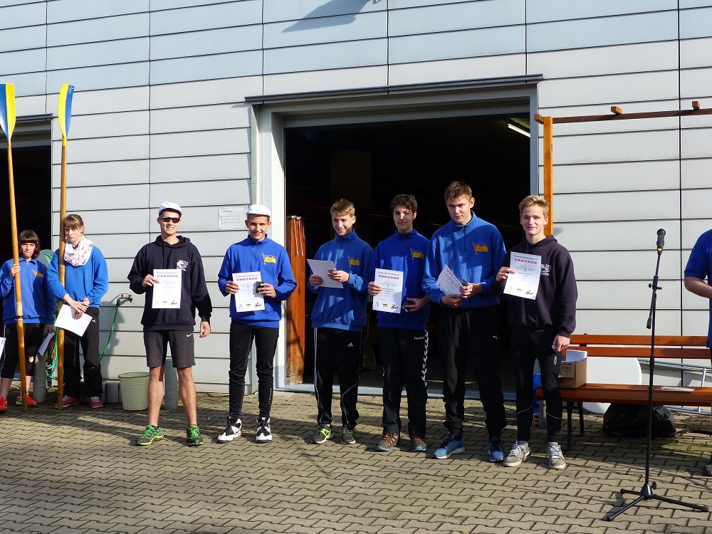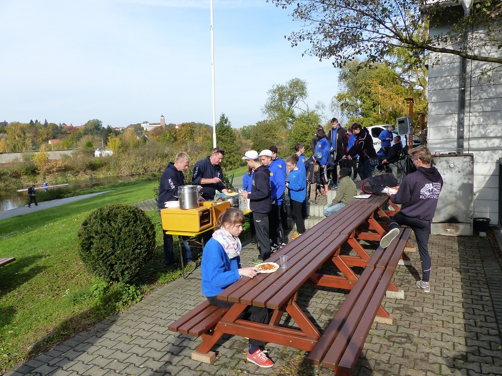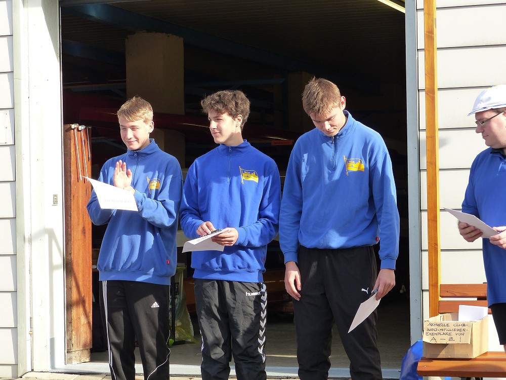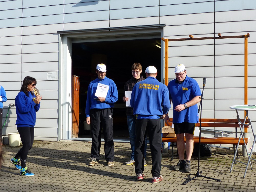 Nach einem leckeren Mittagessen (natürlich Nudeln mit Tomatensoße), geliefert von der Fleischerei Krause, gab es die Ansprache des Vorsitzenden Felix Weiske und die Siegerehrungen. Danach wurden die Vereinsmeister im Gig-Doppelvierer unter den 4 ausgelosten Mannschaften ermittelt. Hier gewann die Mannschaft mit Mathias Groth, Rayk Bremme-Jung, Christoph Krüger, Malte Jung und Steuerfrau Anna Buhle.