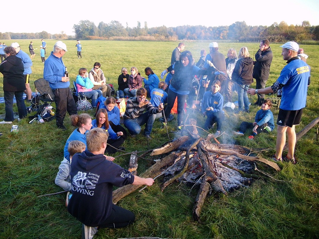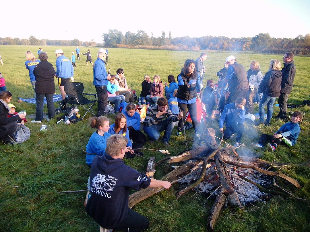 Inzwischen brannte schon das Lagerfeuer. Die „Fußtruppen“ waren auch bereits eingetroffen. Mit leckeren Würstchen, Knüppelkuchen und Getränken war der gemütliche Teil des Tages bald in vollem Gange. Ehe man sich’s versah, warf die Sonne lange Schatten. Höchste Zeit für die obligatorische Gesangs- und Klampfeinlage! Nach einer Handvoll Liedern und ordentlich Applaus wurde schon wieder zum Rückzug gerufen. Bei Flutlicht wanderten die Boote in ihre Ablagen.