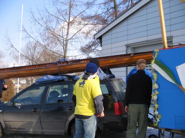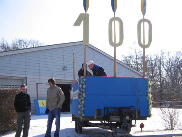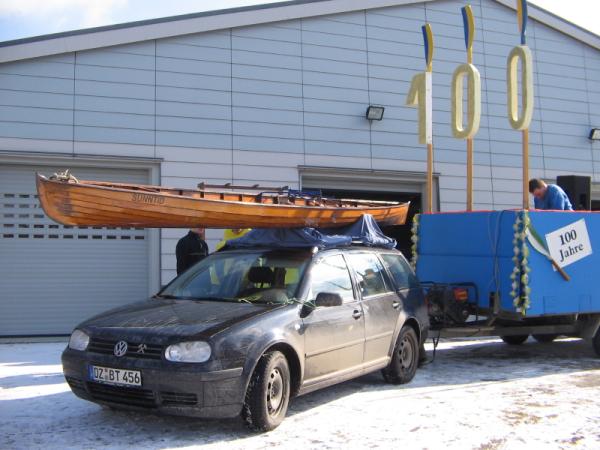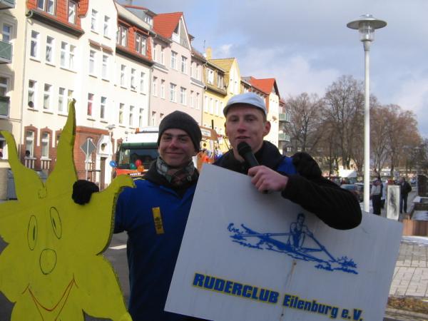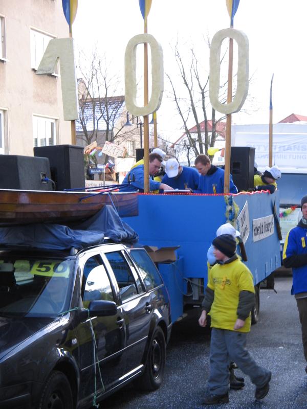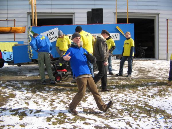 Schon zum 5ten Mal in Folge nahm eine Gruppe faschingsbegeisterter Clubmitglieder am größten sächsischen Rosenmontagsumzug in Eilenburg teil. Mit einer guten Beteiligung, vor allem in den jüngeren Jahrgängen, konnte dieses Projekt zur vollsten Zufriedenheit des Publikums über die Bühne gebracht werden. Wie schon in den Jahren zuvor diente das Wochenende vor dem Umzug zur Vorbereitung des Anhängers. Diese schon fast zum Ritual gewordene Aufgabe wurde unter besonderem Einsatz der Jugendleiters Robert ohne größere Schwierigkeiten bewältigt. Es galt, den von Jürgen Dietrich freundlicherweise zur Verfügung gestellten PKW-Lastenanhänger in ein Faschingswunderwerk zu verwandeln. Dazu gab es 2 Arbeitseinsätze, einen für grobe Montage- und Lackierarbeiten und einen weiteren am Sonntag für Feinarbeiten und den Aufbau der Musiktechnik von DJ-KEF. Als dann alle Raffinessen installiert waren, wurde am Sonntag noch eine Proberunde auf dem Bootshausgelände unter voller Beflaggung gedreht. So musste am Montag nur der Wagen angehängt und die schöne B-Gig Suntid auf dem Dach des PKW befestigt werden. Nun noch ein paar persönliche Eindrücke: Um 13:00 Uhr ging es los in Richtung Anger. Dort wiesen die Ordner unserem Wagen eine Position zu, an der wir bis zu Beginn des Umzuges warteten und uns warm feierten. Der Treck setzte sich pünktlich 14 Uhr langsam in Bewegung. Tina, die den Anhänger mit einem PKW zog, erledigte ihre Aufgabe gut. So hielten wir unseren Abstand zum Vordermann und konnten mit Showprogramm und Schlachtrufen das Publikum auf unsere Seite bringen. Robert moderierte während der ganzen Fahrt durch lautstarke Mikroansagen. An der Stelle der höchsten Zuschauerdichte, also am Marktplatz, entledigten wir uns unserer Bonbonvorräte und einiger kleiner Präsente für die Zuschauer. Diesmal war die Liveberichterstattung über unseren Wagen im MDR auch sehr zu unseren Gunsten ausgefallen - ob hierzu wohl die zigfache Erwähnung des 100 jährigen Jubiläums beigetragen hat? Zu Stärkung aller Teilnehmer brachte Wilfrid einen Beutel voller Pfannkuchen direkt zu unserem Wagen. Am Ende der Citymeile "Leipziger Strasse" endete auch wie immer der Publikumsüberschuss und wir fuhren so zügig wie möglich in unseren Heimathafen zurück. Schade, dass einige Bootshauskinder und Jugendliche während des Umzuges am Straßenrand standen und weder bei den Vorbereitungen noch beim Umzug teilgenommen haben. Noch ein Hinweis: Man muss den Fasching nicht unbedingt nur als Fasching verstehen, sondern eher als Plattform zur Kommunikation und Präsentation in unserer Region. Abschließend soll allen 18 Teilnehmern gedankt werden, allen, die bei der Vor- und Nachbereitung halfen, und denjenigen, die uns Material oder andere geldwerte Vorteile zur Verfügung gestellt haben. Eine bessere Werbung für unser diesjähriges Clubjubiläum in Eilenburg kann man sich kaum wünschen.