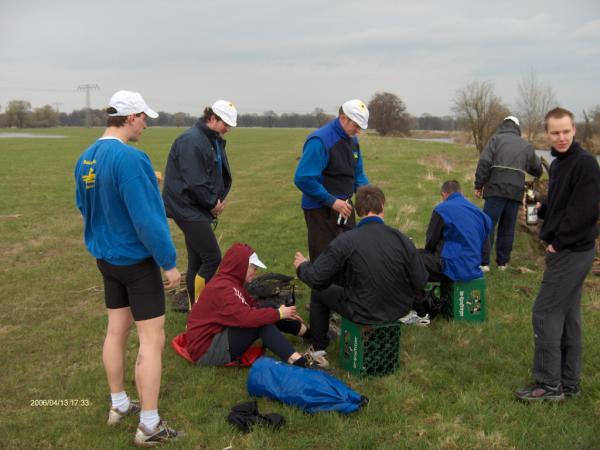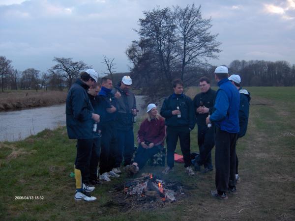 Da das Frühjahrshochwasser unserer geliebten Mühlgrabenausfahrt zum Anrudern leider nicht zuließ, wollten wir unbedingt zum Grün Donnerstag einen erneuten Versuch starten. Zunächst versprach die Wetterprognose einen sehr negativen Trend (5 °C und Regen, Tendenz kälter werdend). Doch Petrus hatte ein Einsehen und es wurden am Donnerstagnachmittag doch noch bei bedecktem Himmel 11°C und es hörte auch auf zu regnen. Gegen 18.00 Uhr fanden sich 10 Ruderwillige, die 2 Doppelvierer zügichst zu Wasser ließen und Flussaufwärts zur Eisenbahnbrücke ruderten. Durch den noch leicht erhöhten Wasserstand, zeigte diese eine sehr bedrohliche Strömung, und wir mussten doch einige Körner mehr lassen als sonst üblich. Zur Belohnung bot sich, aus dem hohen Pegelstand resultierend, eine sehr schöne Weitsicht in die gerade sich vom Winter erholende Auenlandschaft der Mulde. Dies quittierten alle Wasserwanderer durch eine hohe Ruderbreitschaft, so dass wir rasch ohne Pause an unserem alt bekannten Rastplatz ankamen. Behagliche Wärme spendete uns ein zünftiges Feuer, wobei sich die innere Wärme erst durch ein leckeren Kräuter, gepflegten Irish Whisky und durch ein zünftiges Endprodukt einer ortsnahen Brauerei einstellte. Während nun auch die Sonne am Horizont einen Weg zu uns fand, ließen wir noch den einen od. anderen Schwank aus der Vergangenheit aufleben. Um 19.45 Uhr ruderten wir wieder in leichter Dämmerung zum Heimathafen zurück. Die Boote waren schnell gewaschen. Unsere erlebten Eindrücke erzählten wir im Bootshaus am Tresen unseren nicht teilnehmenden Kameraden & Kameradinnen, in der Hoffnung sie für den nächsten Grün Donnerstag auch mit im Boot dabei zu haben. Hier die Teilnehmer: Torsten S, Felix, Thomas O, Sebastian Weisse, Robert, Andrea, Steffen S., Tilo P. Matthias und