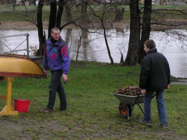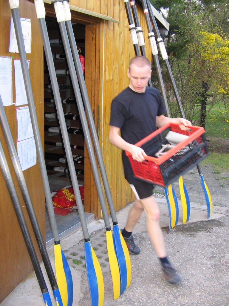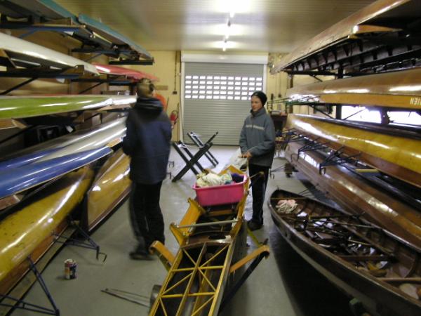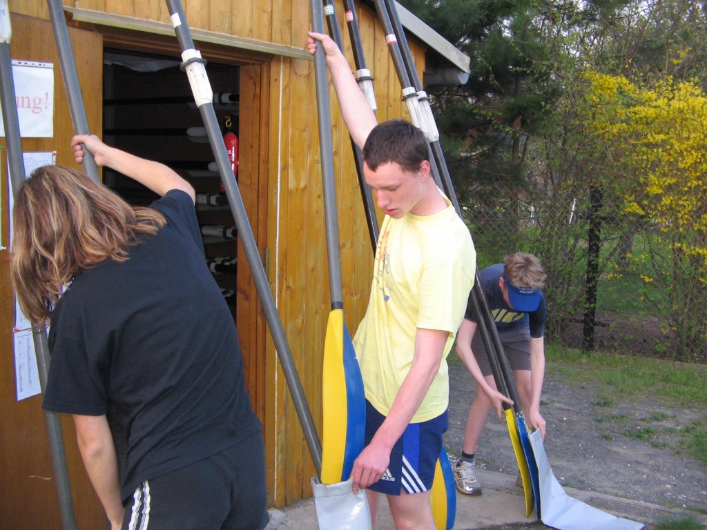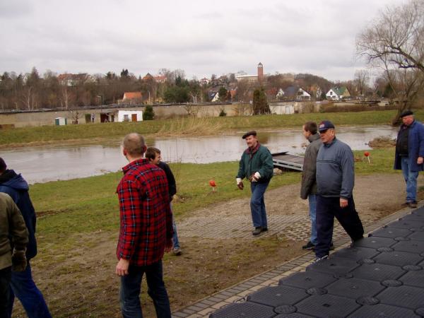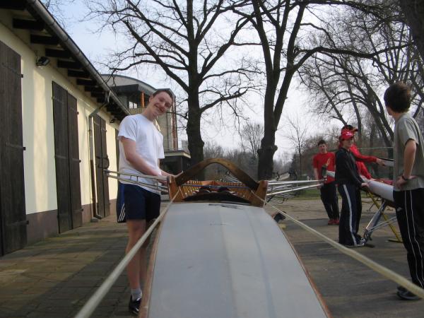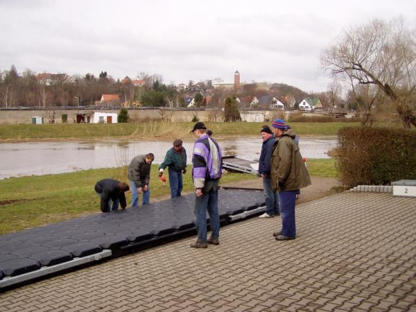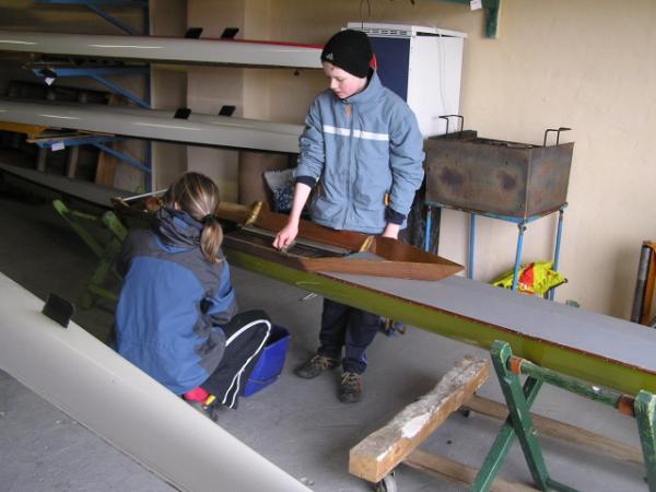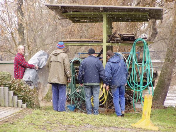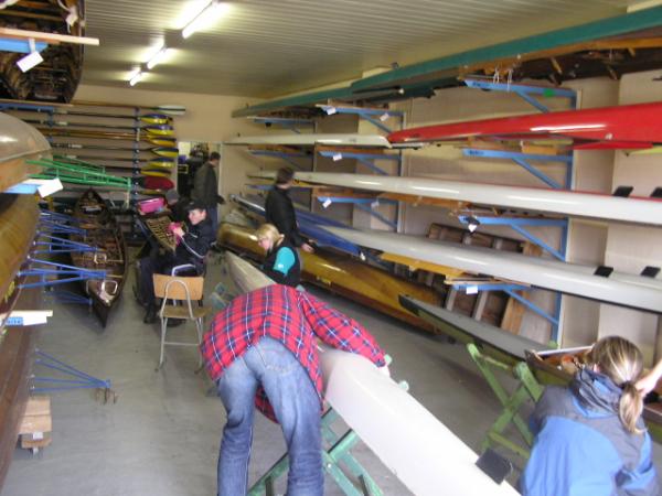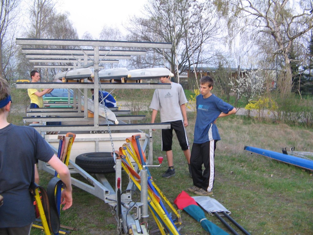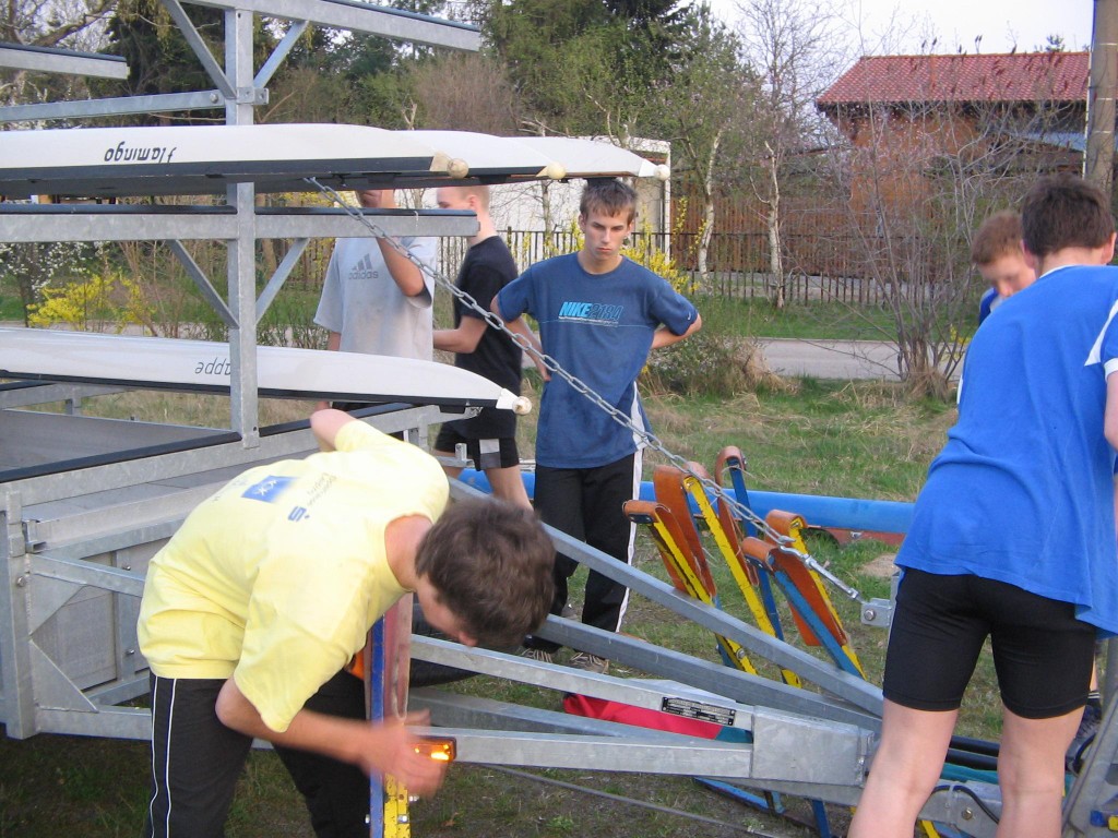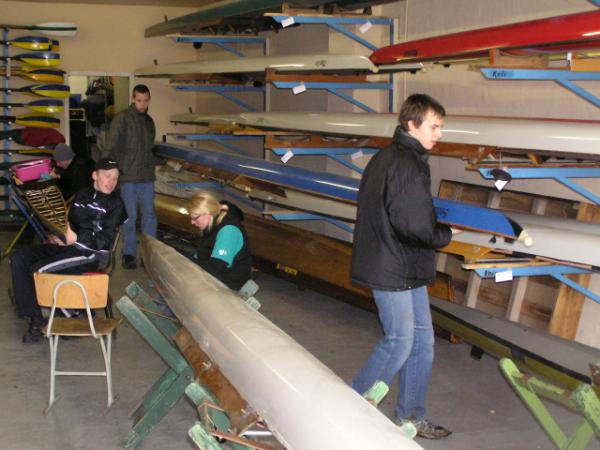 Alljährlich stand der große Arbeitseinsatz im Frühjahr an. Wieder fanden sich einige Vereinsmitglieder im Bootshaus ein um gemeinsam das Material in Ordnung zu bringen, das Gelände in Schuss zu halten und im Gebäude für Ornung zu sorgen. Hier seien einige der Tätigkeiten beschrieben: Andrea hat im Saal gewischt und überhaupt alles sauber gemacht, die Kitzings kümmerten sich mit Rainer in bewährter Weise um die Ruderboote. Carsten und Knut haben das Motorboot in Ordnung gebracht. Klaus, Scholle und Hartmut haben im Eingangsbereich die Bäume verschnitten. Frank, Herr Bellrich, Mario und Florian hakten Laub zusammen. Marie und Florian sowie Mario und Christian habe an den Rennbooten gearbeitet, wozu sich auch später noch Andrea gesellte. Der Steg wurde von Thomas in Ordnung gebracht. Gemeinsam wurde dieser dann zum Schutz vor dem hohen Wasser in höhere Hanglagen verbracht. Auch hinter dem Bootshaus wurde Laub gefegt und gekehrt, die Zeltkammer wurde aufgeräumt und der provisorische Bauzaun am einen Ende des Grundstücks wurde vorerst wieder abgebaut. Miachael hat "seine Spielwiese" ebenfalls von Laub und Naturresten befreit. Alles in allem war es ein ergiebiger Einsatz mit normaler Beteiligung.