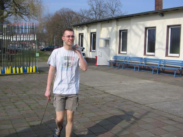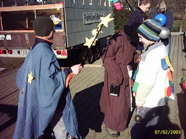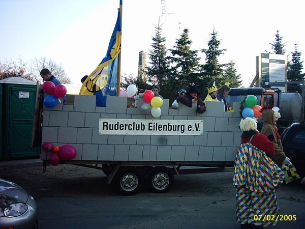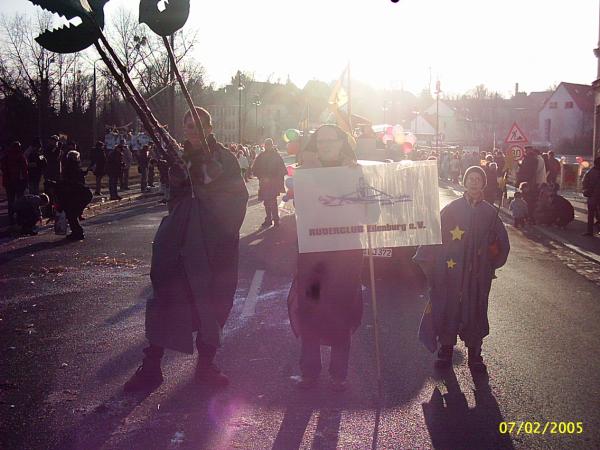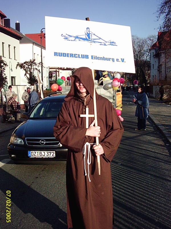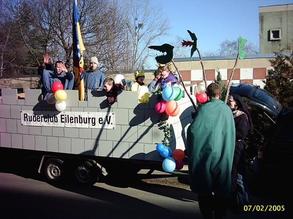 Es war ein sonniger Sonnabendvormittag, an dem wir uns, SEBASTIAN WEIßE, MARIO WINTER, FLORIAN BELLRICH, FLORIANS OPA und ich, im Bootshaus trafen, um den diesjährigen RoMo-Umzugswagen zu bauen. Thema in dieser Saison war: "Karneval am Fuße der Burg". Deshalb ähnelte der Wagen Sonntagnachmittag einer wehrhaften alten Burg mit Zinnen und Standarte des Landesherren (unsere stolze RCEFahne). Natürlich war der Weg zu diesem endgültigen Aussehen genauso steinig wie die Burgmauer selbst. Nach zweistündiger Verspätung rollte der Hänger, der freundlicherweise wieder von JÜRGEN DIETRICH zur Verfügung gestellt wurde, vor die Bootshalle. Grund waren Probleme beim Anbau des Geländers am Wagen – um diese zu beheben, hatte JÜRGEN DIETRICH einige Mühen und wir danken ihm herzlich, dass er auch dafür wieder viel Zeit geopfert hat. Weiterhin bereiteten uns die im Bootshaus vorhandenen Akkuschrauber Probleme, die trotz längerer Ladezeit schnell den Geist wieder aufgaben. Dank HERRN BELLRICH und seinem Werkzeug konnten die Arbeiten dann Sonnabendnachmittag jedoch zügig vorangehen. Am Abend stand das Grundgerüst des Wagens, sodass am darauf folgenden Tag nur noch die Malerarbeiten getätigt werden mussten. Das war dann kein Problem mehr. Am Montag, das Wetter war immer noch so bombastisch wie am Wochenende, ging es für alle Teilnehmer (11 Mannen und 2 Frauen) gegen 12 Uhr im Bootshaus los. Die Kostüme wurden angezogen, letzte Feinheiten am Umzugsgefährt wurden gerichtet und die Rittertruppe strebte gen Bürgerhaus, wo traditionell der Umzug begann. Bis dahin zog TILO PALM mit seinem Auto unseren Wagen, er wurde später MATTHIAS GROTH abgelöst. Nach ziemlich langer Wartezeit, welche unserer Startnummer zu verdanken war (der Nummer 78), rollten wir dann gemächlich über Anger und Leipziger Strasse Richtung Markt, wo die Menschenmassen am Strassenrand dem Umzug begeistert zujubelten. Die Atmosphäre brachte riesigen Spaß. Die Leute riefen mit uns zusammen den RCE Schlachtruf (Wer ihn noch nicht kennt: "RCE Jucheee!!!"). Als Dank gab es von uns einen kräftigen Kamelleregen. Durch das MDR-Bild sind wir wieder einmal gerade noch so durchgerollt - aber trotzdem war es ein gelungner Tag. Recht herzlichen Dank allen Teil17 nehmern, meiner Schwester ANDREA für die leckere Verpflegung und natürlich noch einmal allen Helfern. Auf ein Neues im nächsten, unserem Jubiläumsjahr, wo wir dem Umzug selbstverständlich nicht fern bleiben wollen. Ich wünsche mir, dass ein paar Mitglieder mehr mitmachen und darunter auch einige erwachsene Ruderer sind (Termin schon mal vormerken: 27.02.2006).