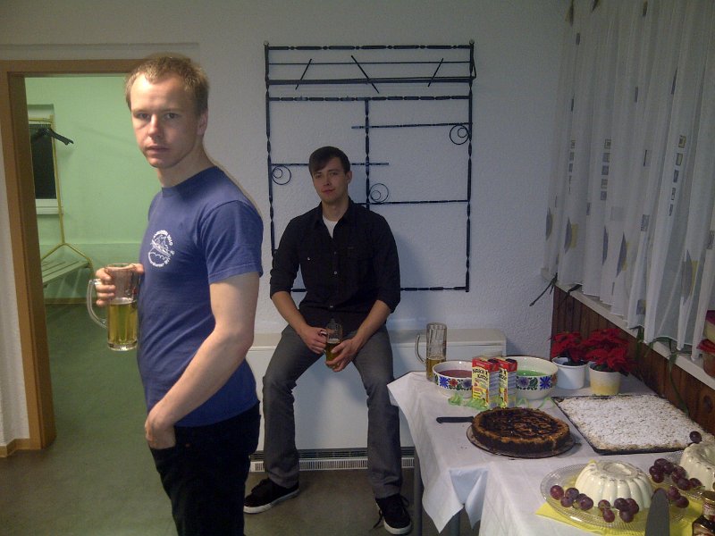 Um die Versorgung des leiblichen Wohls kümmerten sich dieses Mal Robert und Andrea. Es wurde selbstgemachte Knoblauch-Kräuterbutter und Paprika-Tomatenbutter mit frischem Brot der Bäckerei Holz gereicht. Für die herzhaftere Variante gab es frisches Schmalz vom Fleischer aus Glaucha. Robert hat frische Fladenbrote wahlweise mit Lachs/Ei oder Schinken/Käse zubereitet, sowie einem sehr leckerem Nudelsalat. Zu späterer Stunde konnten sich die Leckermäulchen noch an der selbstgefertigten Roten Grütze mit Vanillesoße erfreuen. Mario und Osse haben den ganzen Abend für uns leckere Cocktail gemixt.