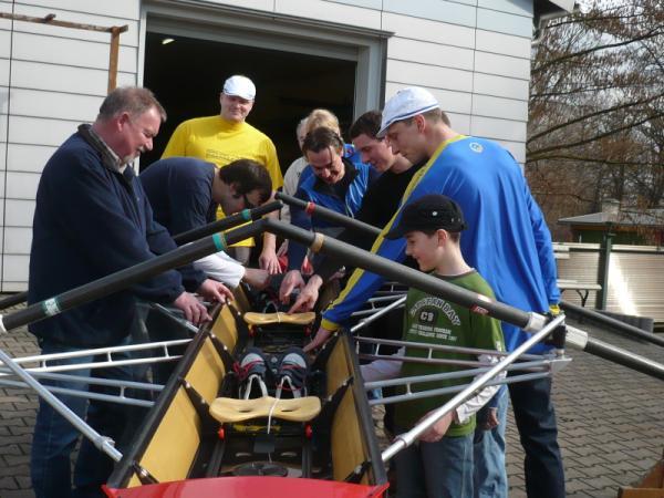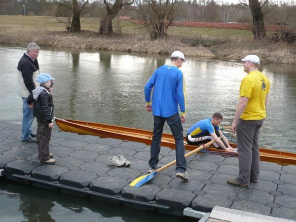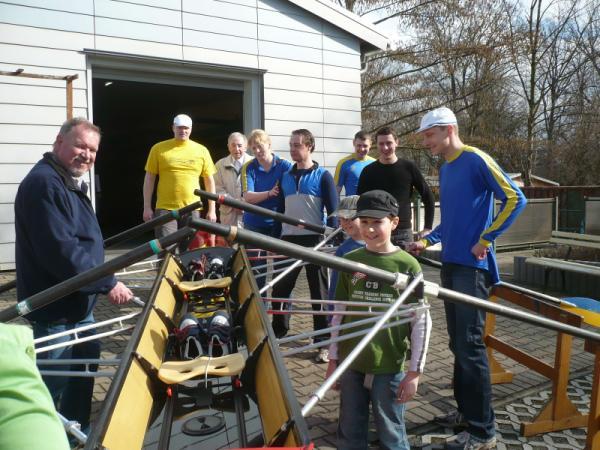 Der neue Zweier wird von den Mitgliedern des Eilenburger Ruderclubs begutachtet. Eilenburg. Erst die Arbeit dann das Vergnügen: Ruderclub-Chef Wilfrid Dippmann hätte es am Morgen nicht geglaubt. Pünktlich zum Beginn des Tags der offenen Tür am Bootshaus am Eilenburger Mühlgraben ließ sich die Sonne blicken. Am Vormittag mussten etwa 30 Ruderfreunde noch Boote durch den Regen schleppen, um sie dann für das Training im Sommer zur Kiesgrube zu fahren. Am kommenden Sonnabend steht im Bootshaus am Stadtpark das Anrudern bevor. Dazu wurde hier der Steg wieder angebracht.