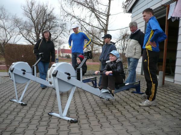 Und schließlich kam die erste Besucherfamilie um die Ecke spaziert. Yvonne und Mike Altmann mit Kinderwagen, in dem Baby Leila lag, und mit Töchterchen Gina Maxim, sechs Jahre jung, das neugierig blickte und sagte: „Ich will rudern.“ Das konnte Gina tatsächlich im Ruderbecken im Keller probieren. Torsten Sämel (23), seit 1997 Vereinsmitglied, erklärte ihr und ihrem Vater alles. „Hier ist der Bewegungsablauf natürlicher. Außerdem lässt sich die Koordination in der Mannschaft besser üben“, beschrieb er die Vorteile gegenüber dem Ergometer, mit dem sich wiederum die Kraft besser trainieren ließe.