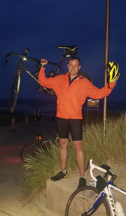 Die letzte Etappe – 55 km bis zum Ziel. Die Pause nutzte ich, um sämtliche Energie-Booster und Riegel, die mir verblieben waren, entweder aufzuessen oder mein Trikot damit zu bestücken. Die Wasserflaschen ein letztes Mal gefüllt, und es ging los. Die letzten 55 km auf der Insel Rügen. Auch hier kann ich mich an den genauen Ablauf nicht mehr groß erinnern. Wir haben einige Anstiege und nicht weniger schwierige schnelle Abfahrten bewältigt. Alle Teilnehmer wurden inklusive des Materials im letzten Drittel der Etappe von einer ca. 1,5 km langen Kopfsteinpflaster Straße noch mal auf das äußerste geprüft. Dann endlich nahte unser aller Ziel. Juliusruh, noch 9 km entfernt. Ja, ich wurde leicht emotional, da ich mir nun absolut sicher war, dass ich das Ziel erreichen werde. Ungefähr 18min später verlangsamte sich das Feld. Wir passierten den Ortseingang von Juliusruh. Ein toller Moment. Doch an dieser Stelle dachte ich nur: „Wo ist jetzt dieser verdammte Strand? - Ich will an den Strand!“