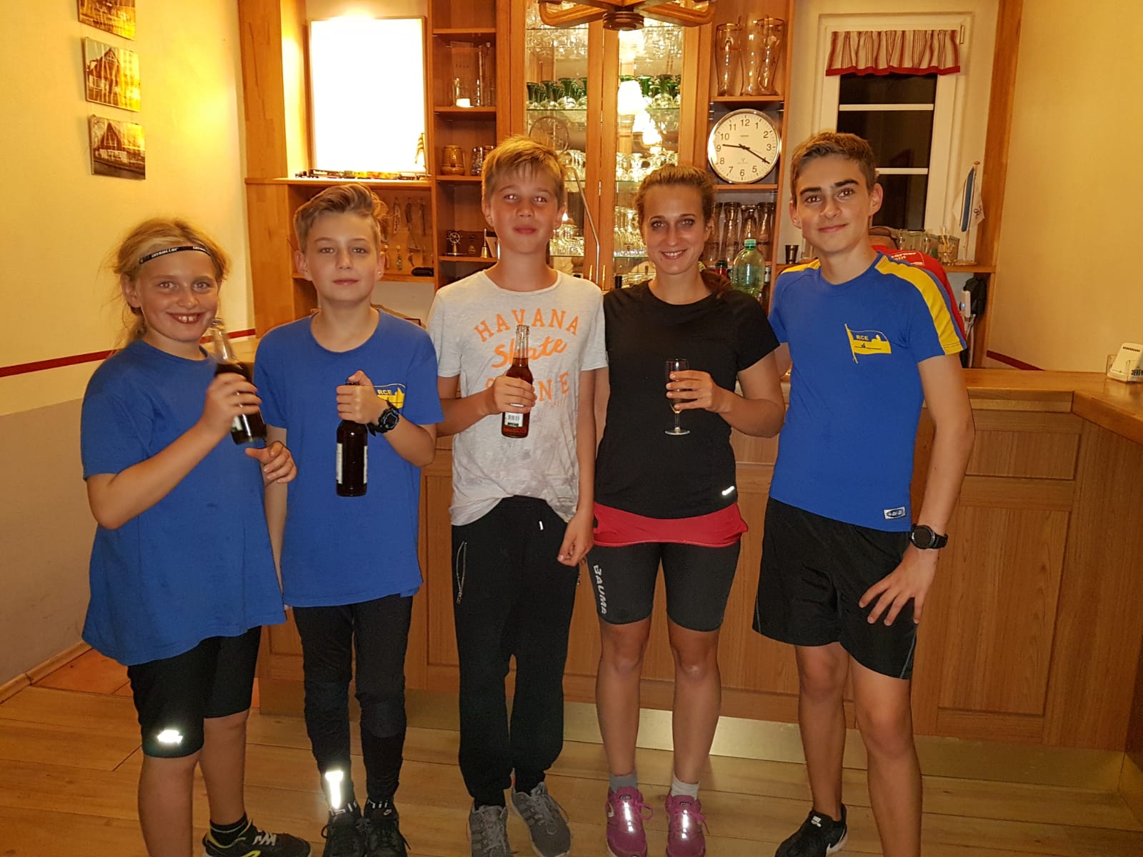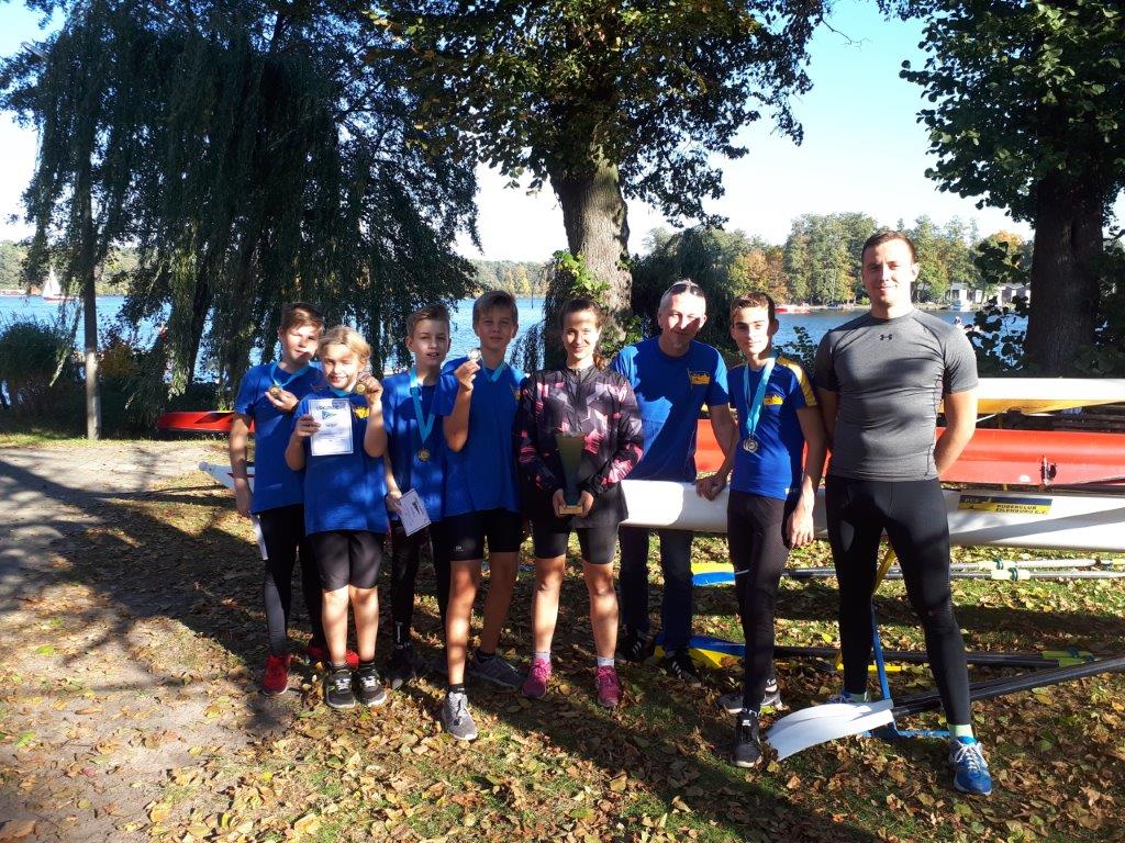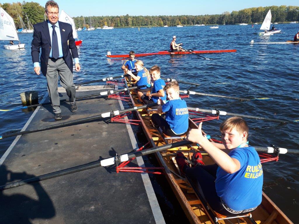 Nach der Mittagspause stand dann der Anfängervierer auf dem Plan. Mit einem geborgten Boot von Riho, welches meine alte Kindergruppe noch für meine Anfänger auf Vordermann brachten, ruderten die vier Kleinen; Paul B. , Luis V., Hannes L., und Paul L. mit Jonas P. als Steuermann auf den ersten Platz. Es war ein Start-und-Ziel-Sieg. Glücklich und zufrieden und stolz kamen die Jungs mit ihren Medaillen und Urkunden zurück, wo ich schon zum Anstoßen mit Brause auf die Jungs wartete. Jonas blieb leider keine Zeit zum Feiern, da er noch seinen leichten Einer vor sich hatte und aus dem Boot zur Erwärmung musste. In einem spannenden Rennen konnte er sich durchsetzen und erkämpfte auch den ersten Platz.