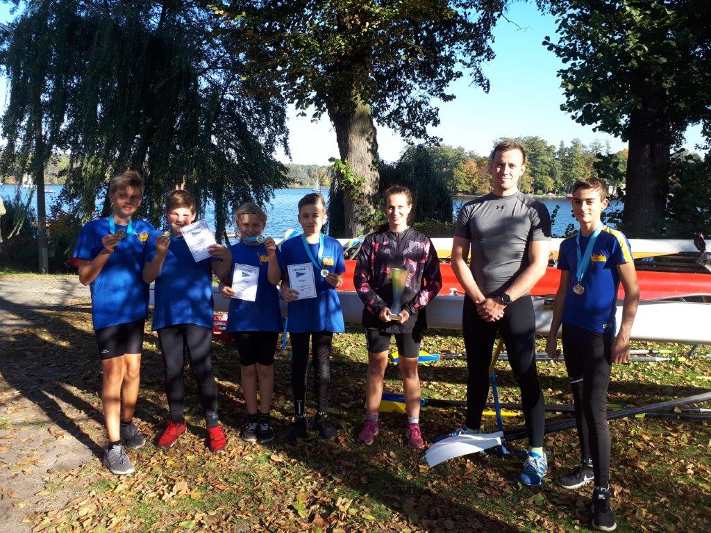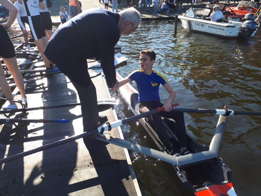 Nach dem Frühstück luden wir erstmal unsere Boote ab und machten sie fahrbereit. Das erste Rennen war um 11:15 Uhr. Der Jungs 2x 11/12 Jahre. Hier starteten Hannes und Luis im Serval. Da Paul Kieselstein noch kurz zuvor verletzt worden war, musste Paul Brendel in Renngemeinschaft mit einem aus Jessys Trainingsgruppe (Riho) fahren. Da war die Aufregung noch umso größer. Beide Boote erreichten einen souveränen 4. Platz. Den Serval übernahmen dann Jonas und Georg. Letzterer ist auch ein Sportler aus der Berliner Trainingsgruppe. Obwohl beide noch nie zuvor zusammen gerudert haben, erkämpften sie sich in ihrer Altersklasse 13/14 J. einen sehr guten 3. Platz.