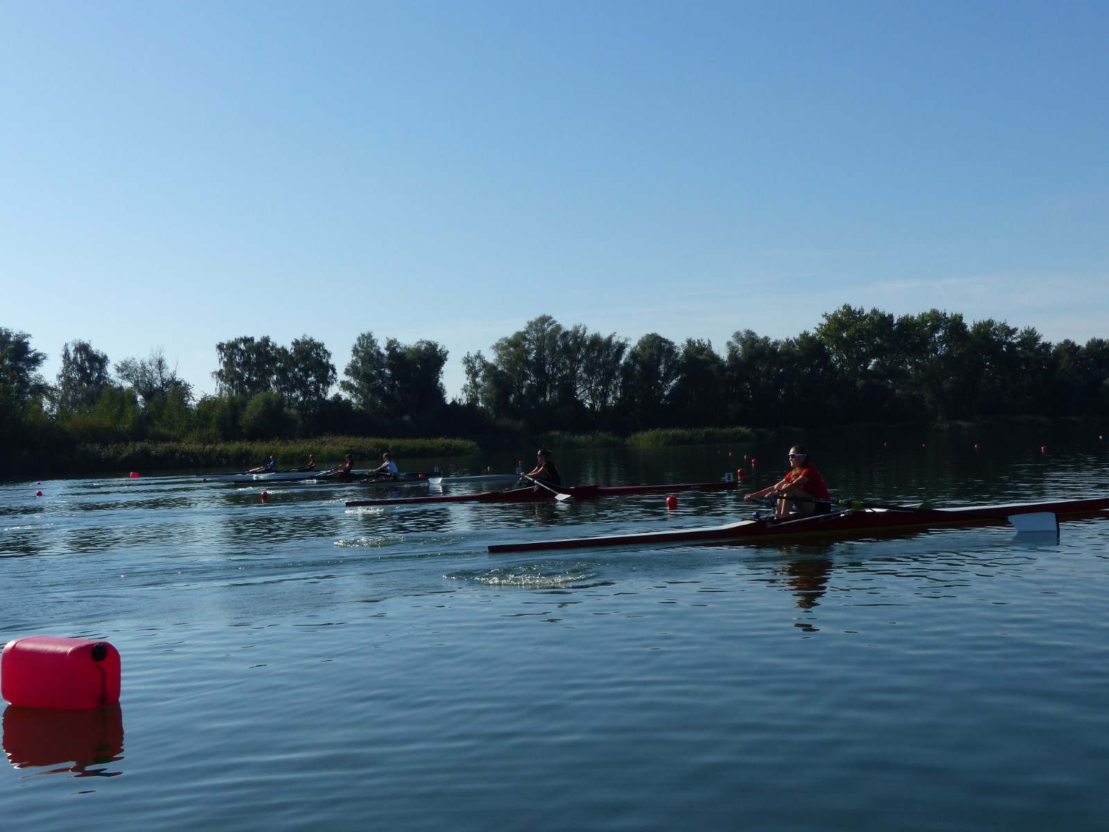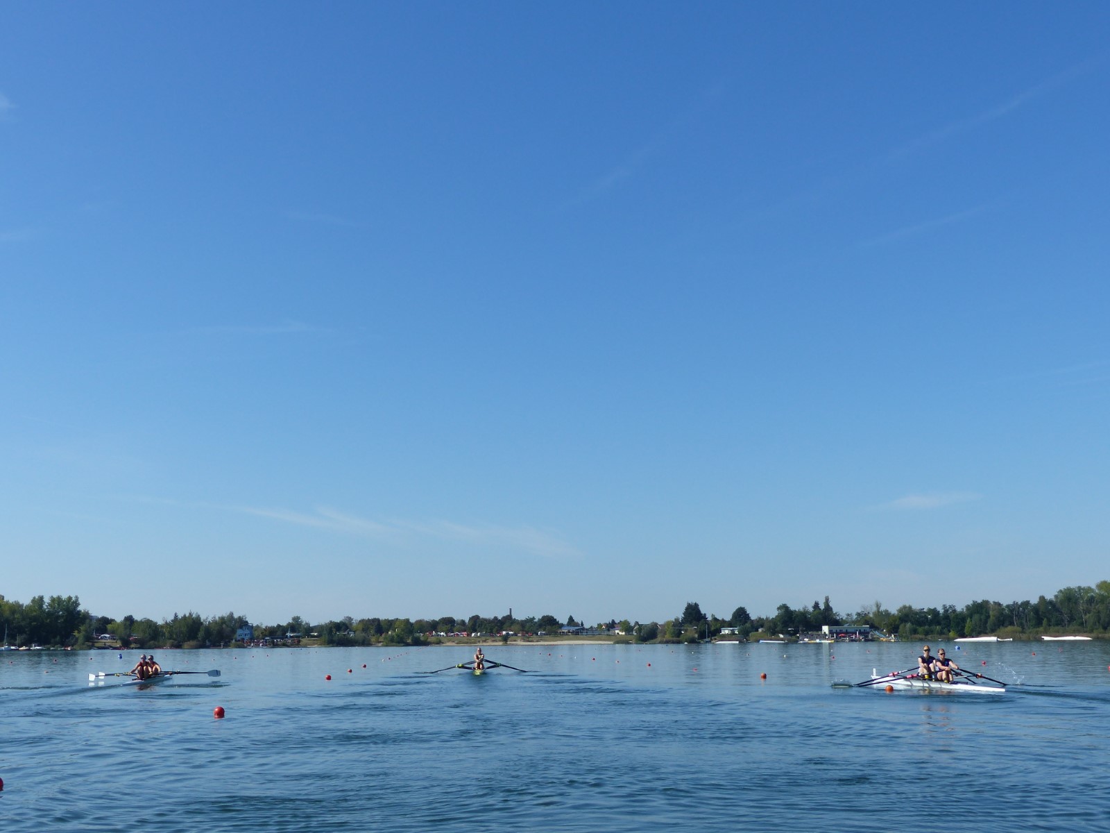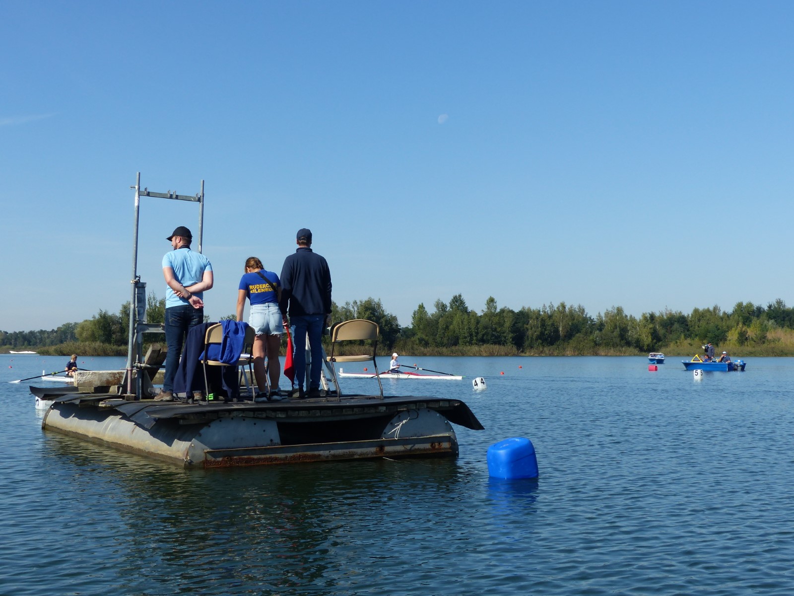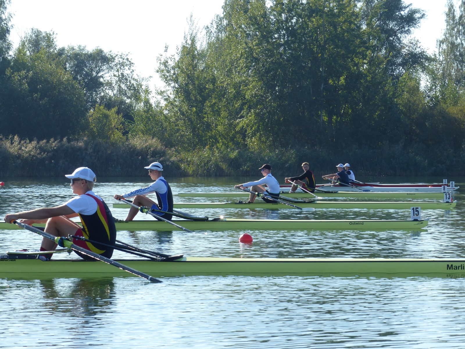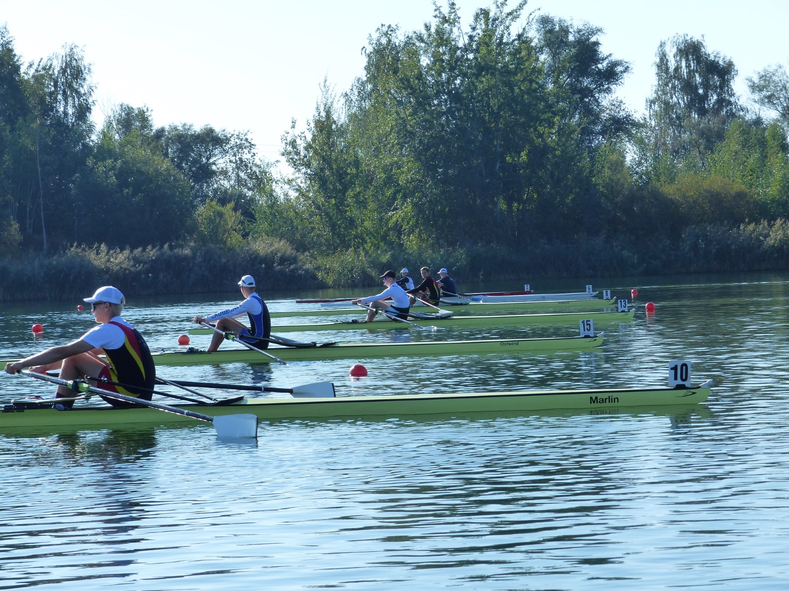 Eine Woche vorher, beim Aufbau der 6-Bahnen-Strecke, sorgte noch heftiger Seitenwind für erschwerte Bedingungen. Am Regatta-Samstag schob eine leichte Ostbrise die Boote schneller über die Distanz und sorgte vor allem im Zielbereich für einige Wellen. Mit etwas Routine waren diese problemlos zu meistern. Nur wenige Rudernde mussten von der Wasserwacht aus dem noch wohltemperierten Kiesgrubenwasser gezogen werden.