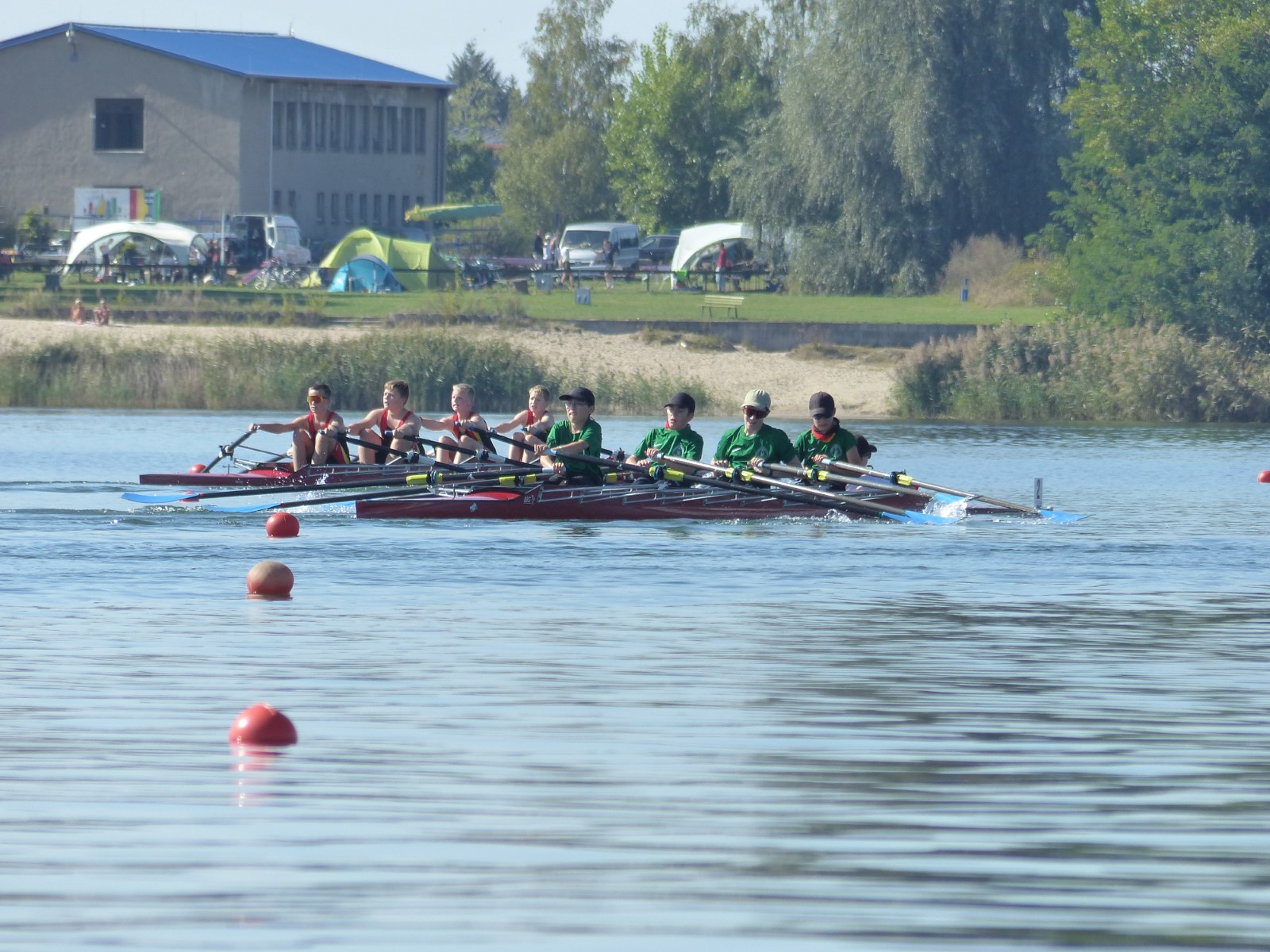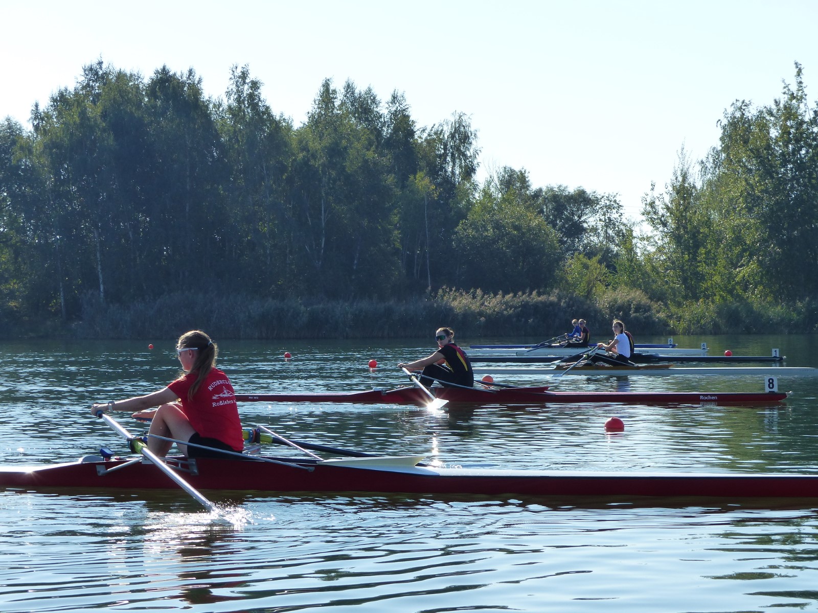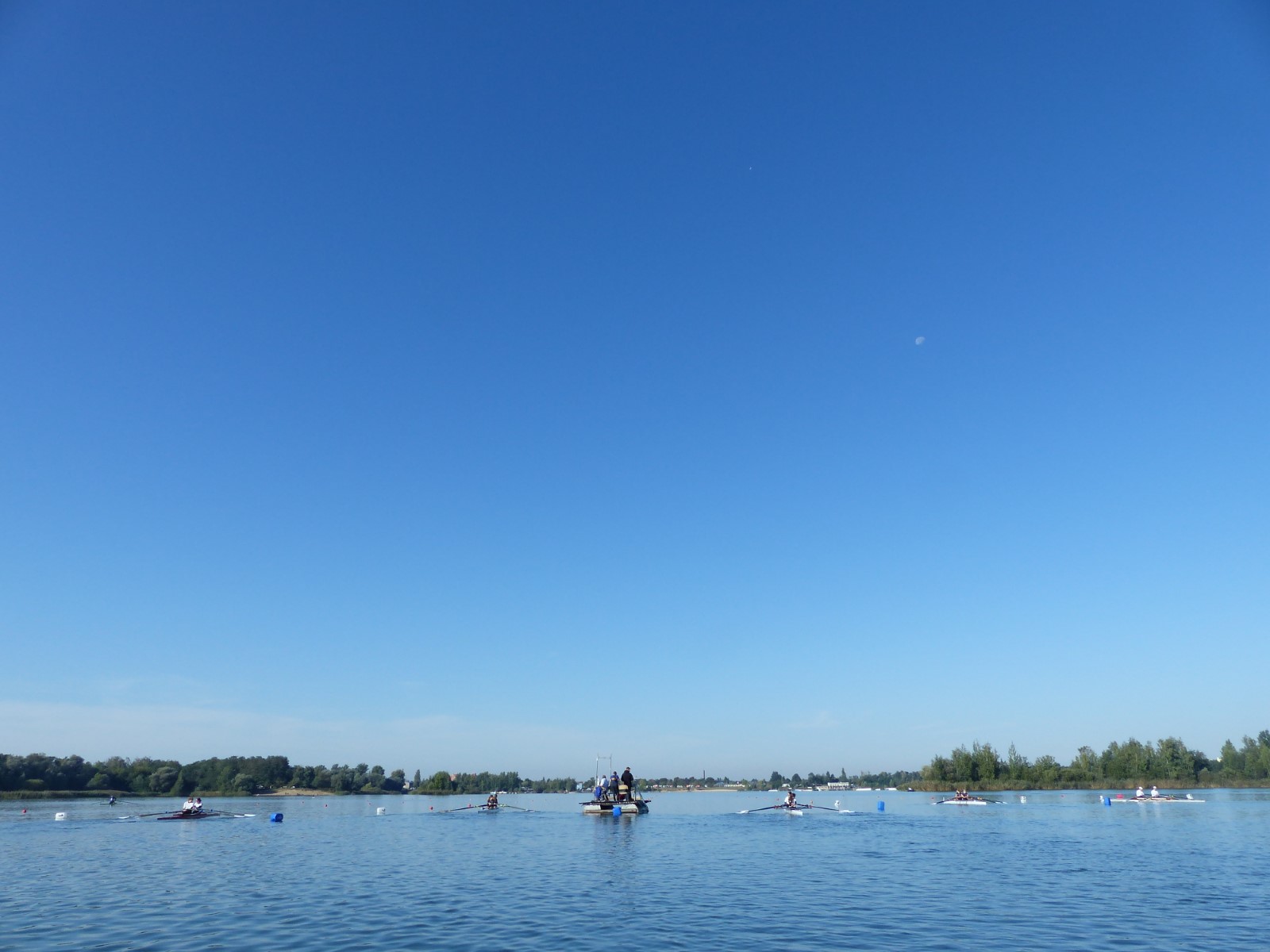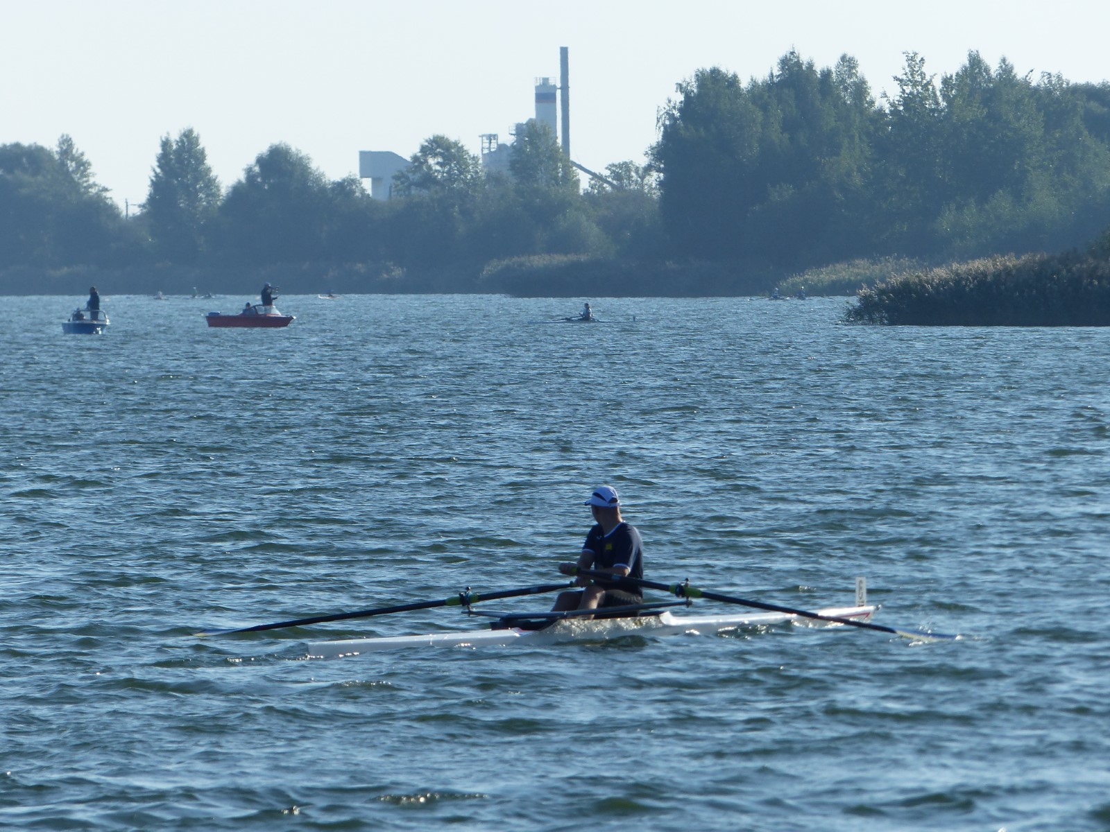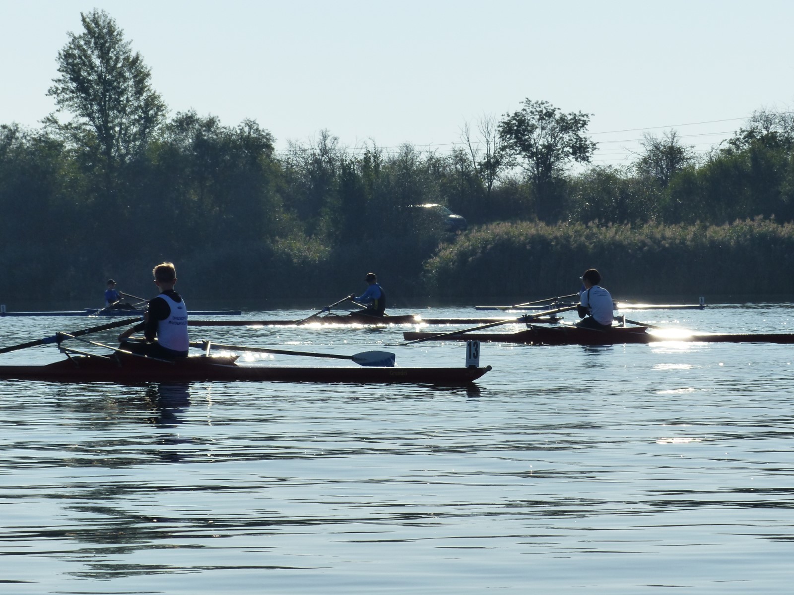 Eine Woche vorher, beim Aufbau der 6-Bahnen-Strecke, sorgte noch heftiger Seitenwind für erschwerte Bedingungen. Am Regatta-Samstag schob eine leichte Ostbrise die Boote schneller über die Distanz und sorgte vor allem im Zielbereich für einige Wellen. Mit etwas Routine waren diese problemlos zu meistern. Nur wenige Rudernde mussten von der Wasserwacht aus dem noch wohltemperierten Kiesgrubenwasser gezogen werden.