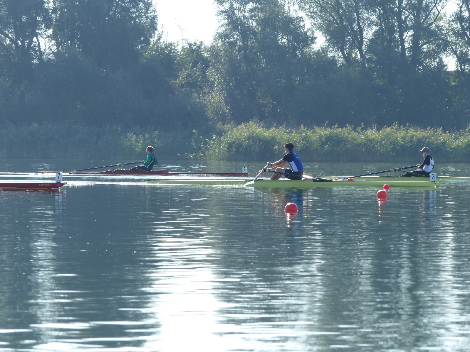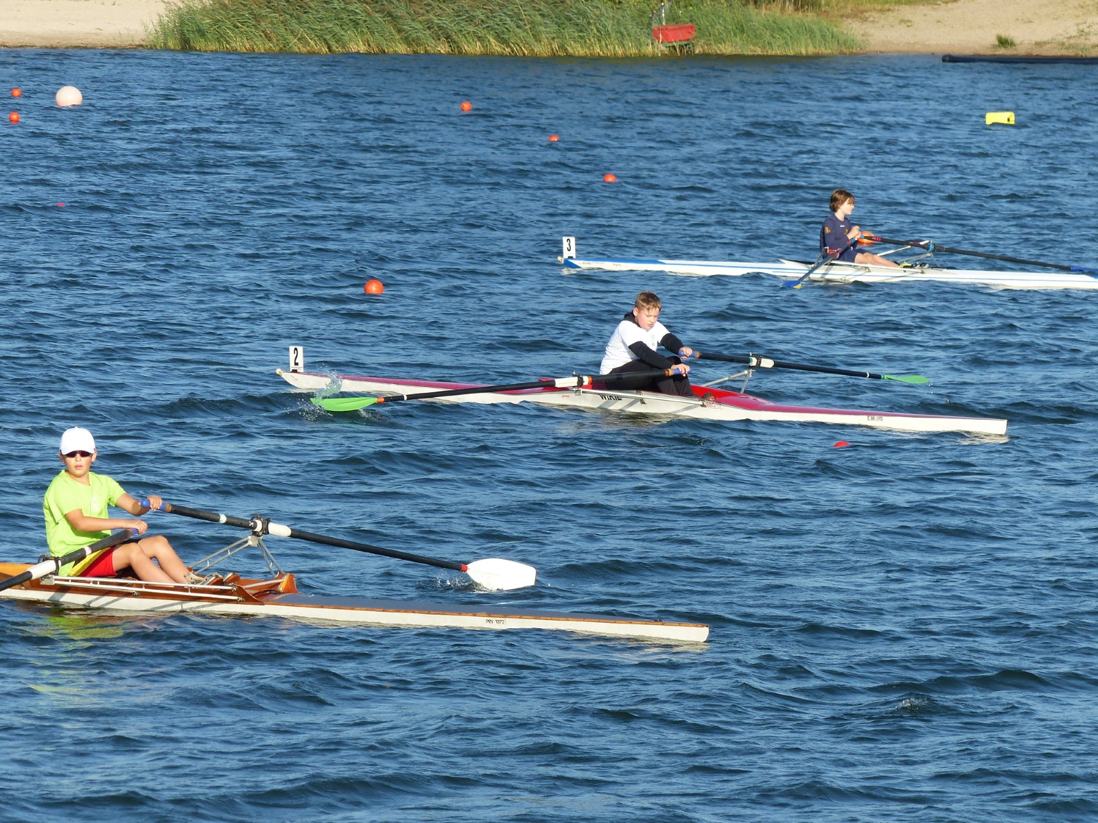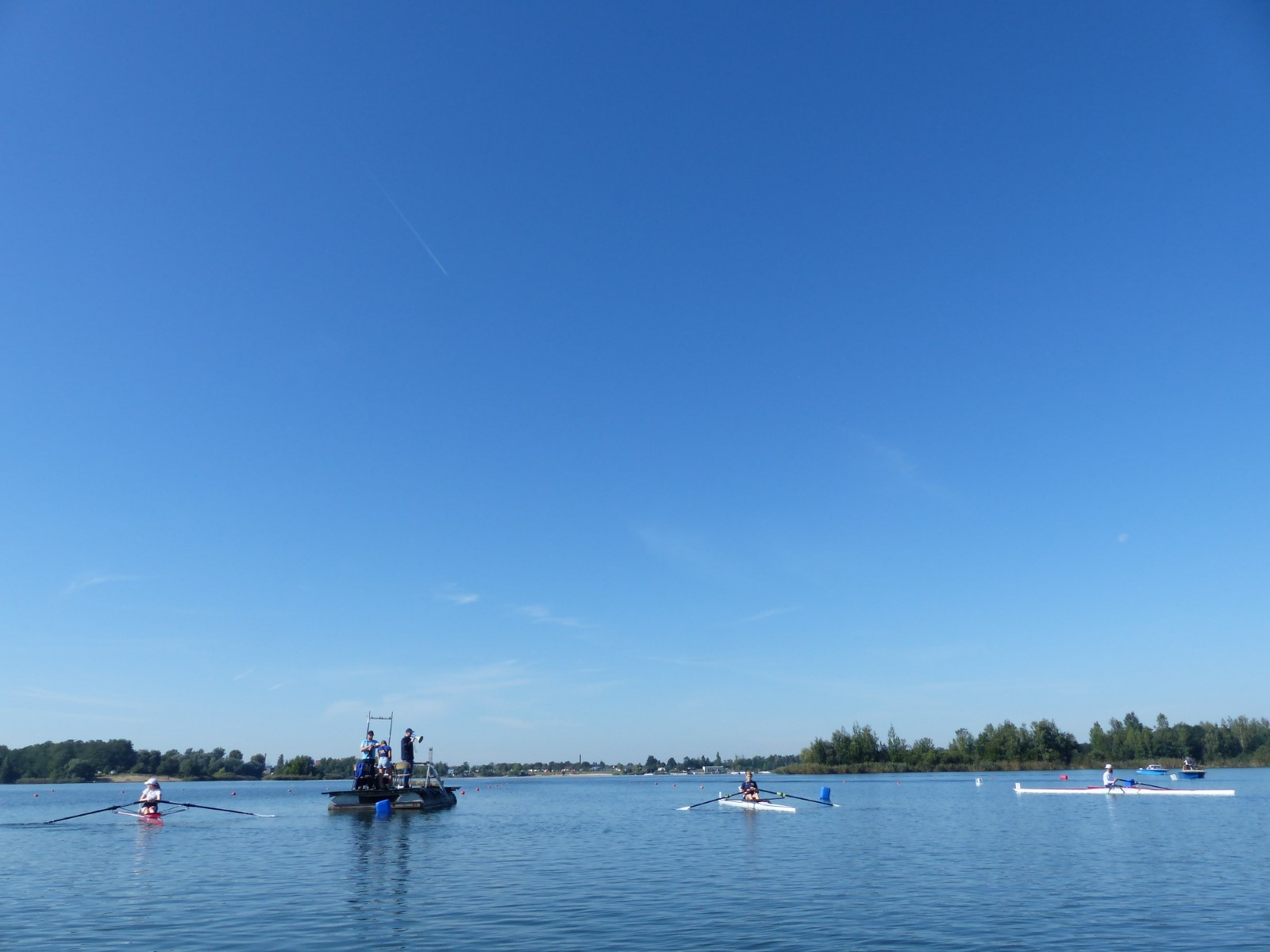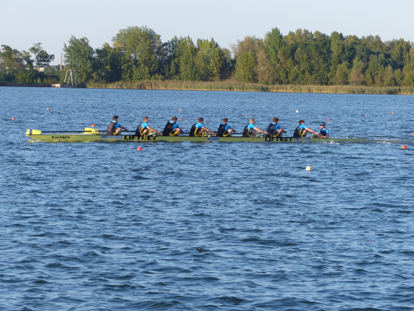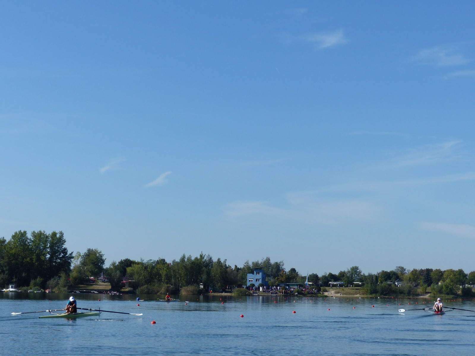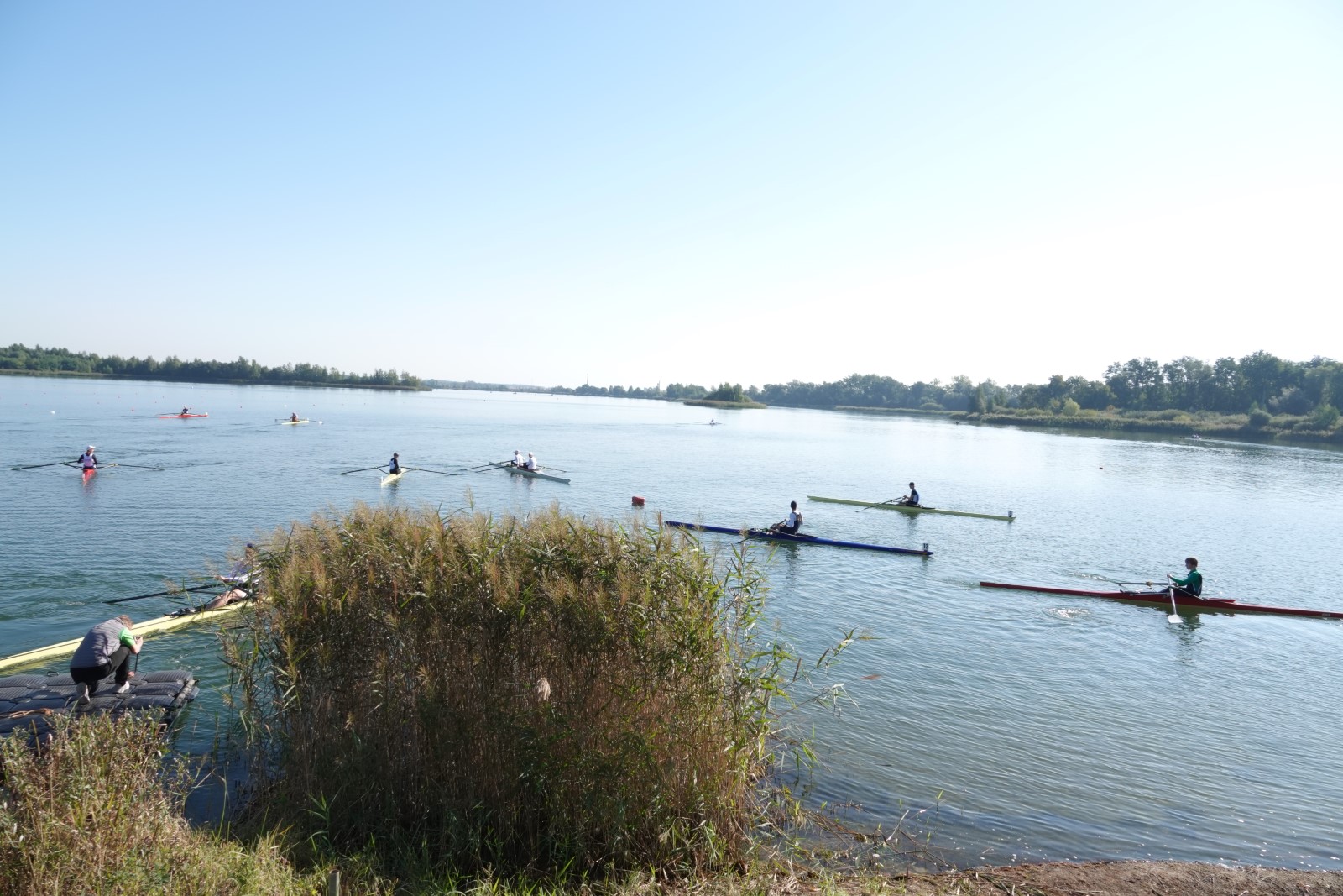 Eine Woche vorher, beim Aufbau der 6-Bahnen-Strecke, sorgte noch heftiger Seitenwind für erschwerte Bedingungen. Am Regatta-Samstag schob eine leichte Ostbrise die Boote schneller über die Distanz und sorgte vor allem im Zielbereich für einige Wellen. Mit etwas Routine waren diese problemlos zu meistern. Nur wenige Rudernde mussten von der Wasserwacht aus dem noch wohltemperierten Kiesgrubenwasser gezogen werden.
