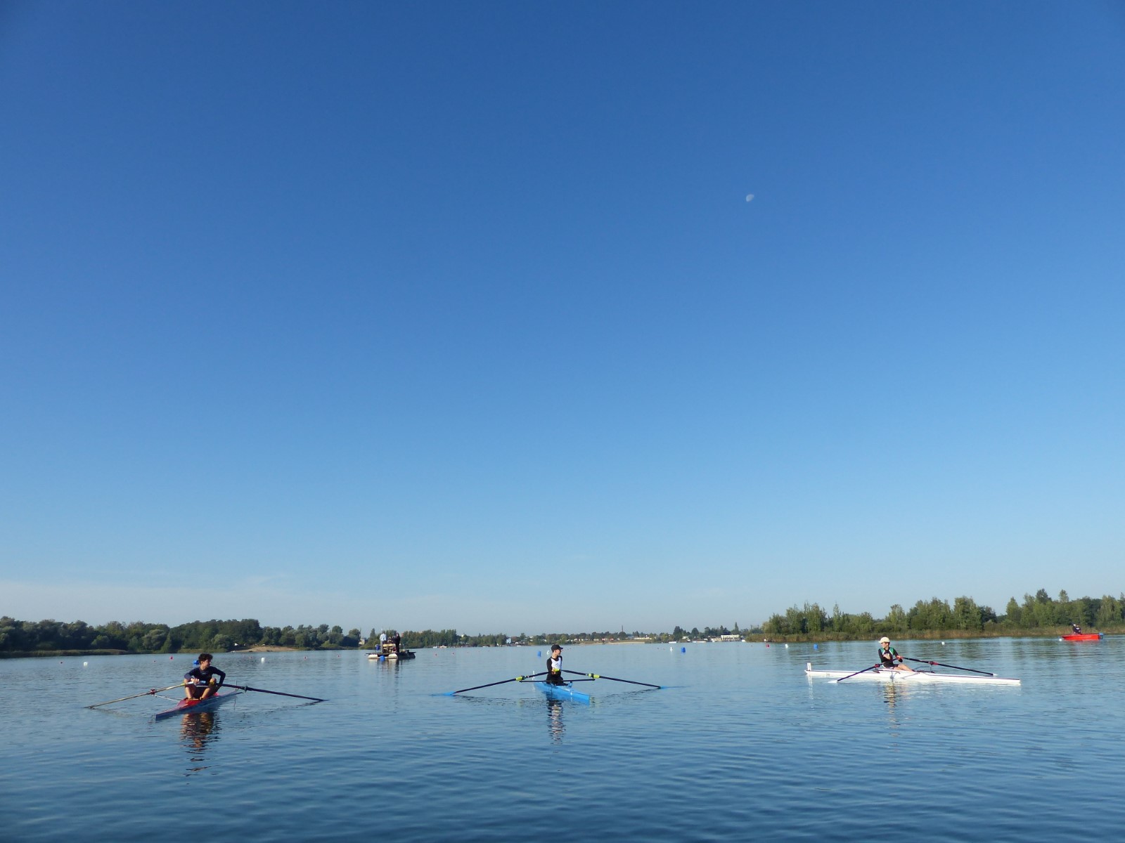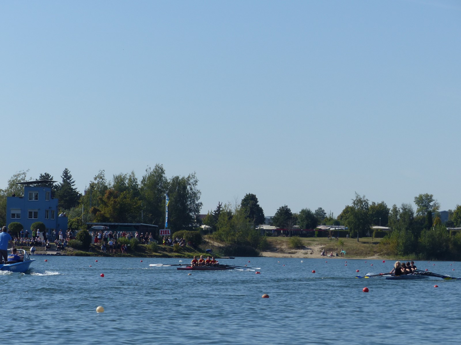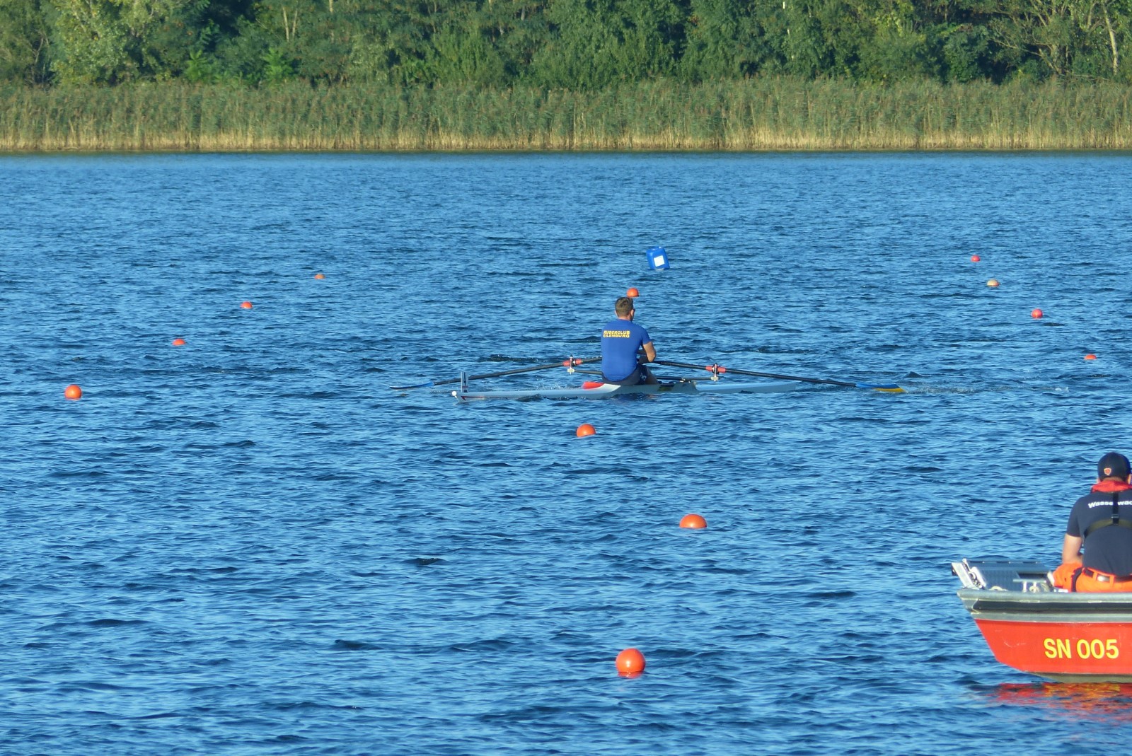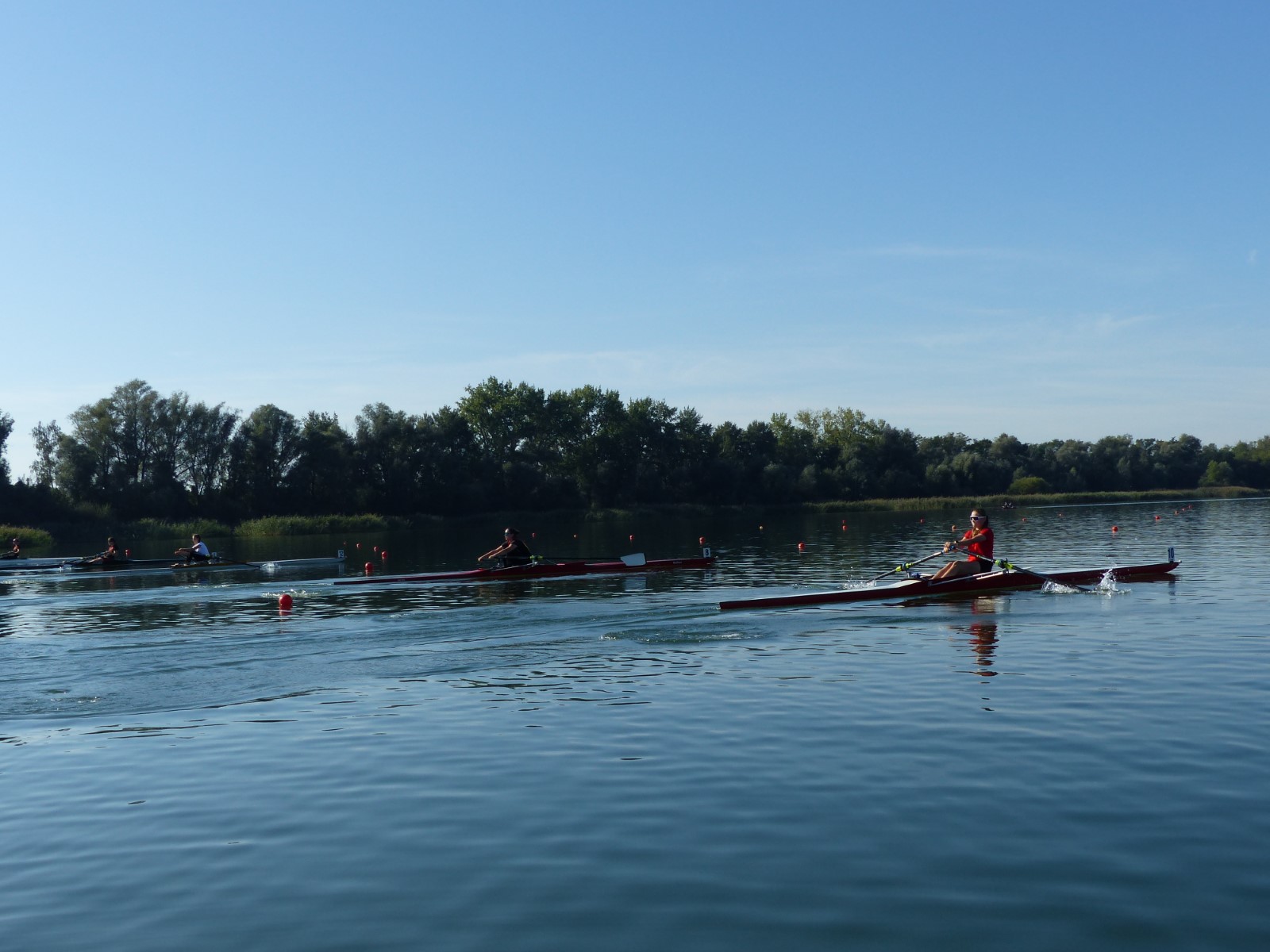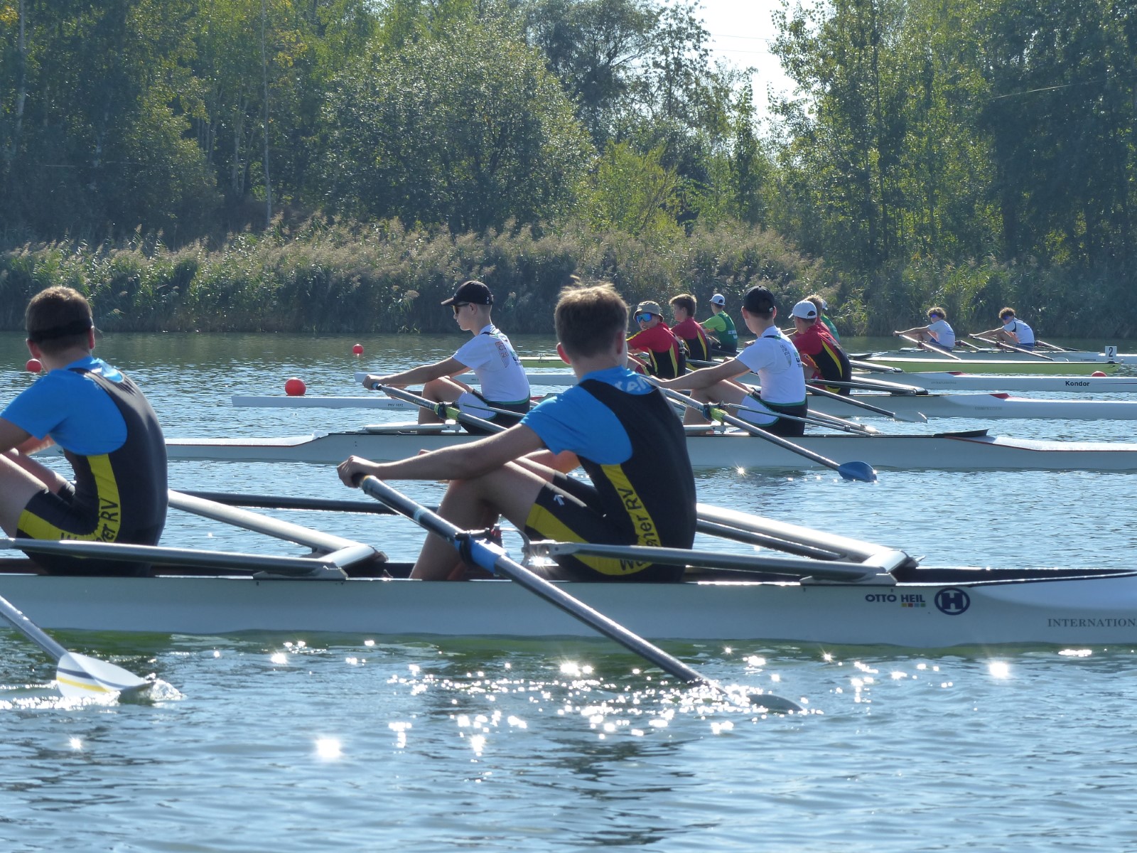 Eine Woche vorher, beim Aufbau der 6-Bahnen-Strecke, sorgte noch heftiger Seitenwind für erschwerte Bedingungen. Am Regatta-Samstag schob eine leichte Ostbrise die Boote schneller über die Distanz und sorgte vor allem im Zielbereich für einige Wellen. Mit etwas Routine waren diese problemlos zu meistern. Nur wenige Rudernde mussten von der Wasserwacht aus dem noch wohltemperierten Kiesgrubenwasser gezogen werden.