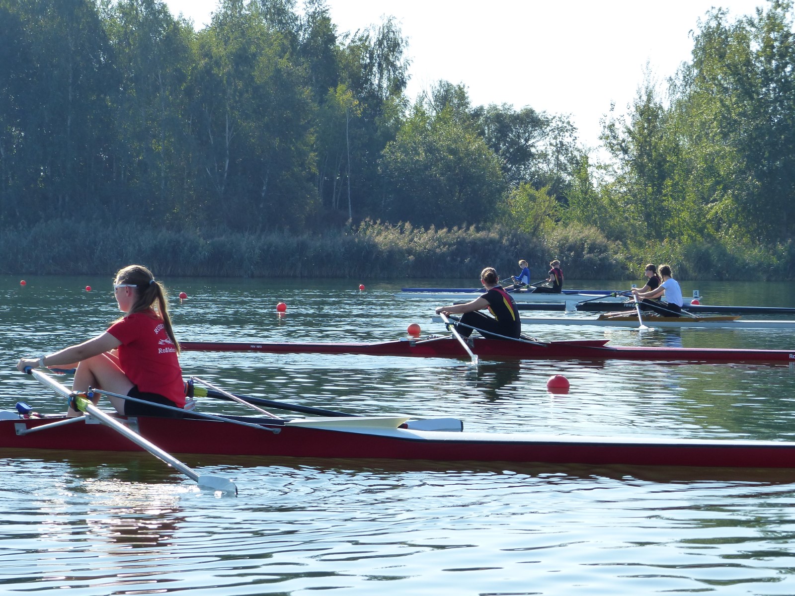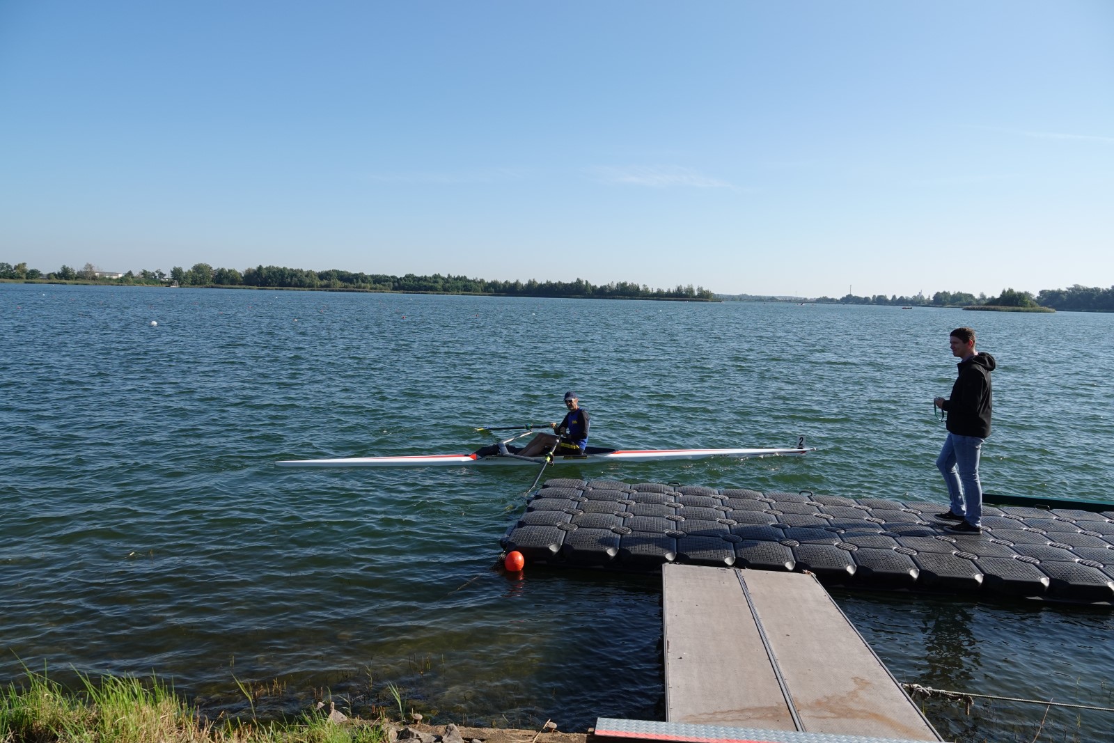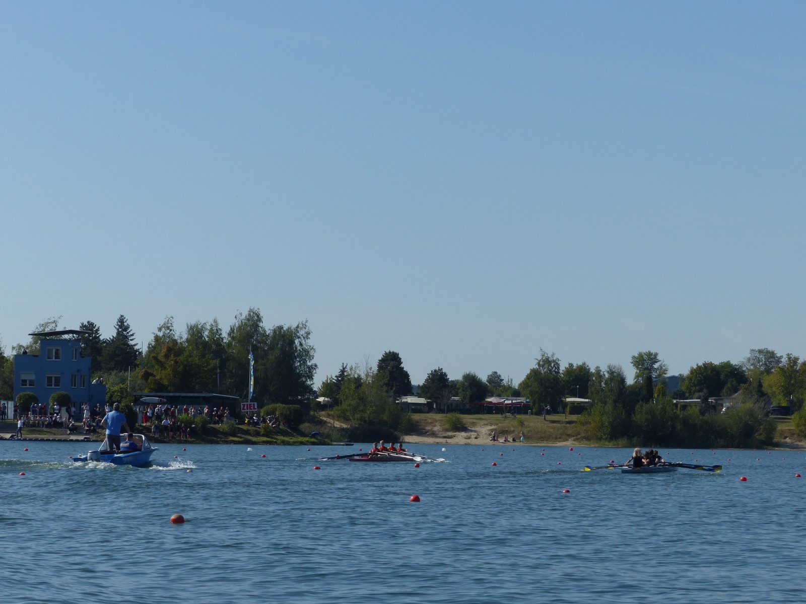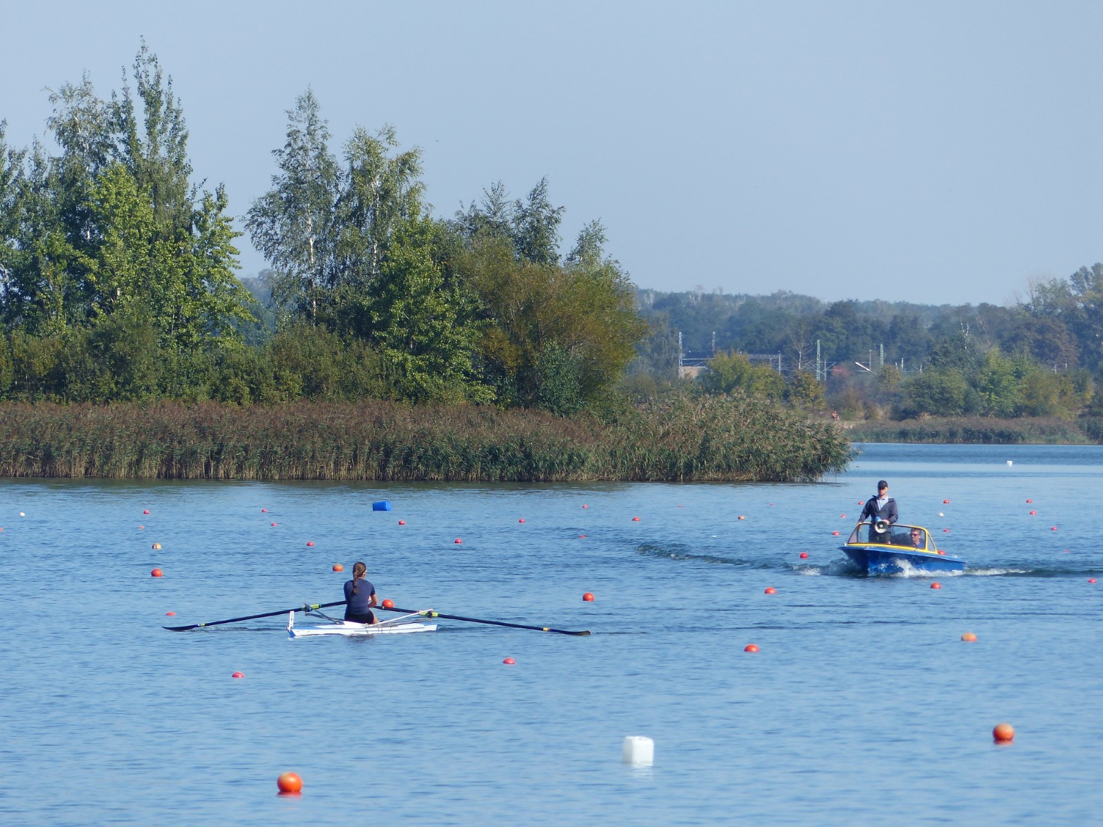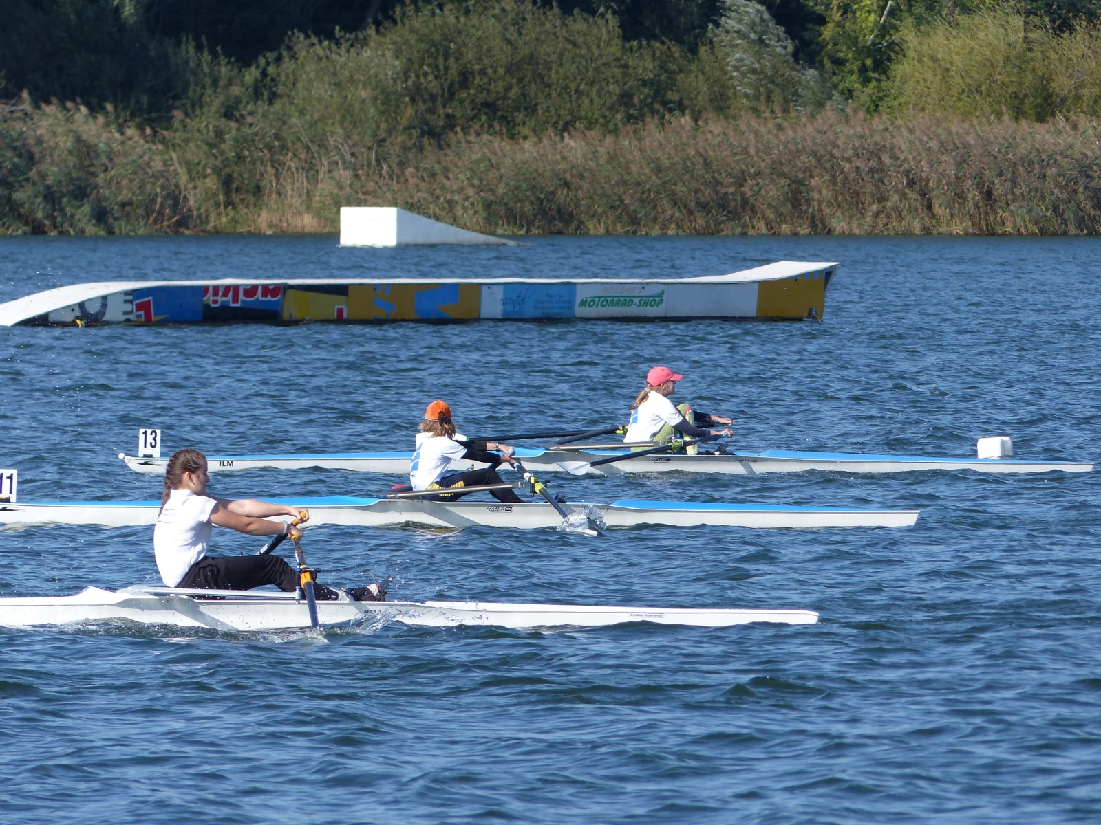 Eine Woche vorher, beim Aufbau der 6-Bahnen-Strecke, sorgte noch heftiger Seitenwind für erschwerte Bedingungen. Am Regatta-Samstag schob eine leichte Ostbrise die Boote schneller über die Distanz und sorgte vor allem im Zielbereich für einige Wellen. Mit etwas Routine waren diese problemlos zu meistern. Nur wenige Rudernde mussten von der Wasserwacht aus dem noch wohltemperierten Kiesgrubenwasser gezogen werden.
