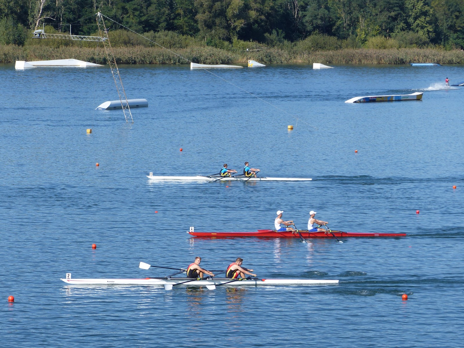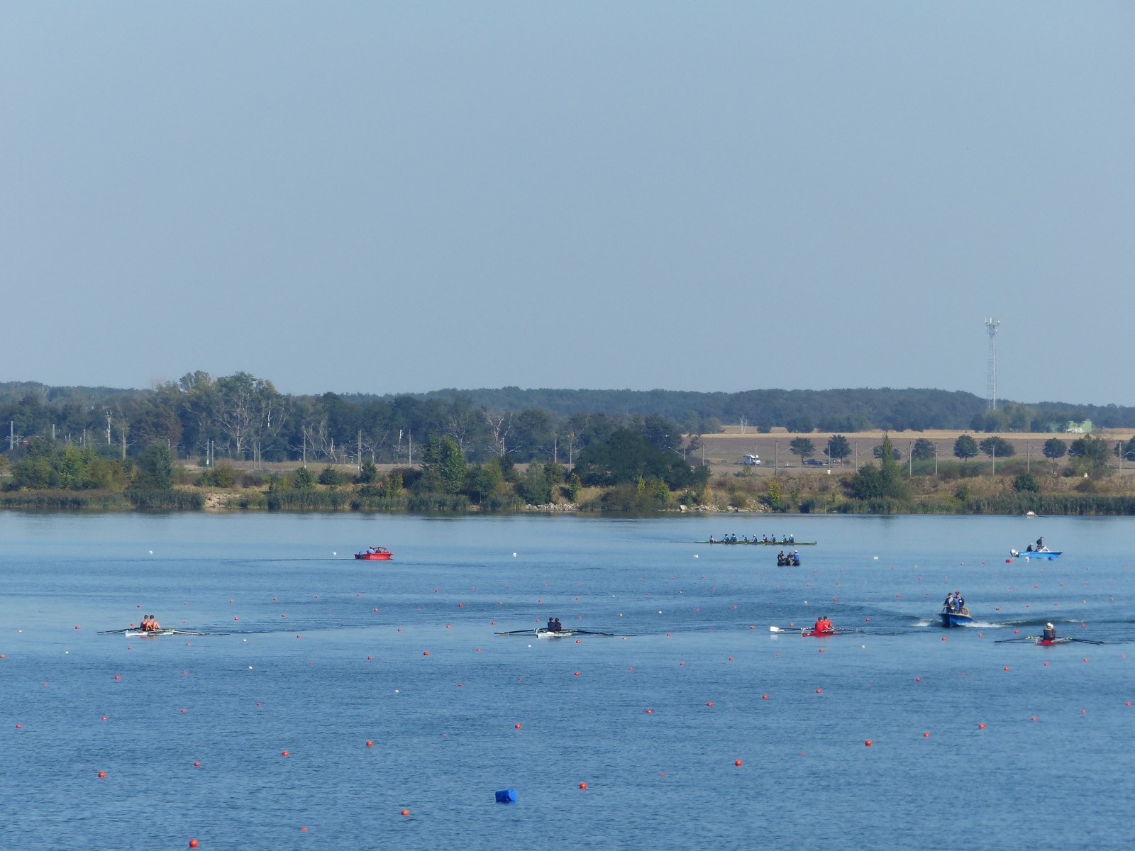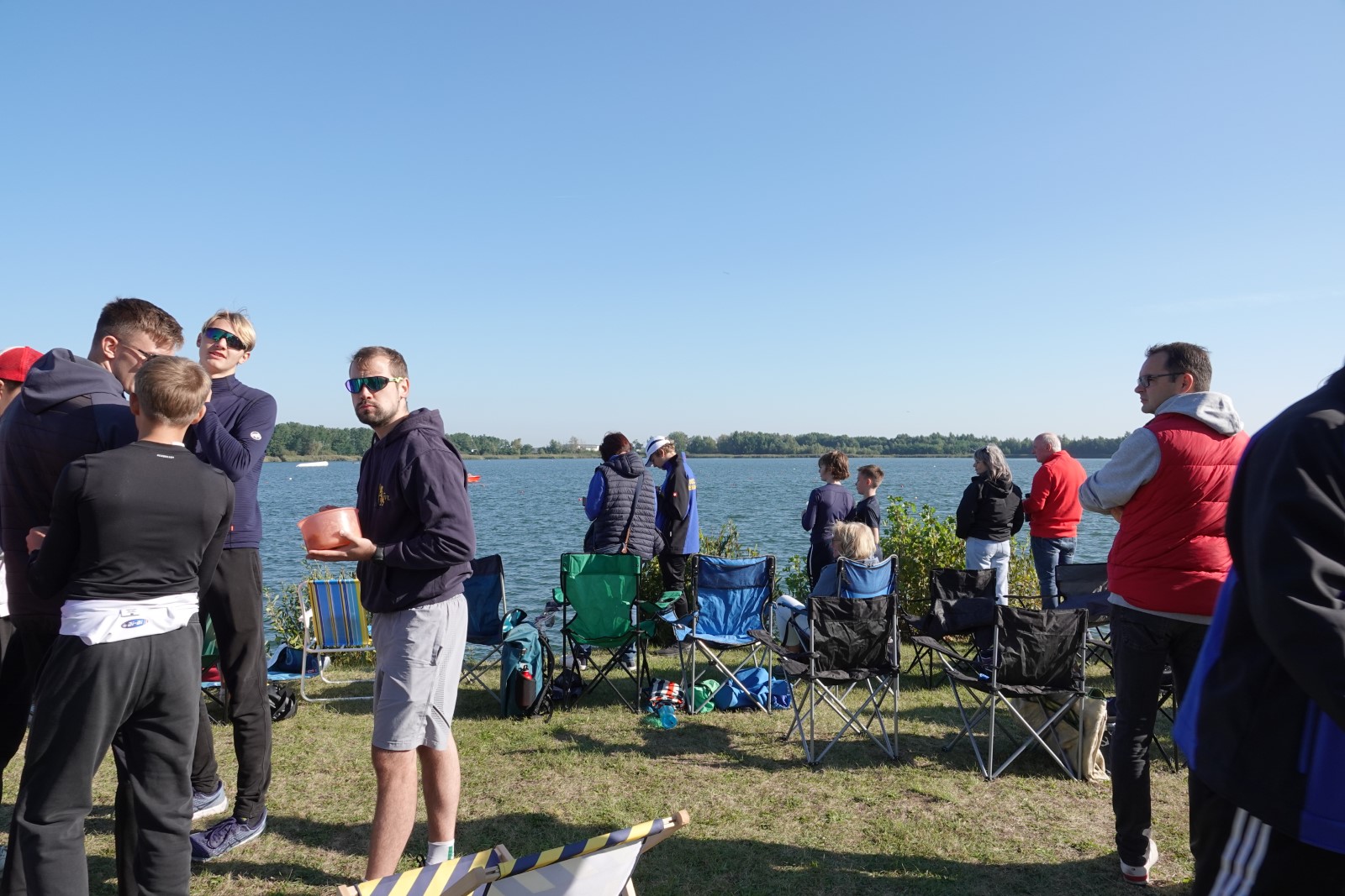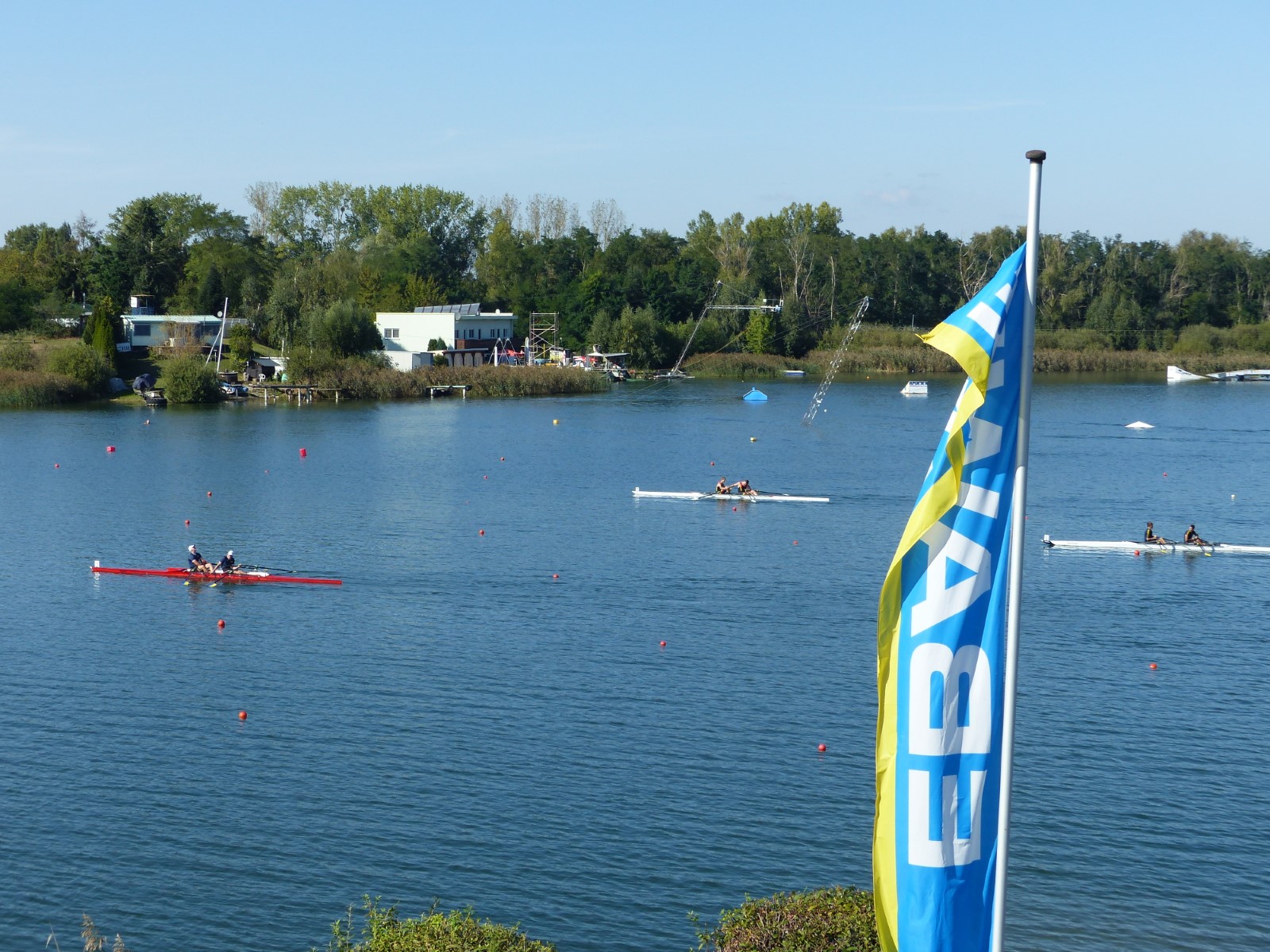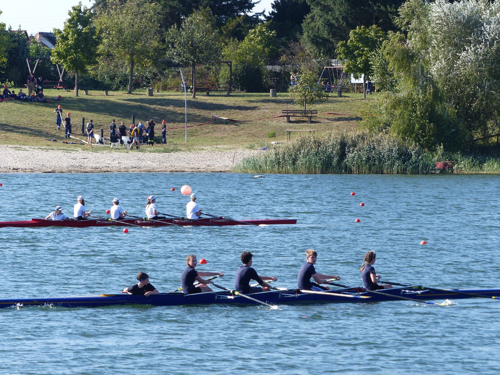 Eine Woche vorher, beim Aufbau der 6-Bahnen-Strecke, sorgte noch heftiger Seitenwind für erschwerte Bedingungen. Am Regatta-Samstag schob eine leichte Ostbrise die Boote schneller über die Distanz und sorgte vor allem im Zielbereich für einige Wellen. Mit etwas Routine waren diese problemlos zu meistern. Nur wenige Rudernde mussten von der Wasserwacht aus dem noch wohltemperierten Kiesgrubenwasser gezogen werden.