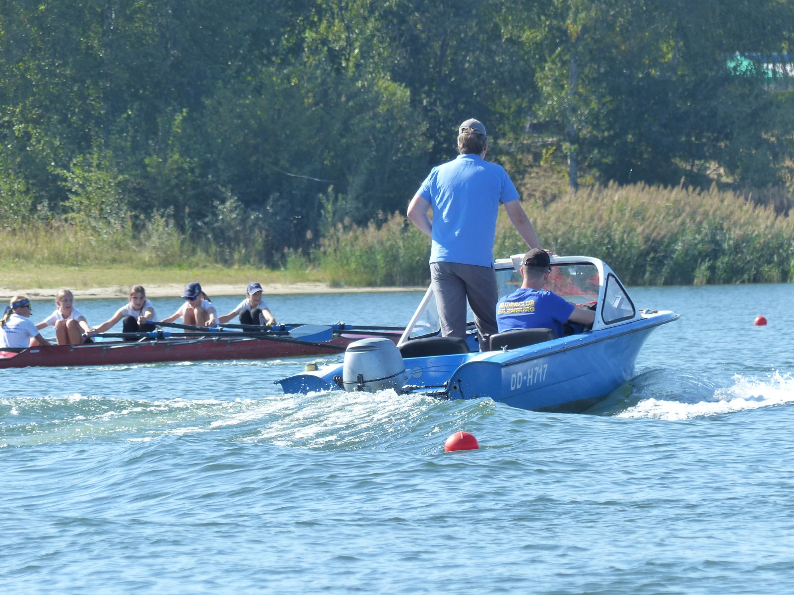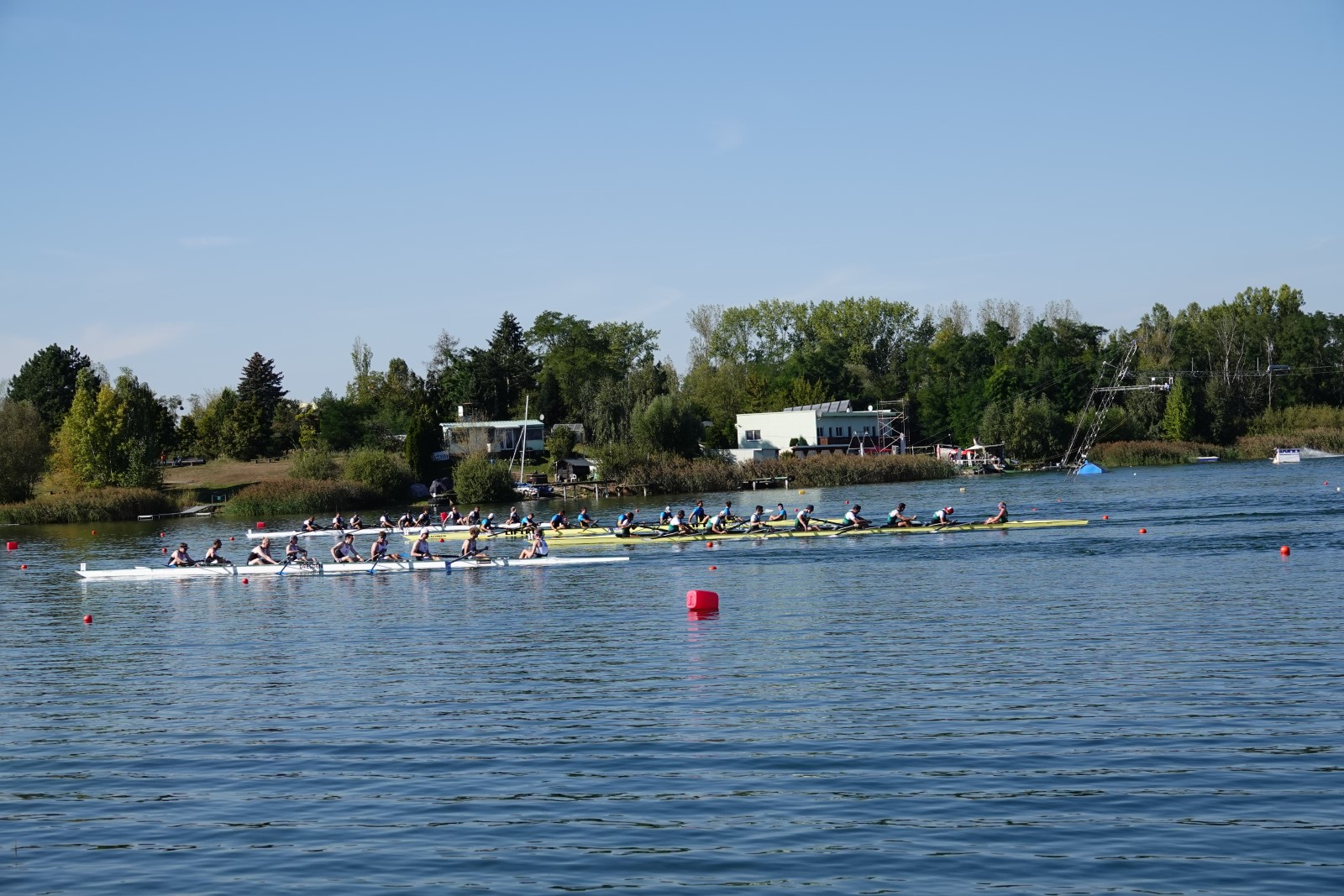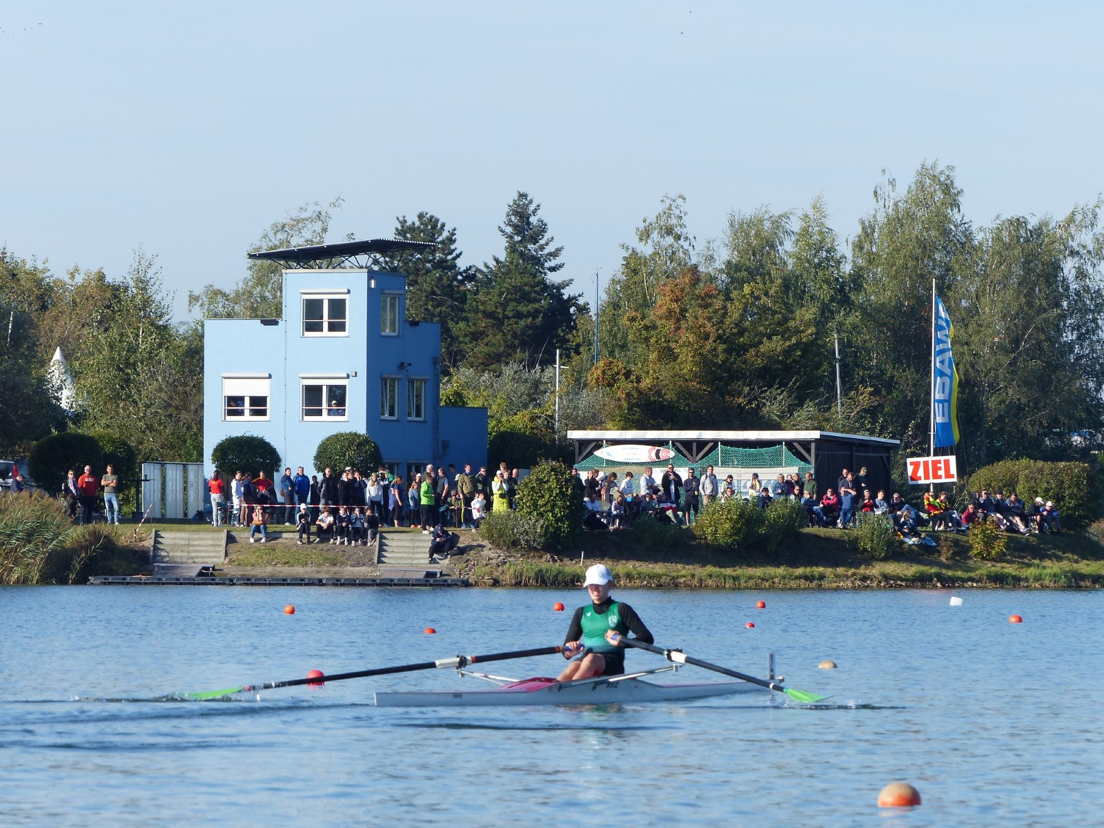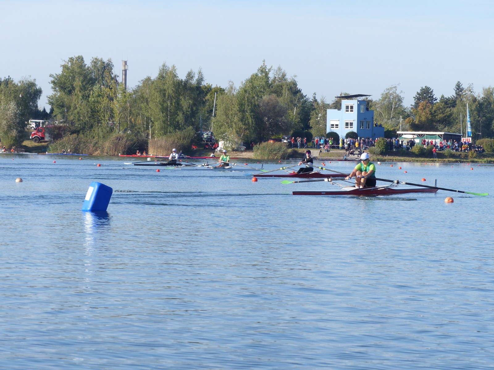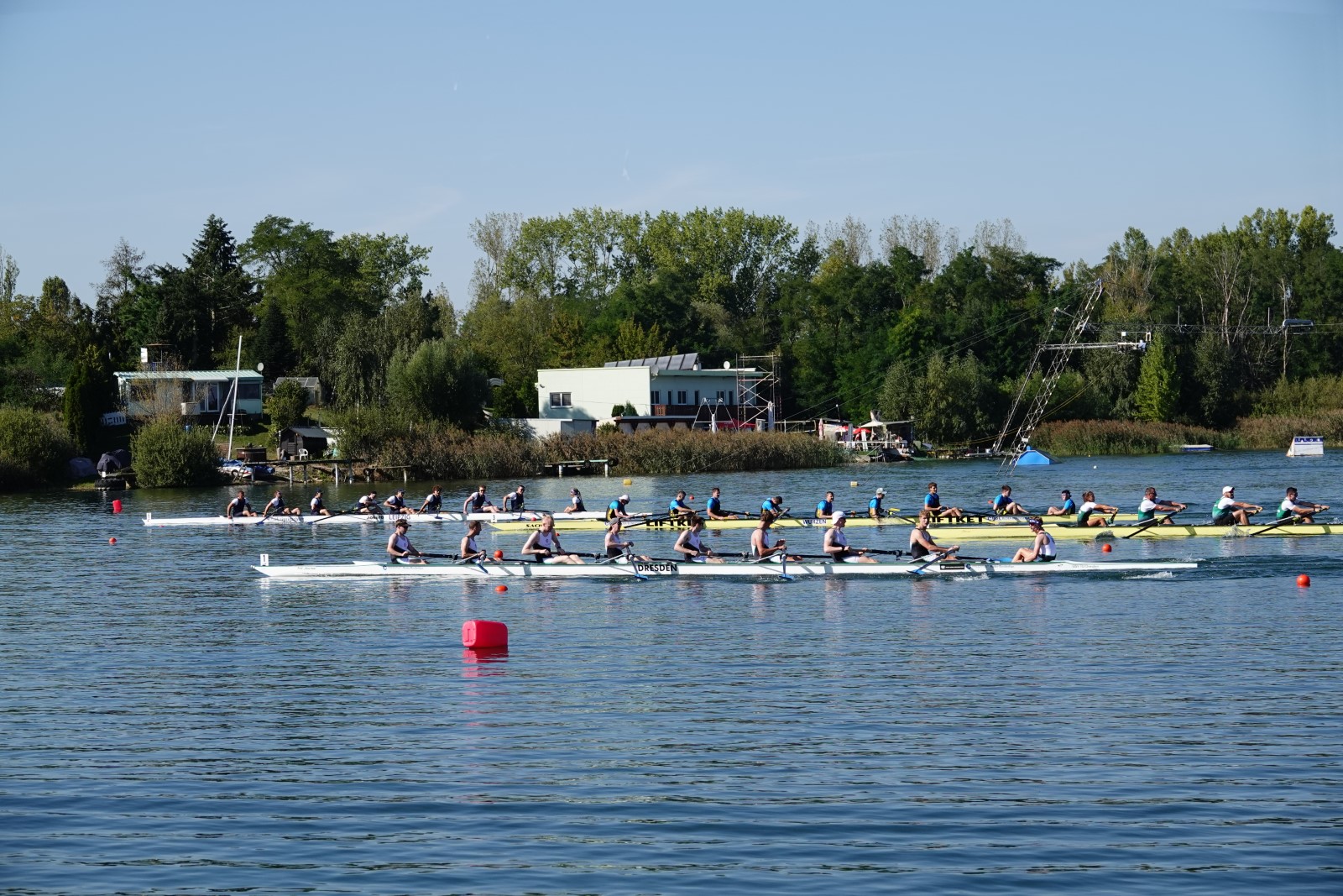 Eine Woche vorher, beim Aufbau der 6-Bahnen-Strecke, sorgte noch heftiger Seitenwind für erschwerte Bedingungen. Am Regatta-Samstag schob eine leichte Ostbrise die Boote schneller über die Distanz und sorgte vor allem im Zielbereich für einige Wellen. Mit etwas Routine waren diese problemlos zu meistern. Nur wenige Rudernde mussten von der Wasserwacht aus dem noch wohltemperierten Kiesgrubenwasser gezogen werden.