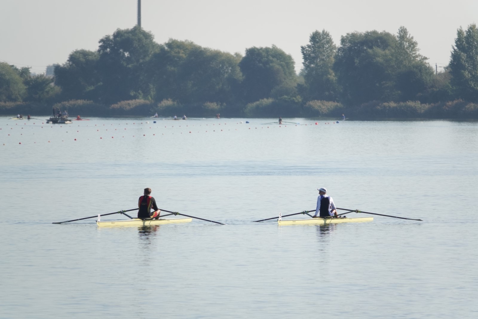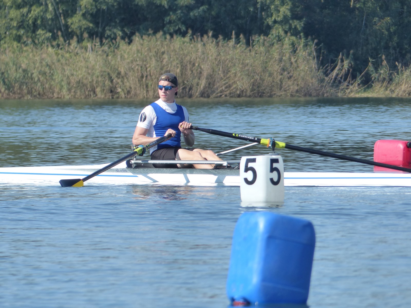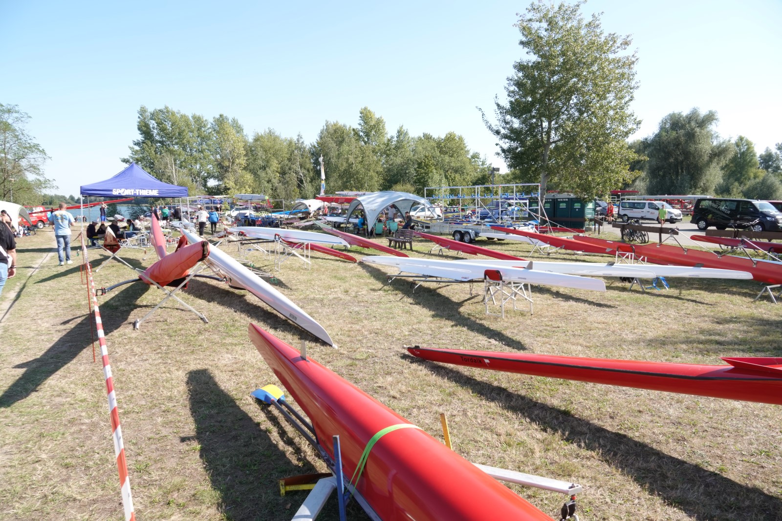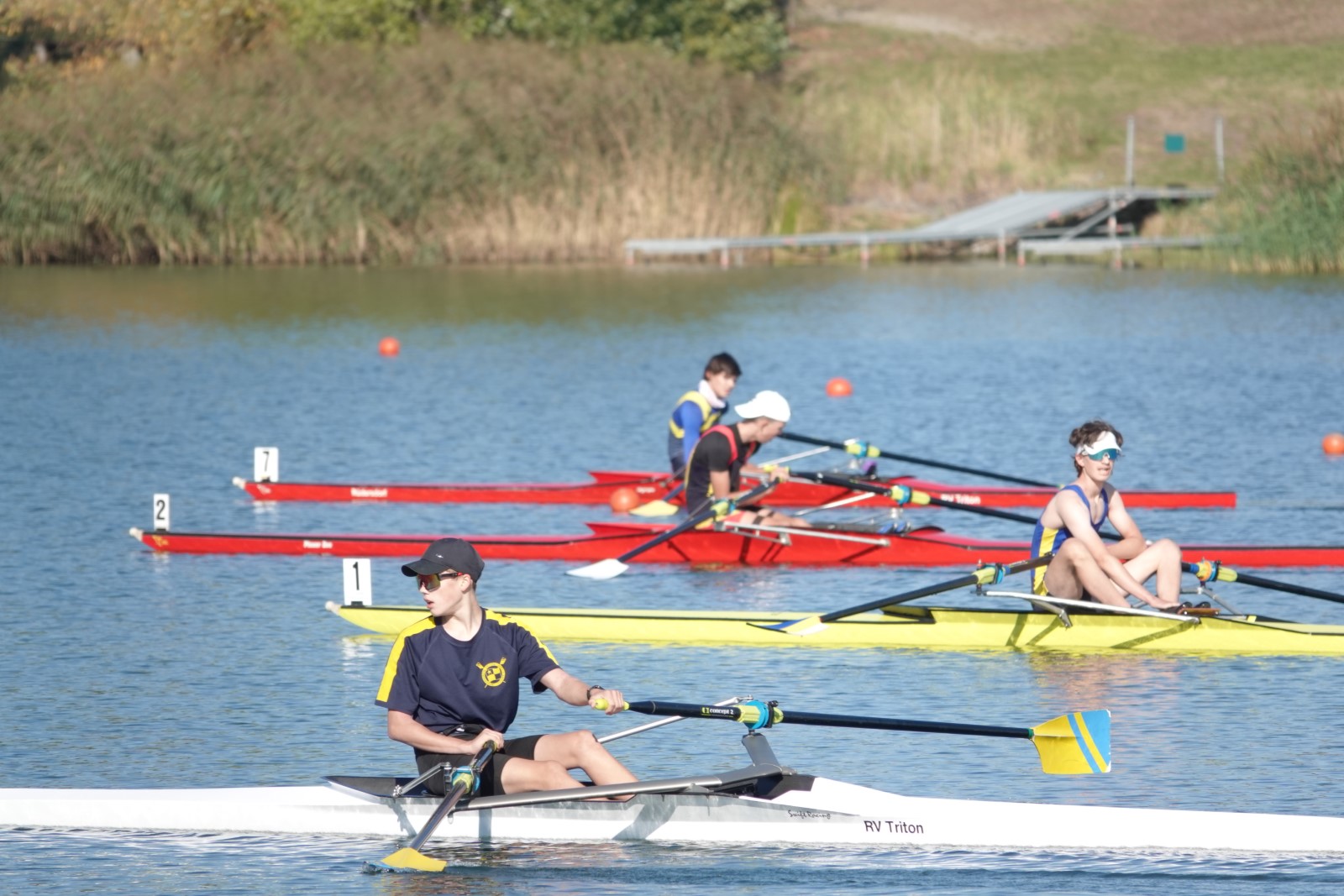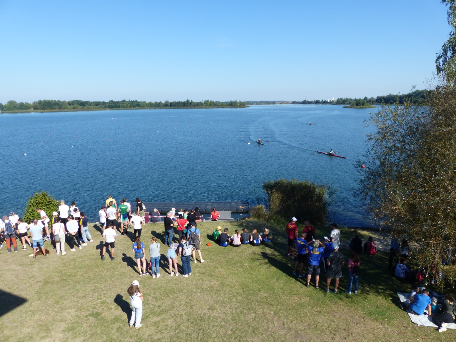 Eine Woche vorher, beim Aufbau der 6-Bahnen-Strecke, sorgte noch heftiger Seitenwind für erschwerte Bedingungen. Am Regatta-Samstag schob eine leichte Ostbrise die Boote schneller über die Distanz und sorgte vor allem im Zielbereich für einige Wellen. Mit etwas Routine waren diese problemlos zu meistern. Nur wenige Rudernde mussten von der Wasserwacht aus dem noch wohltemperierten Kiesgrubenwasser gezogen werden.