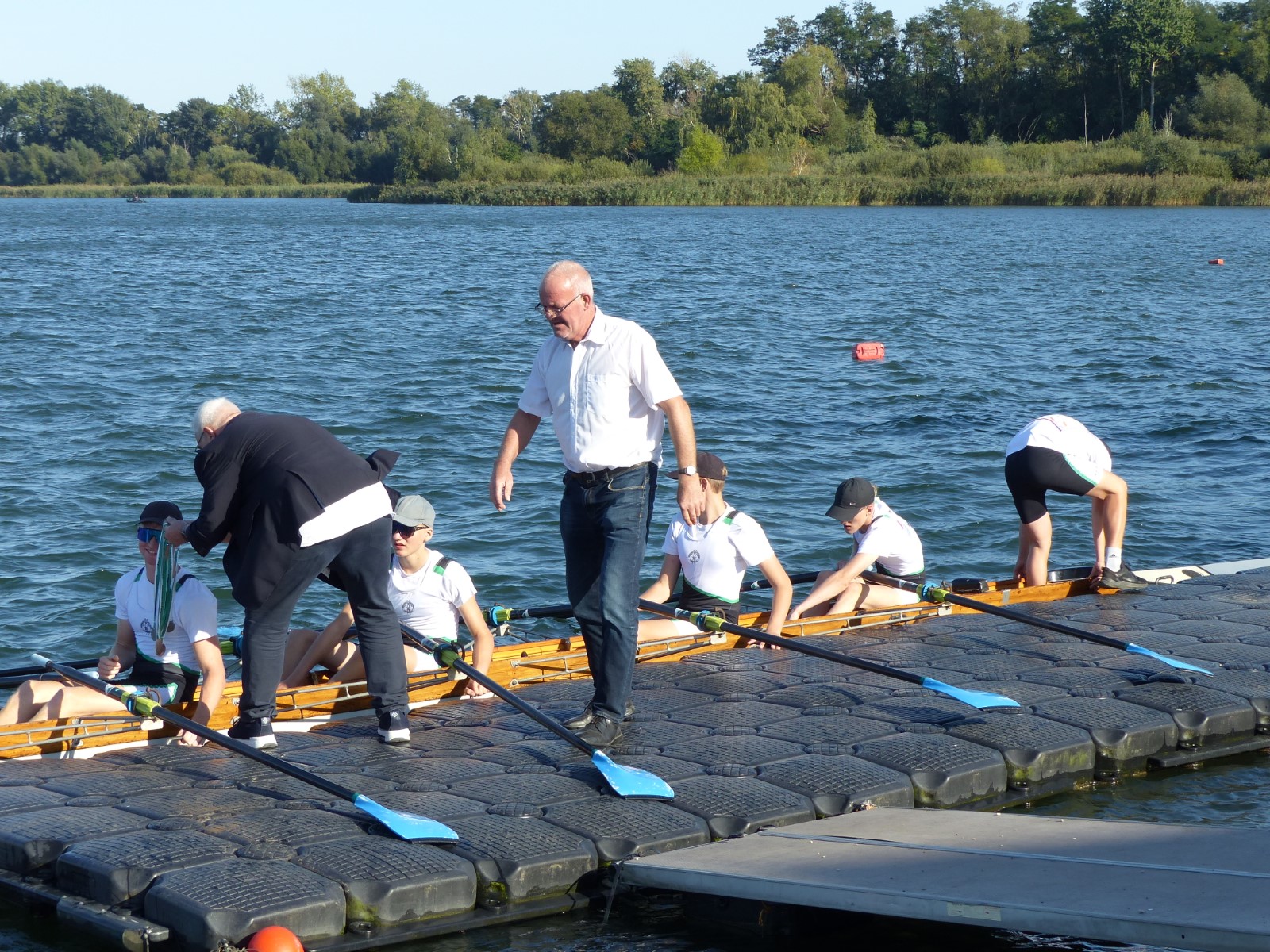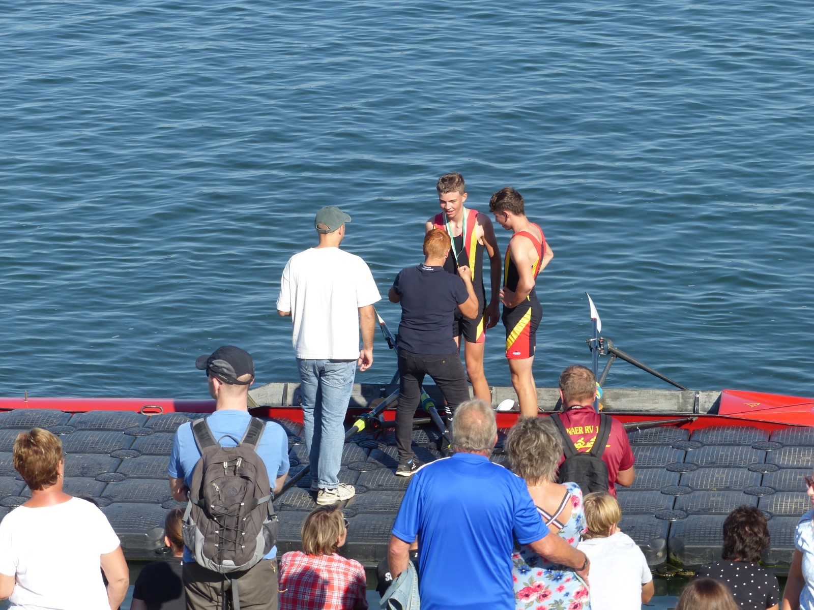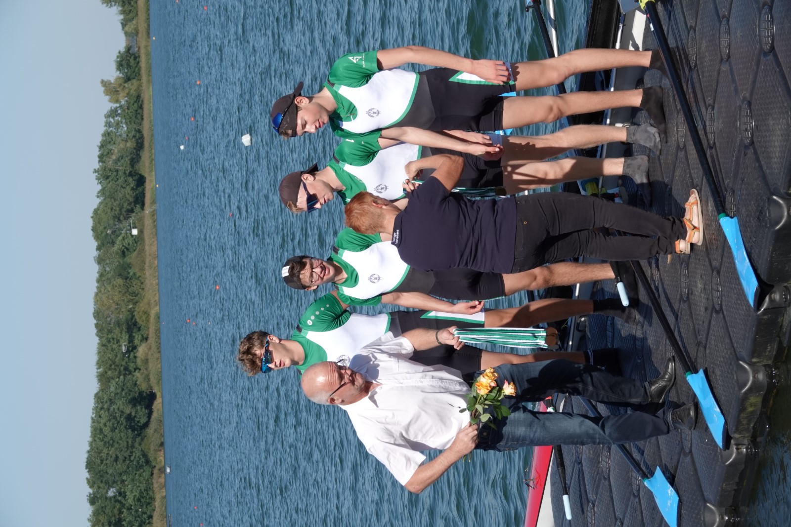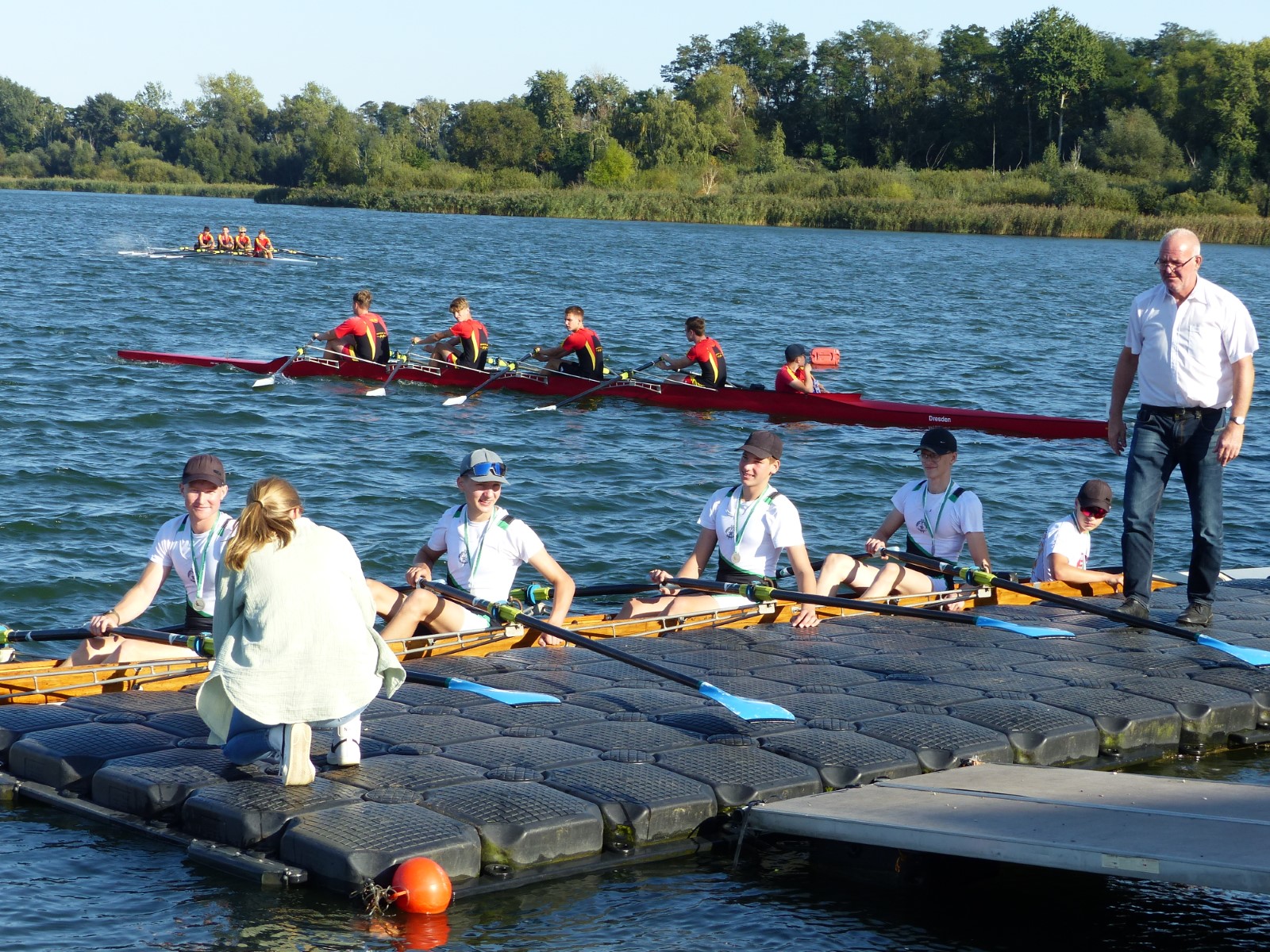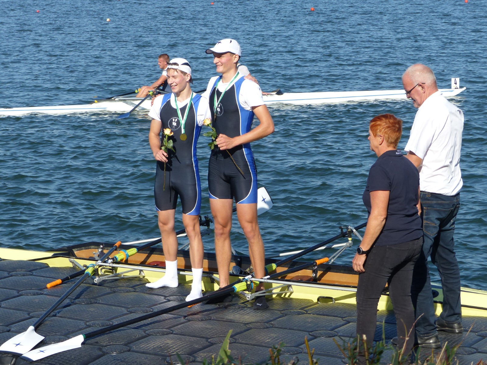 Ebenfalls auf der 1000-Meter-Strecke war der Junioren-Doppelvierer mit Clemens Beier Joris Pospischil, Timo Petraschke, Tilmann Domin und Steuermann Ole Völker (15/16J.) unterwegs. Nur etwas mehr als vier Sekunden fehlten zum Sieg. Am Ende wartete ein Satz Bronzemedaillen am Siegersteg... und wurde dort nicht abgeholt. Entäuschung oder Verwirrung? - Es war nicht in Erfahrung zu bringen. Die Ehrung fand dann nachträglich an Land statt.