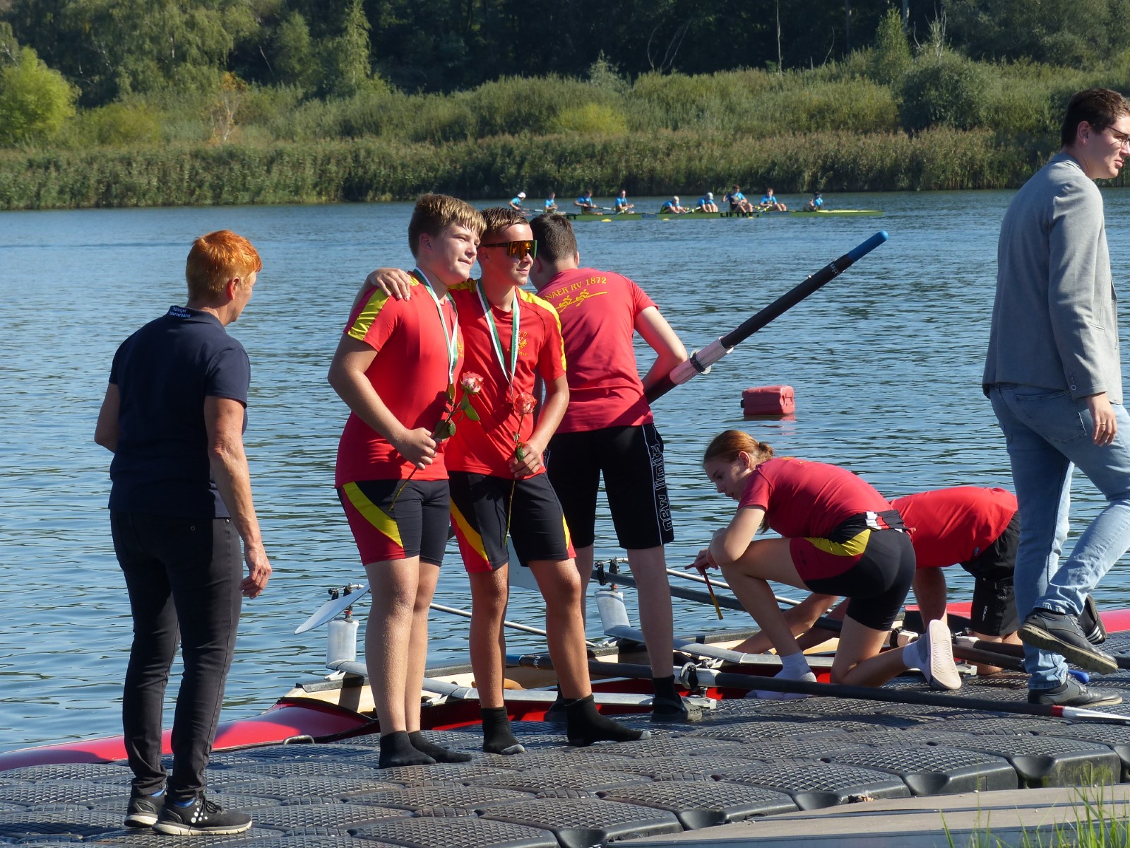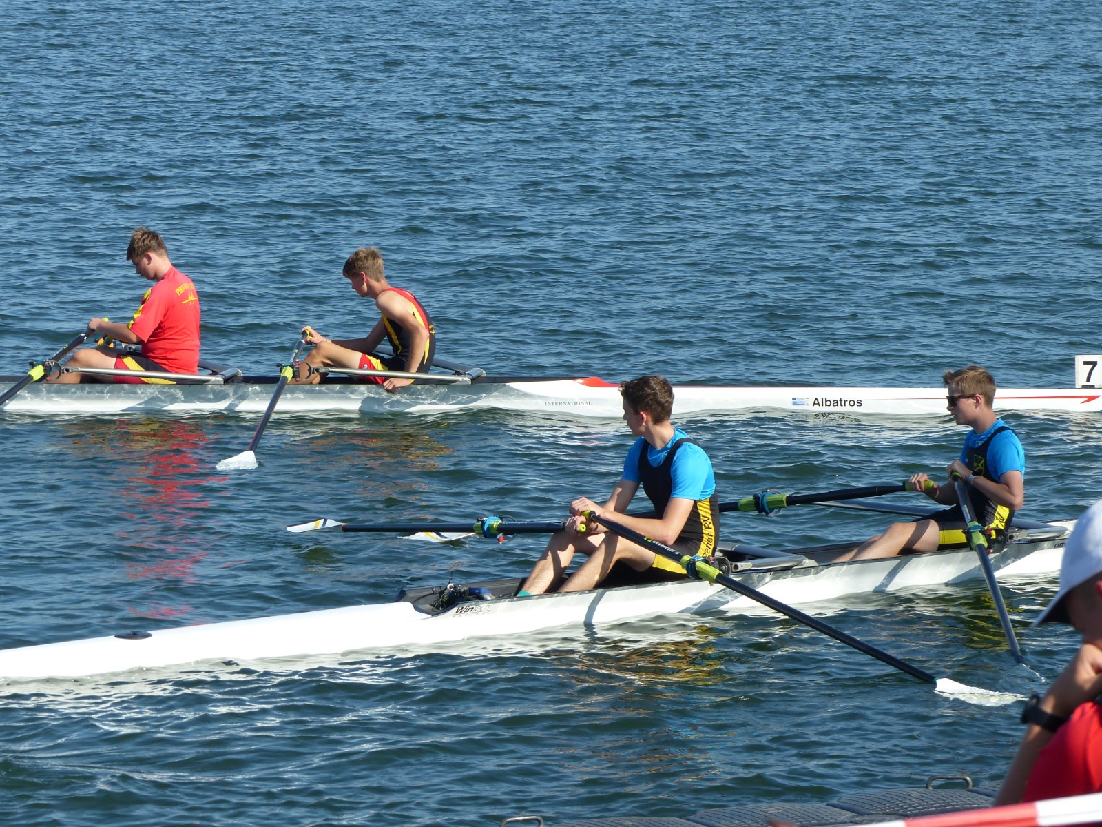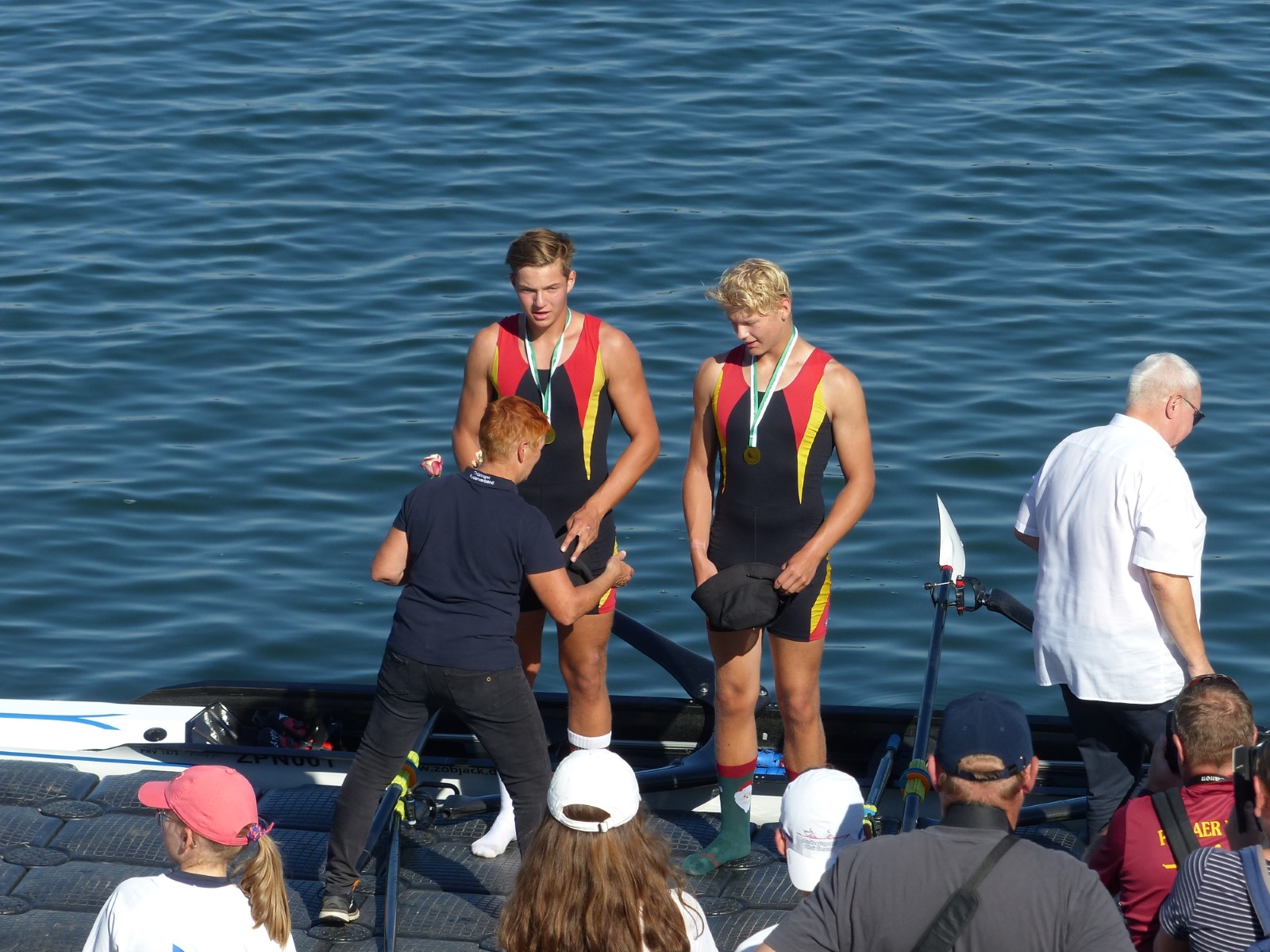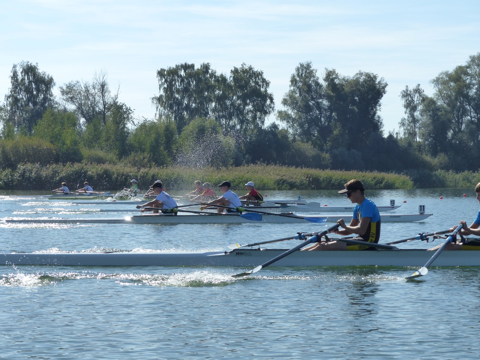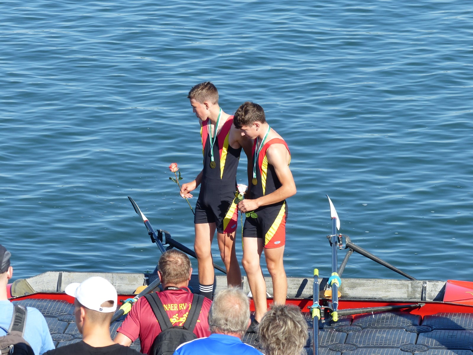 Ebenfalls auf der 1000-Meter-Strecke war der Junioren-Doppelvierer mit Clemens Beier Joris Pospischil, Timo Petraschke, Tilmann Domin und Steuermann Ole Völker (15/16J.) unterwegs. Nur etwas mehr als vier Sekunden fehlten zum Sieg. Am Ende wartete ein Satz Bronzemedaillen am Siegersteg... und wurde dort nicht abgeholt. Entäuschung oder Verwirrung? - Es war nicht in Erfahrung zu bringen. Die Ehrung fand dann nachträglich an Land statt.