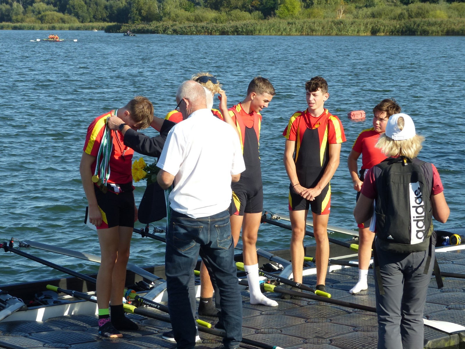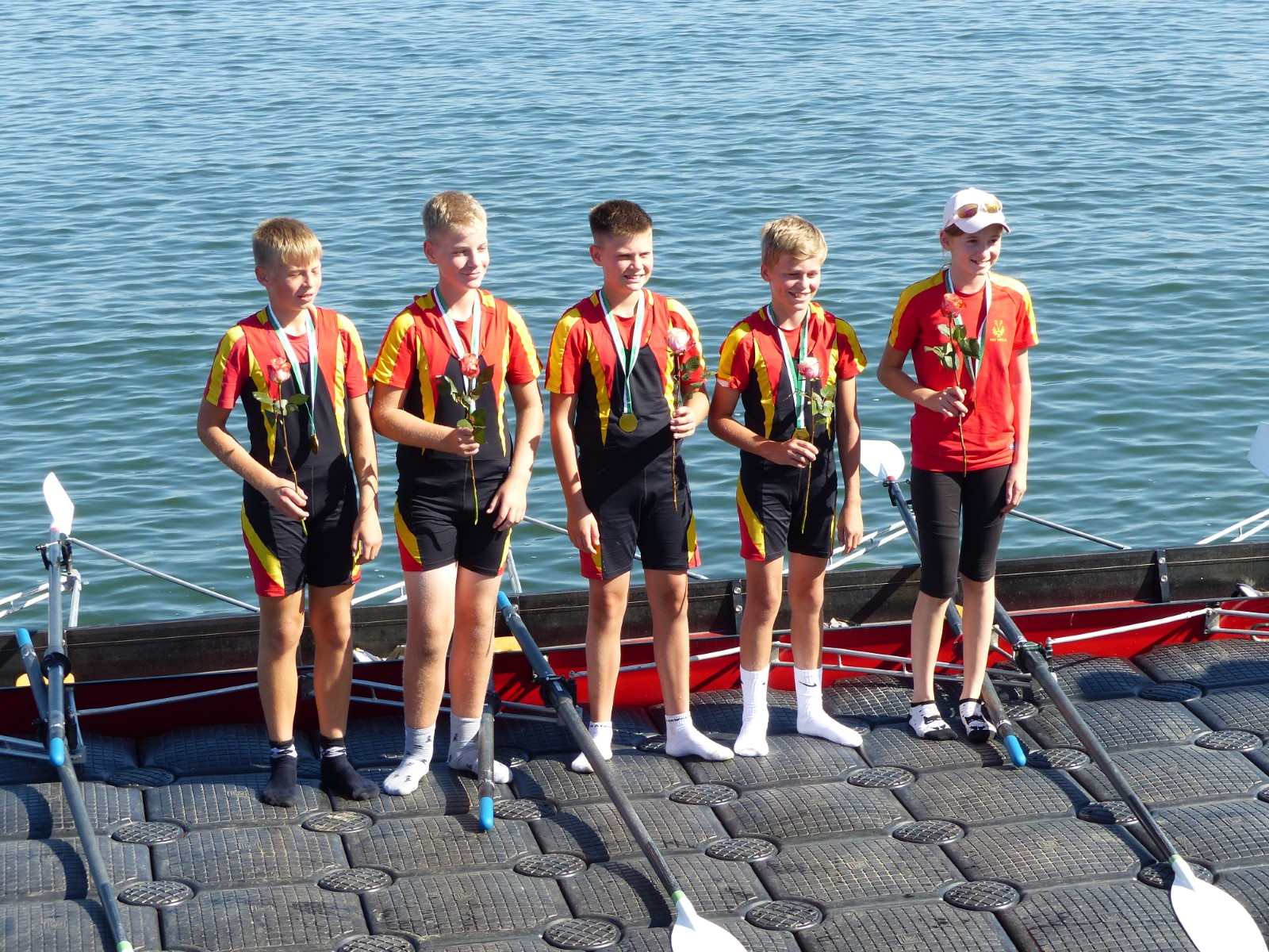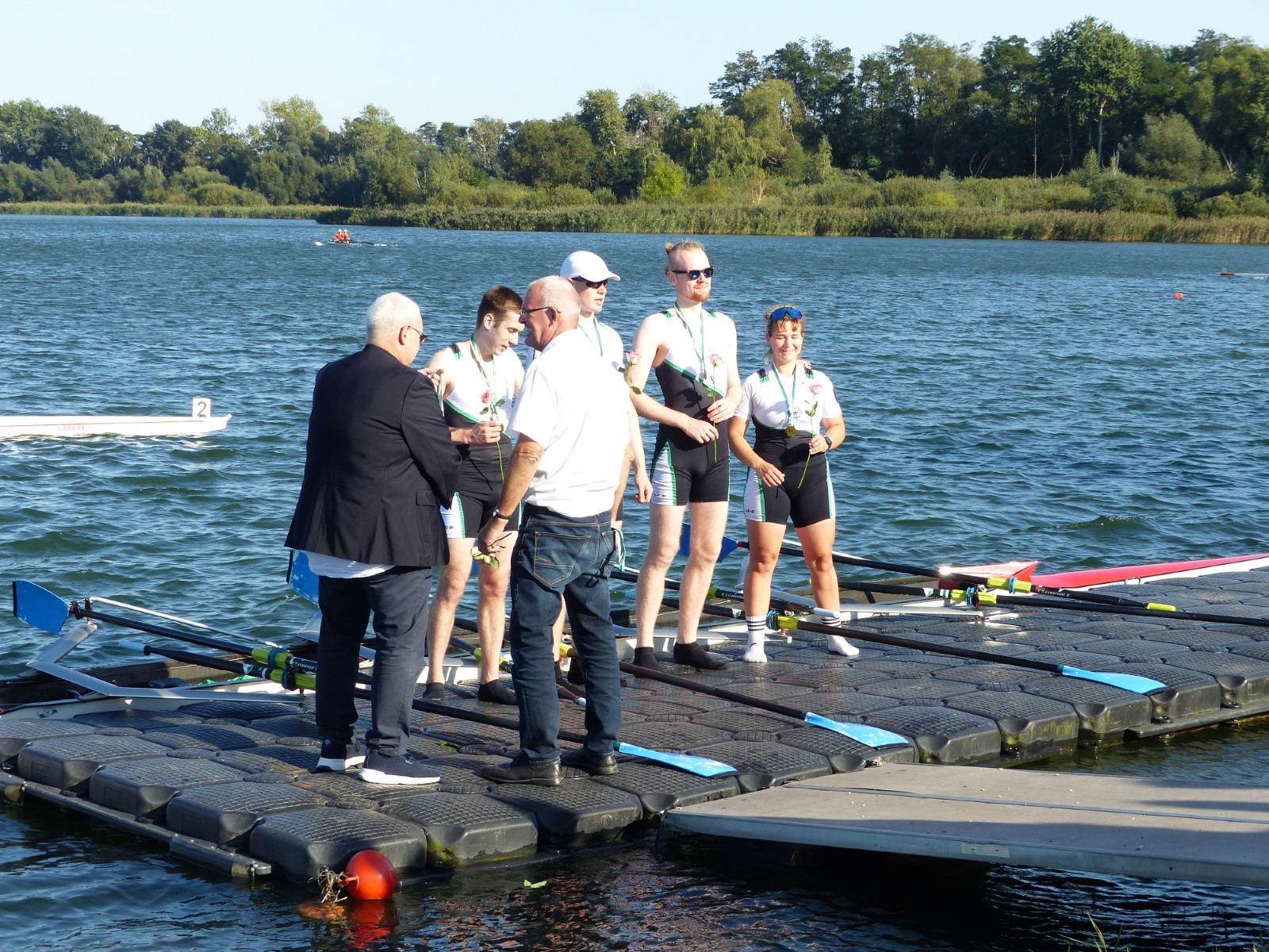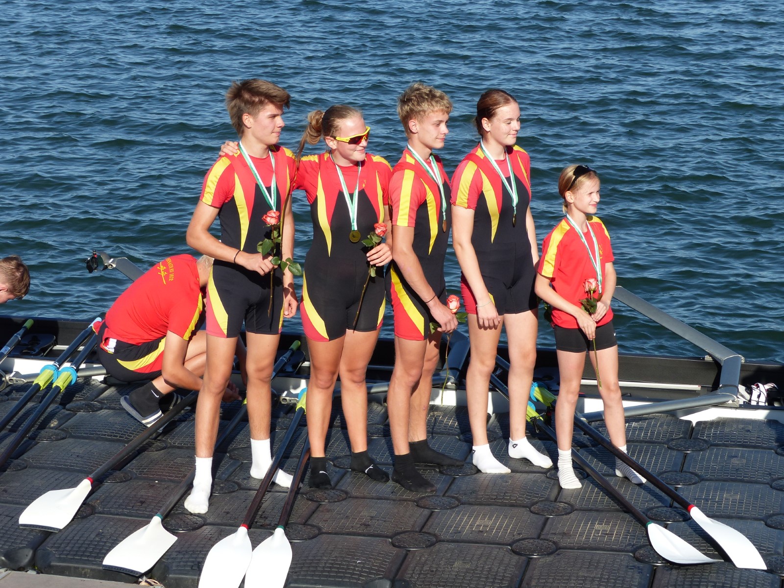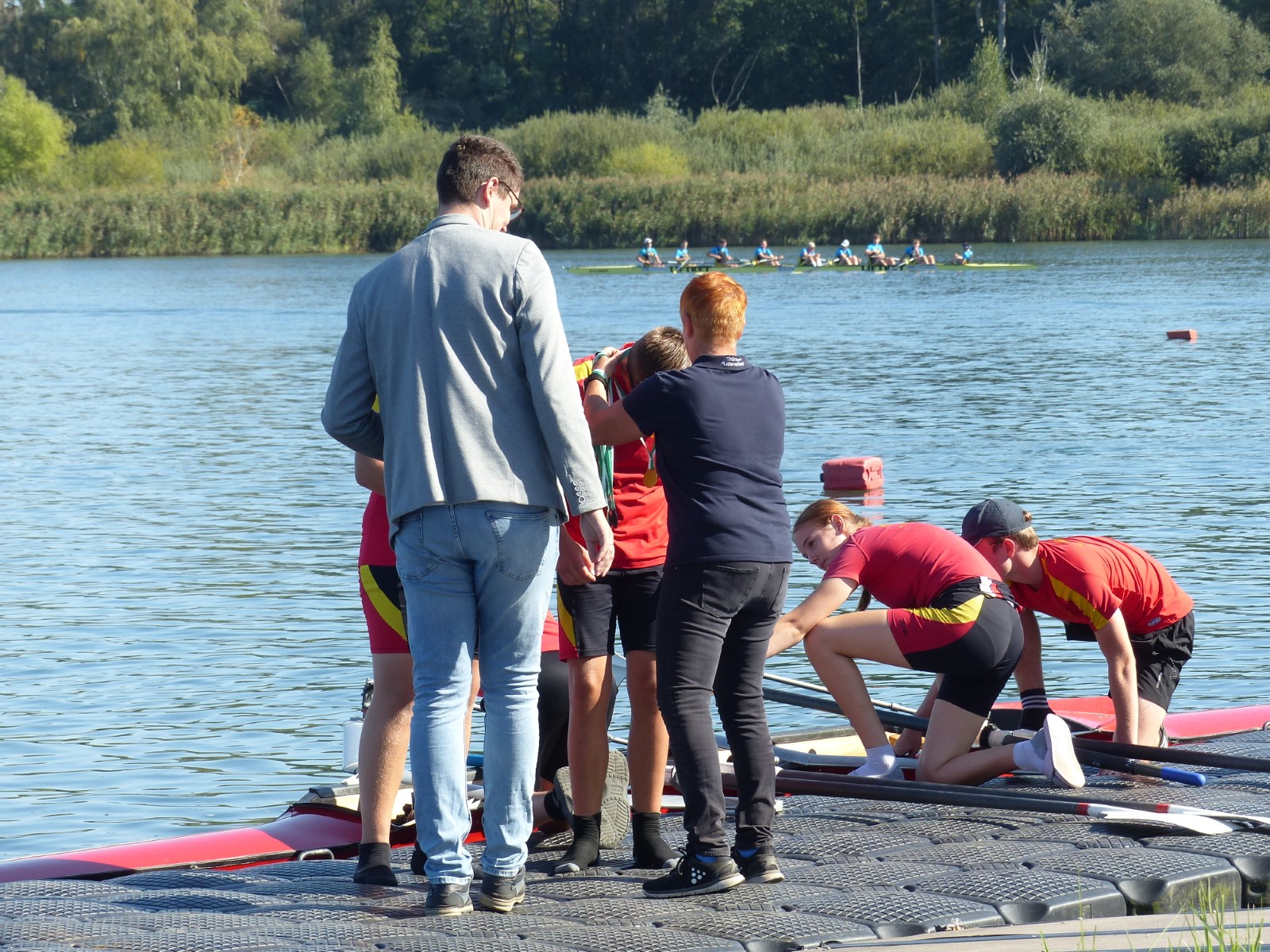 Ebenfalls auf der 1000-Meter-Strecke war der Junioren-Doppelvierer mit Clemens Beier Joris Pospischil, Timo Petraschke, Tilmann Domin und Steuermann Ole Völker (15/16J.) unterwegs. Nur etwas mehr als vier Sekunden fehlten zum Sieg. Am Ende wartete ein Satz Bronzemedaillen am Siegersteg... und wurde dort nicht abgeholt. Entäuschung oder Verwirrung? - Es war nicht in Erfahrung zu bringen. Die Ehrung fand dann nachträglich an Land statt.