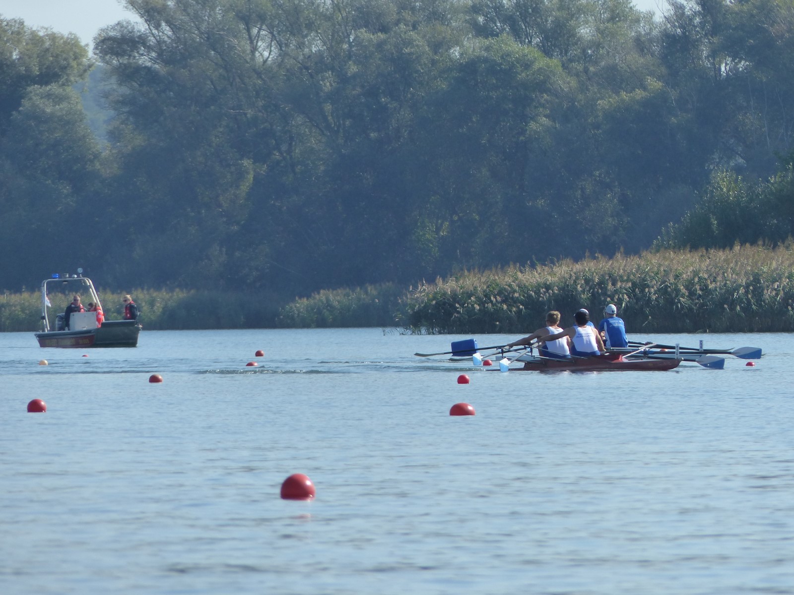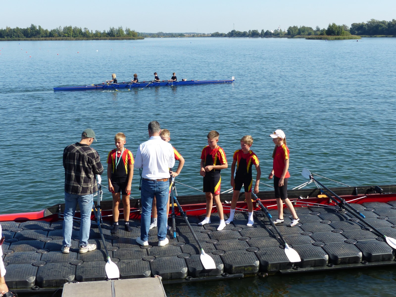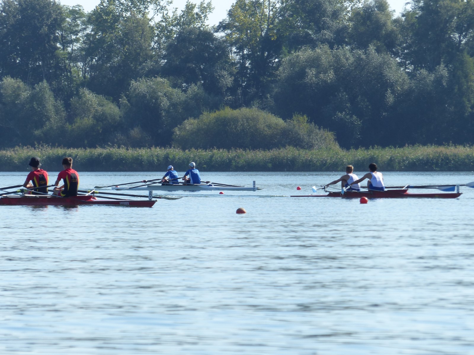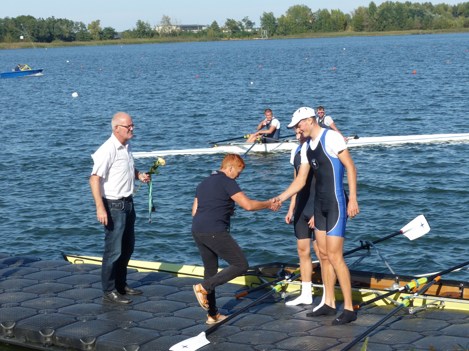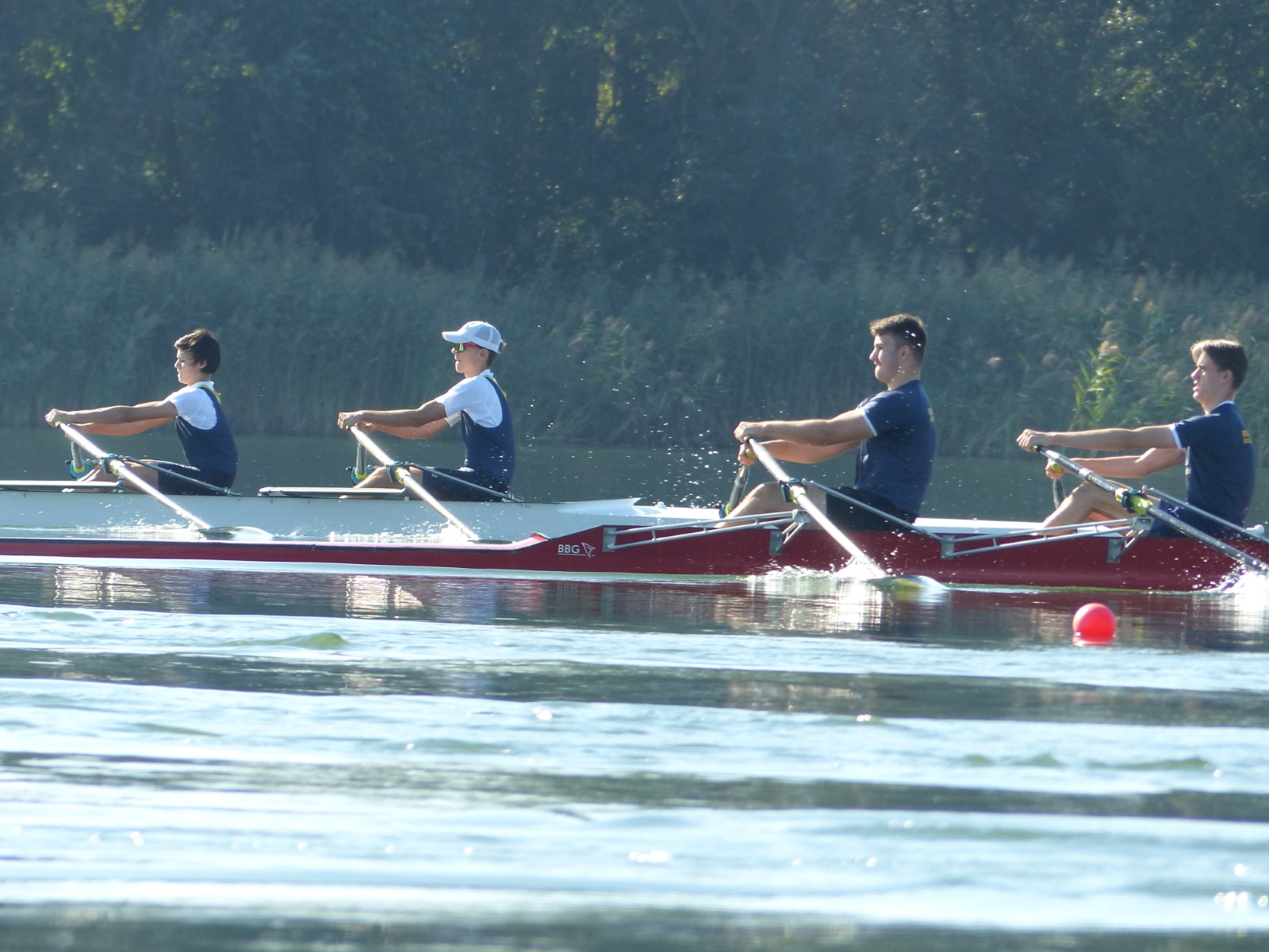 Ebenfalls auf der 1000-Meter-Strecke war der Junioren-Doppelvierer mit Clemens Beier Joris Pospischil, Timo Petraschke, Tilmann Domin und Steuermann Ole Völker (15/16J.) unterwegs. Nur etwas mehr als vier Sekunden fehlten zum Sieg. Am Ende wartete ein Satz Bronzemedaillen am Siegersteg... und wurde dort nicht abgeholt. Entäuschung oder Verwirrung? - Es war nicht in Erfahrung zu bringen. Die Ehrung fand dann nachträglich an Land statt.