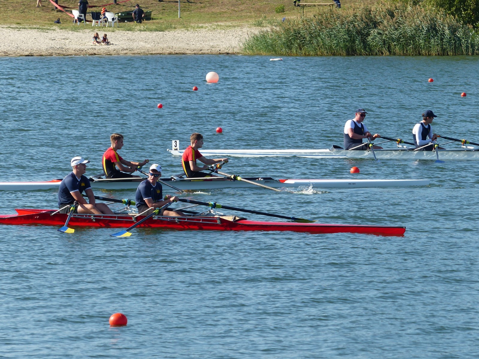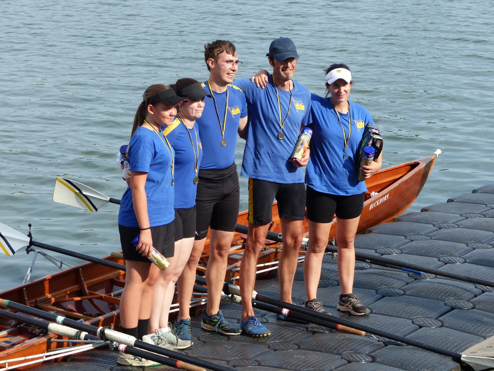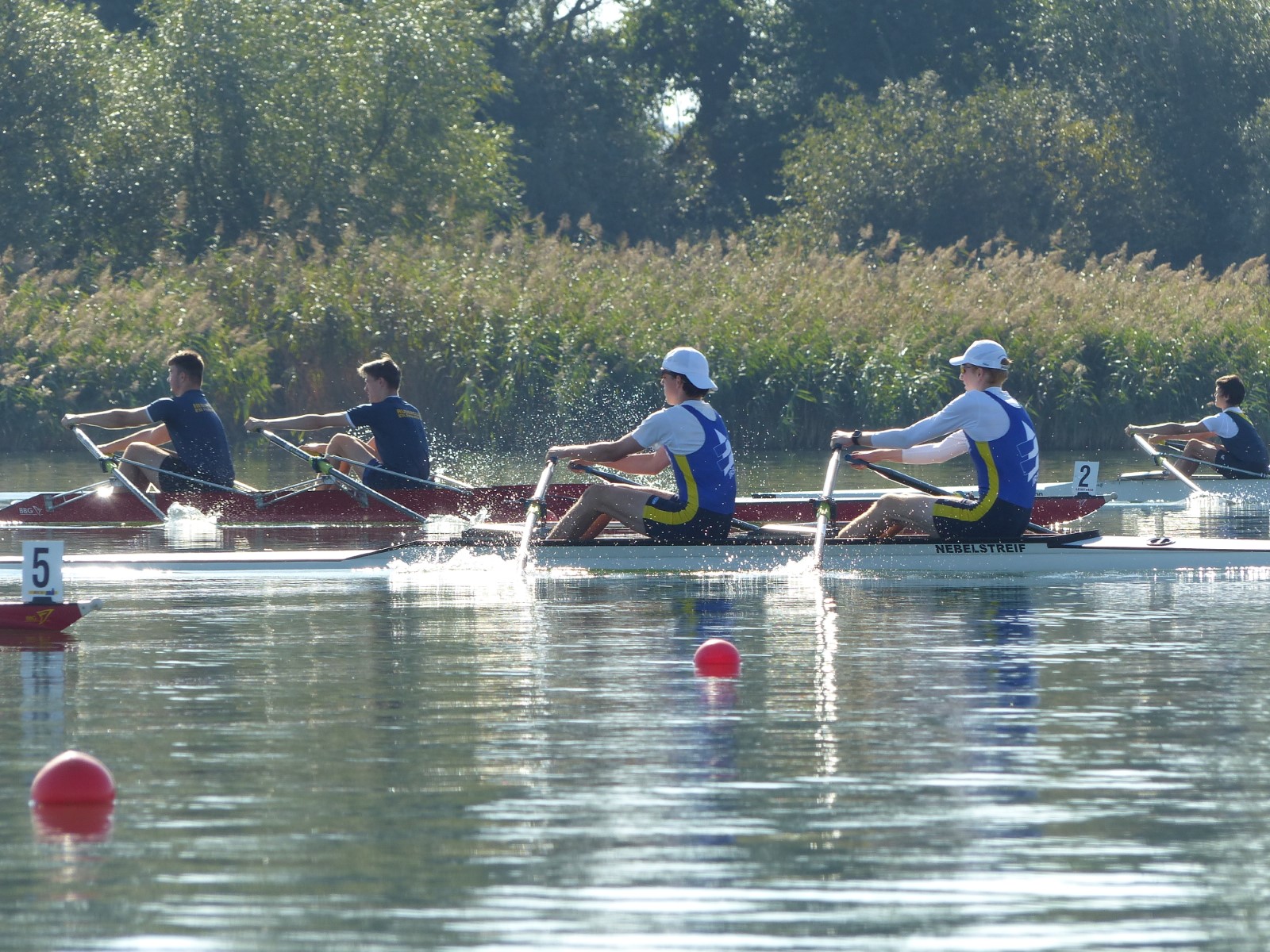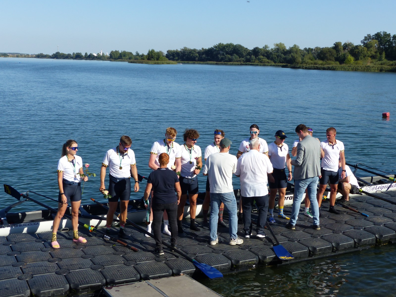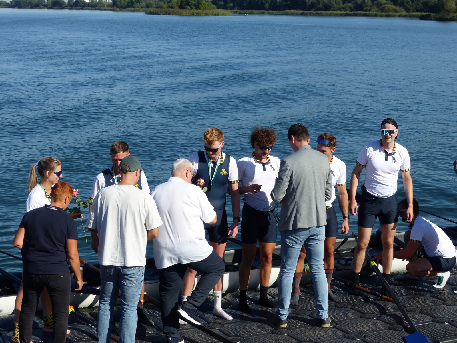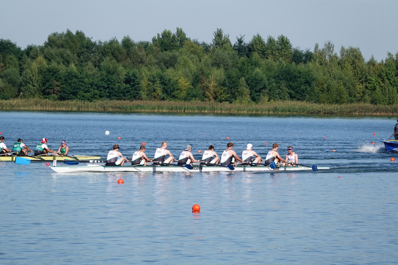 Ebenfalls auf der 1000-Meter-Strecke war der Junioren-Doppelvierer mit Clemens Beier Joris Pospischil, Timo Petraschke, Tilmann Domin und Steuermann Ole Völker (15/16J.) unterwegs. Nur etwas mehr als vier Sekunden fehlten zum Sieg. Am Ende wartete ein Satz Bronzemedaillen am Siegersteg... und wurde dort nicht abgeholt. Entäuschung oder Verwirrung? - Es war nicht in Erfahrung zu bringen. Die Ehrung fand dann nachträglich an Land statt.