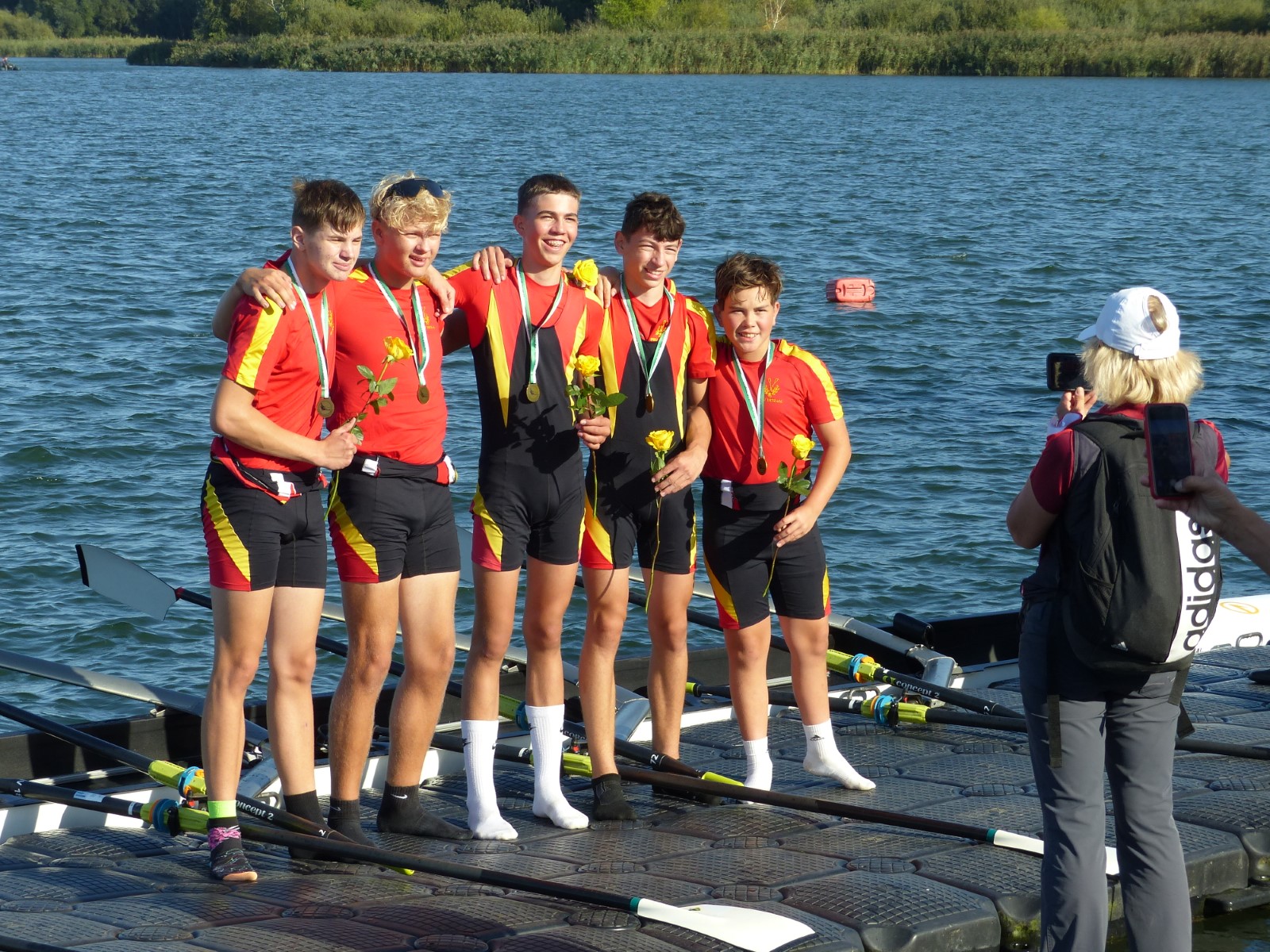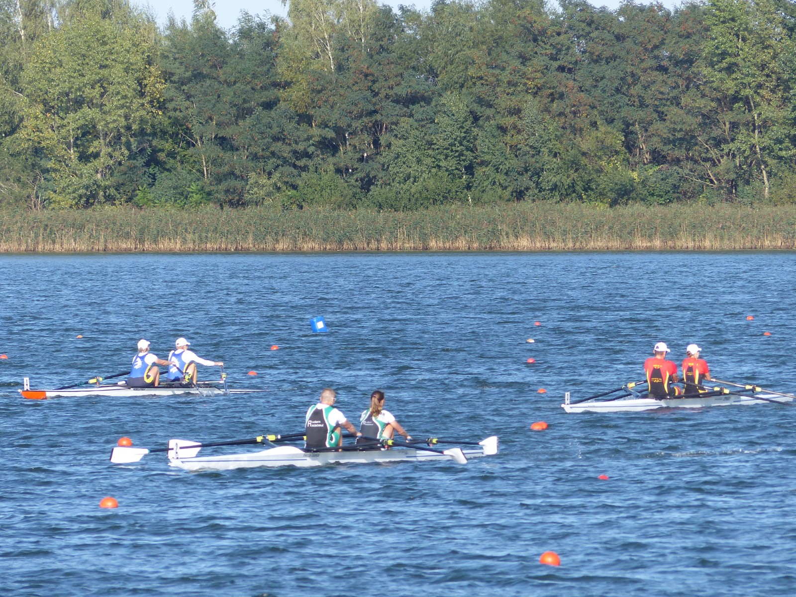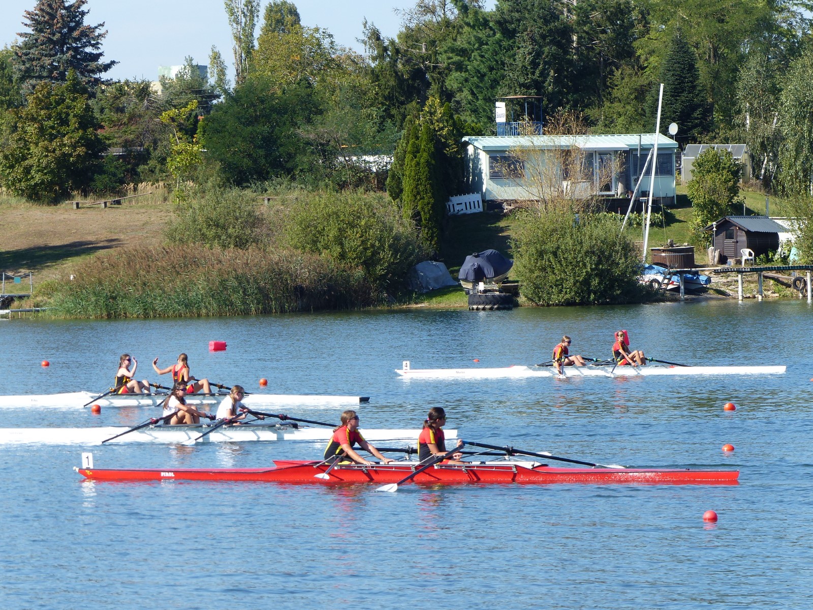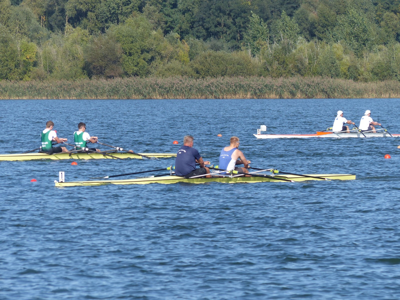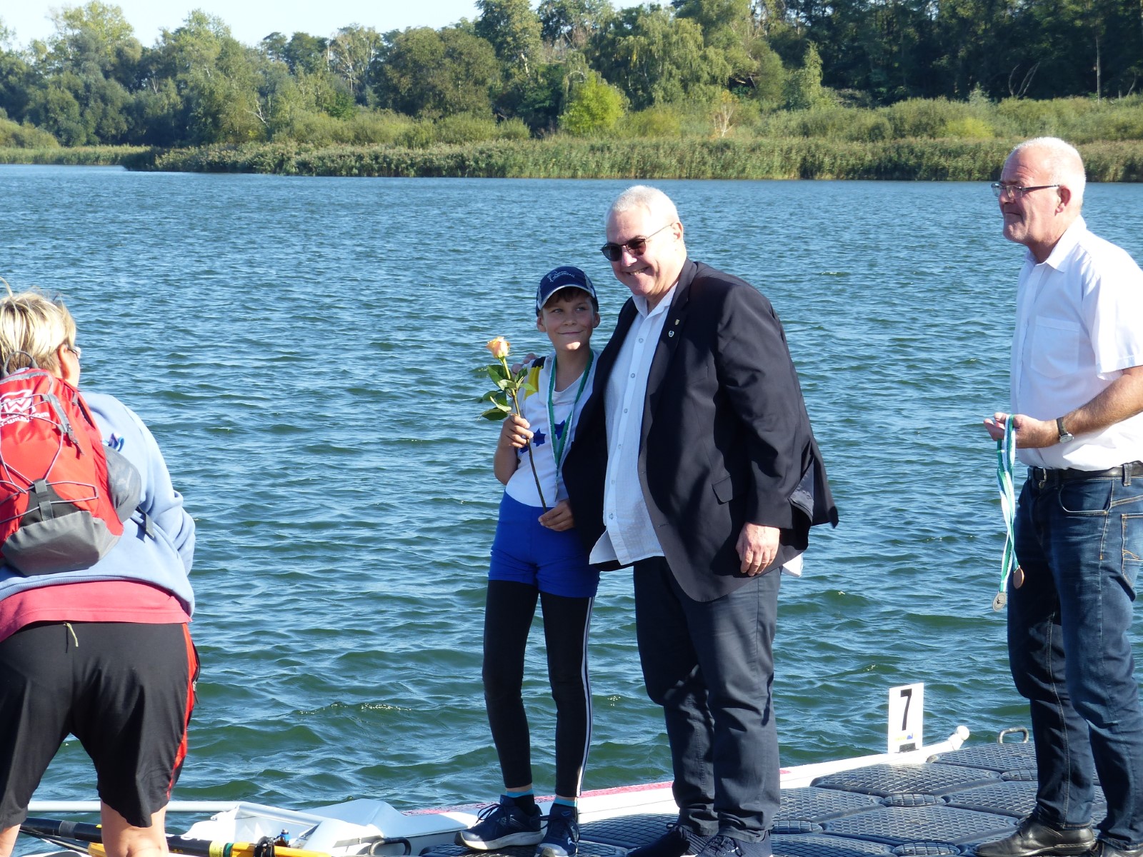 Ebenfalls auf der 1000-Meter-Strecke war der Junioren-Doppelvierer mit Clemens Beier Joris Pospischil, Timo Petraschke, Tilmann Domin und Steuermann Ole Völker (15/16J.) unterwegs. Nur etwas mehr als vier Sekunden fehlten zum Sieg. Am Ende wartete ein Satz Bronzemedaillen am Siegersteg... und wurde dort nicht abgeholt. Entäuschung oder Verwirrung? - Es war nicht in Erfahrung zu bringen. Die Ehrung fand dann nachträglich an Land statt.