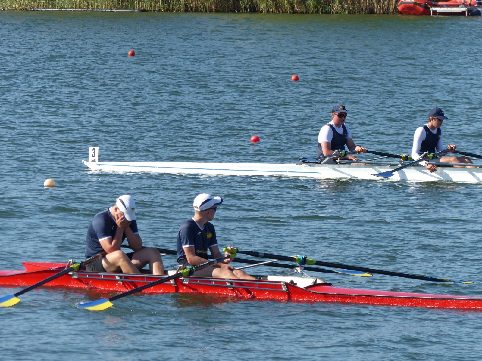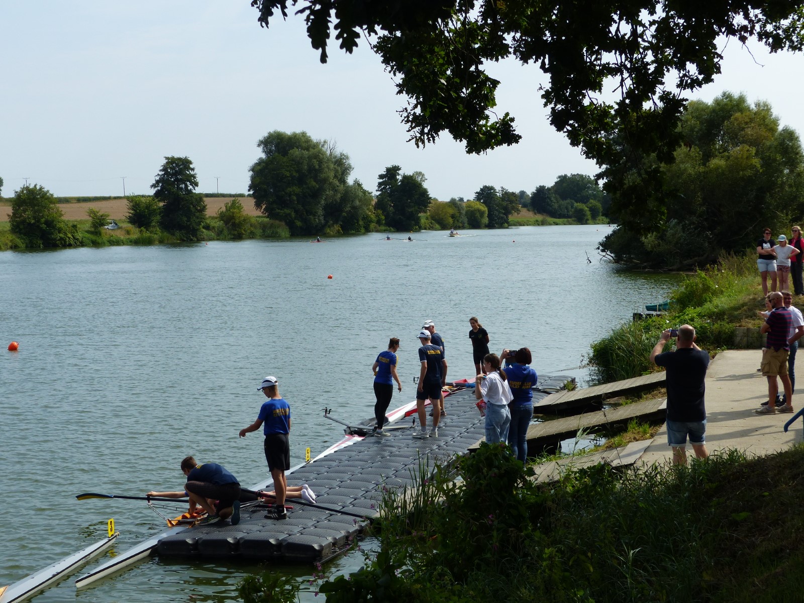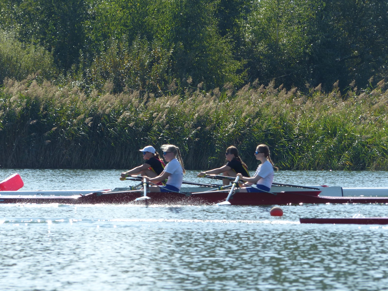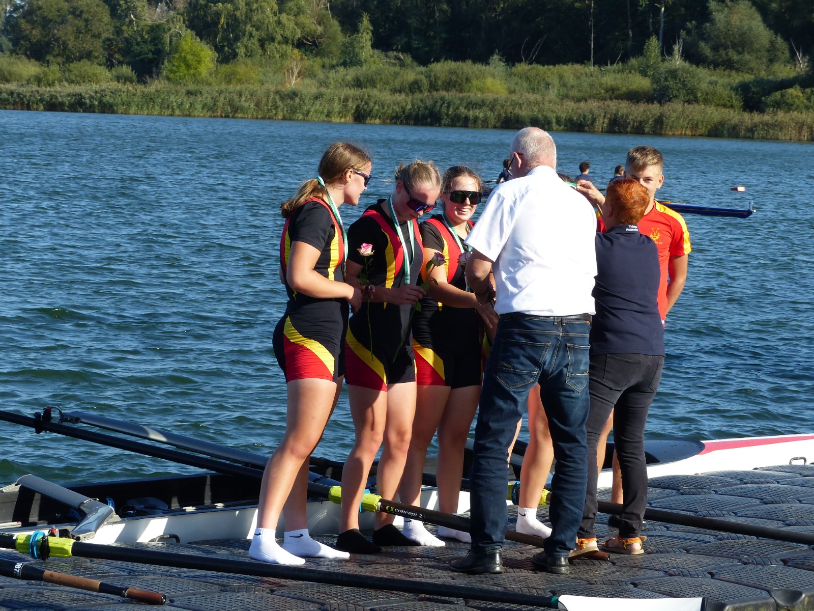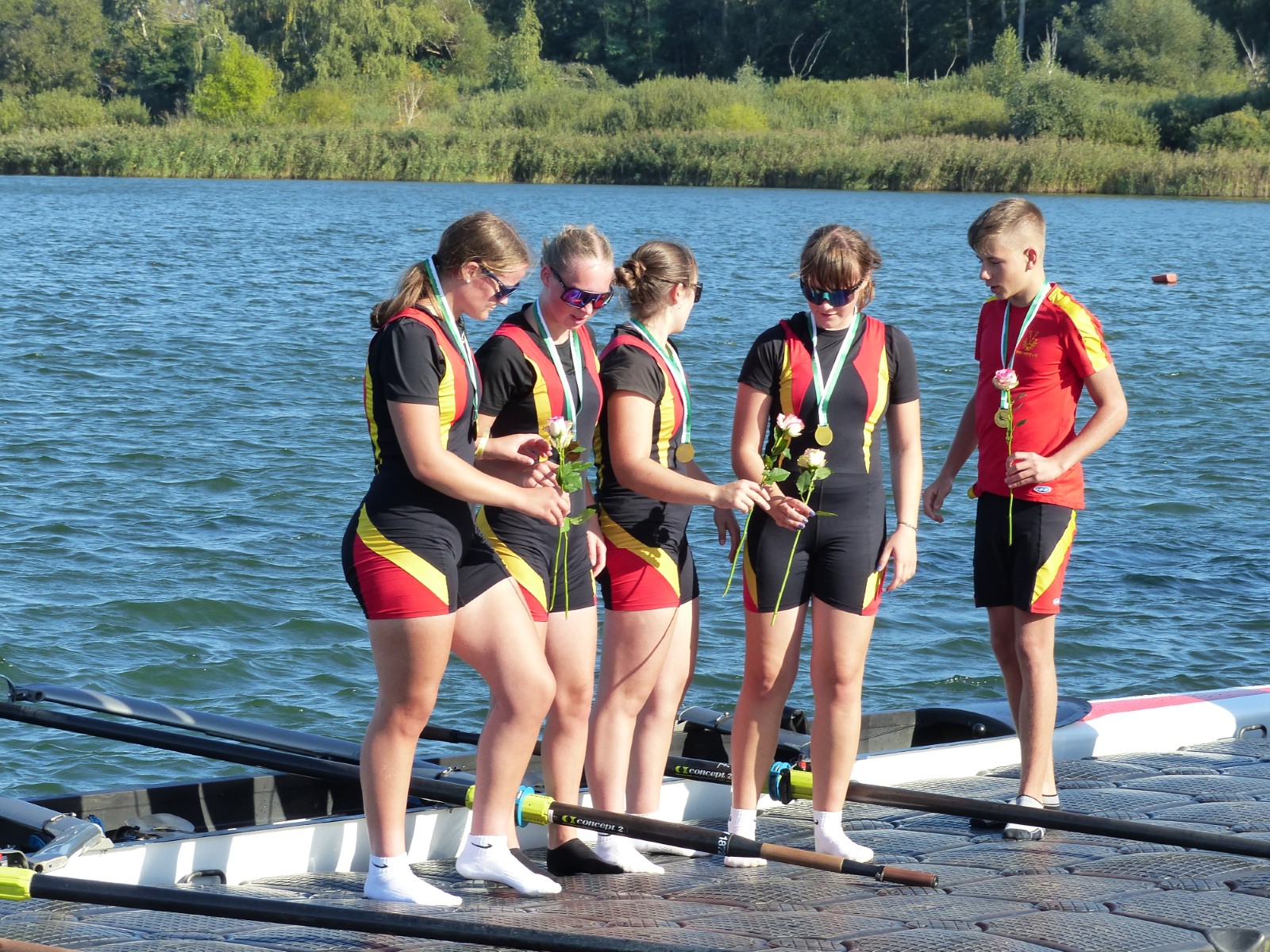 Ebenfalls auf der 1000-Meter-Strecke war der Junioren-Doppelvierer mit Clemens Beier Joris Pospischil, Timo Petraschke, Tilmann Domin und Steuermann Ole Völker (15/16J.) unterwegs. Nur etwas mehr als vier Sekunden fehlten zum Sieg. Am Ende wartete ein Satz Bronzemedaillen am Siegersteg... und wurde dort nicht abgeholt. Entäuschung oder Verwirrung? - Es war nicht in Erfahrung zu bringen. Die Ehrung fand dann nachträglich an Land statt.