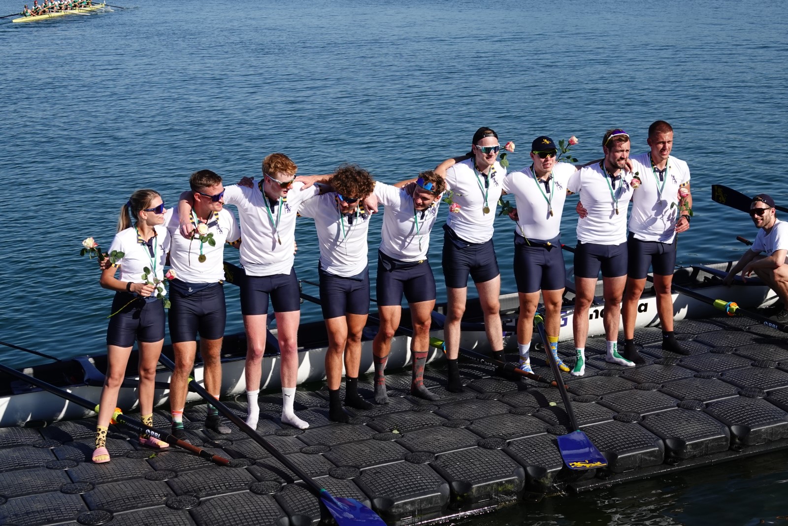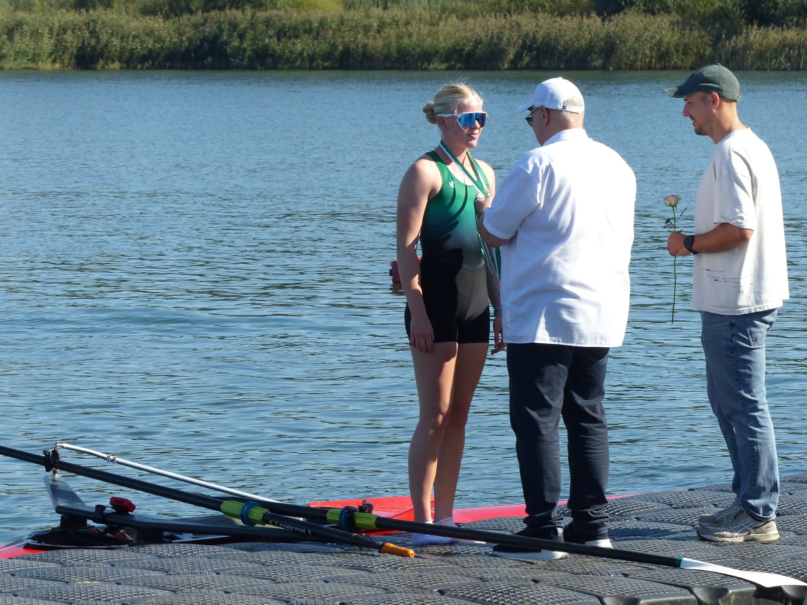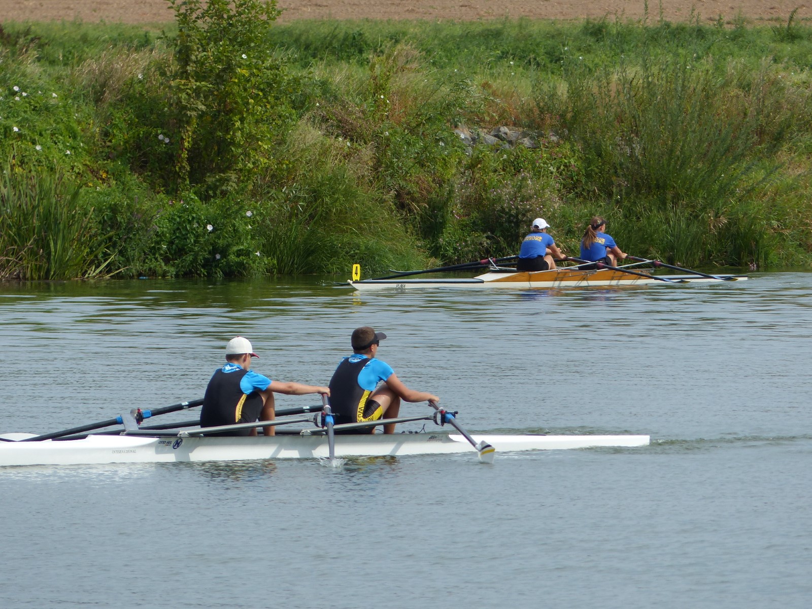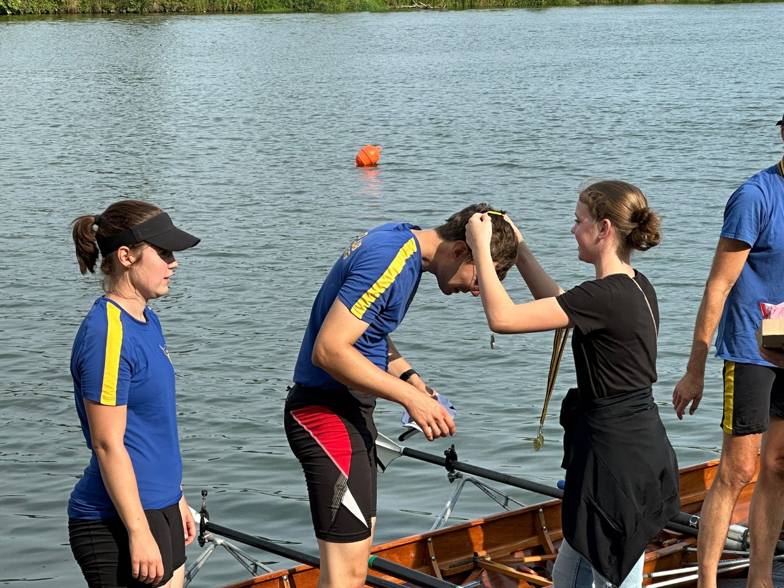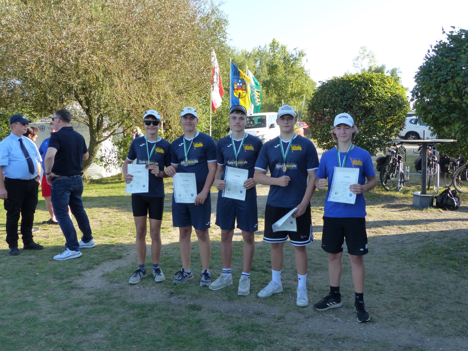 Ebenfalls auf der 1000-Meter-Strecke war der Junioren-Doppelvierer mit Clemens Beier Joris Pospischil, Timo Petraschke, Tilmann Domin und Steuermann Ole Völker (15/16J.) unterwegs. Nur etwas mehr als vier Sekunden fehlten zum Sieg. Am Ende wartete ein Satz Bronzemedaillen am Siegersteg... und wurde dort nicht abgeholt. Entäuschung oder Verwirrung? - Es war nicht in Erfahrung zu bringen. Die Ehrung fand dann nachträglich an Land statt.