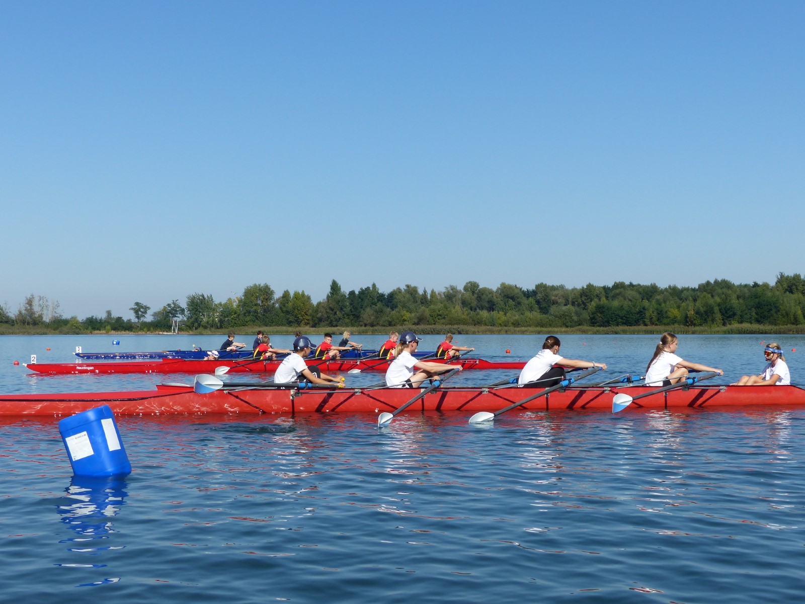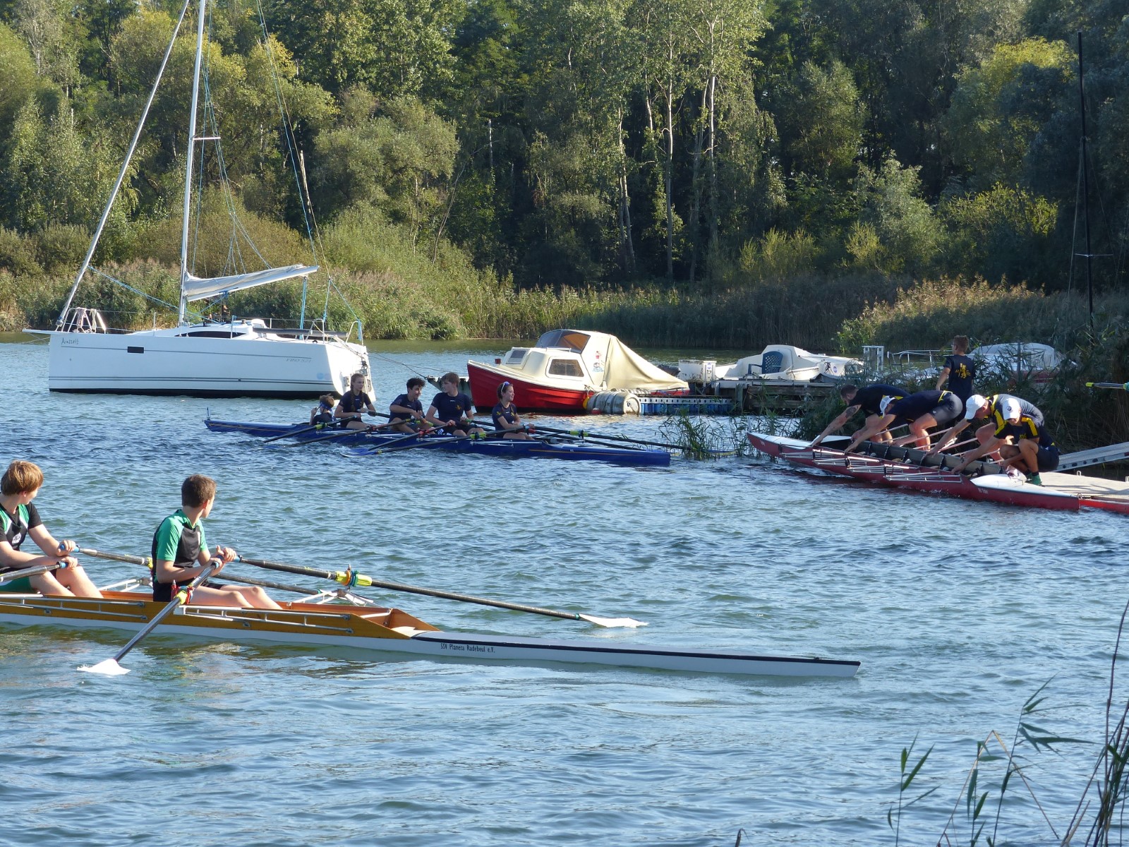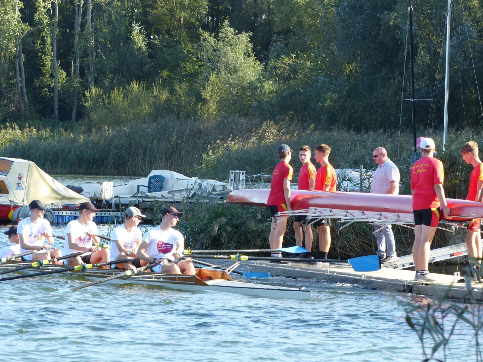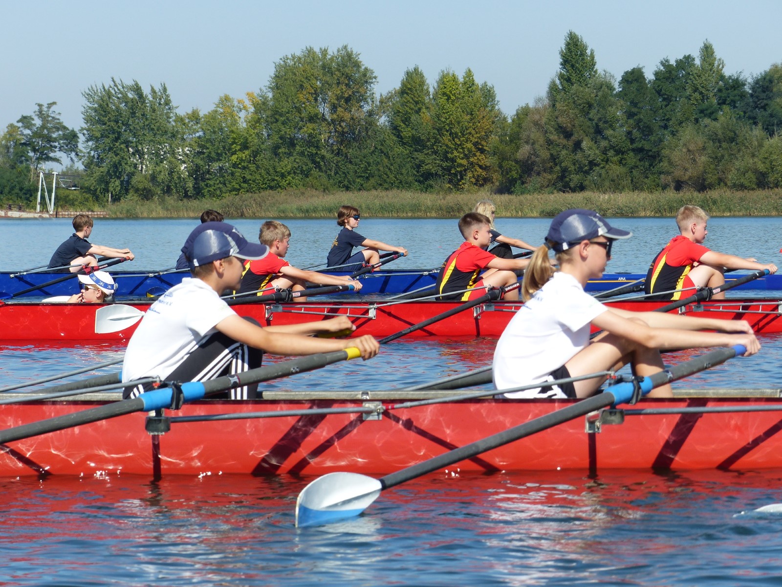 Am Vormittag ging es schon los: Kinder und Jugendliche hatten Gelegenheit, ihre Leistungen auf dem Ruderergometer zu vergleichen. Die Zeit bis zum Mittag wurde genutzt, um nach unzähligen Einheiten auf der Kiesgrube das Rudern auf dem Mühlgraben zu testen. Zur Stärkung gab es dann Pizza für alle bei strahlendem Sonnenschein.