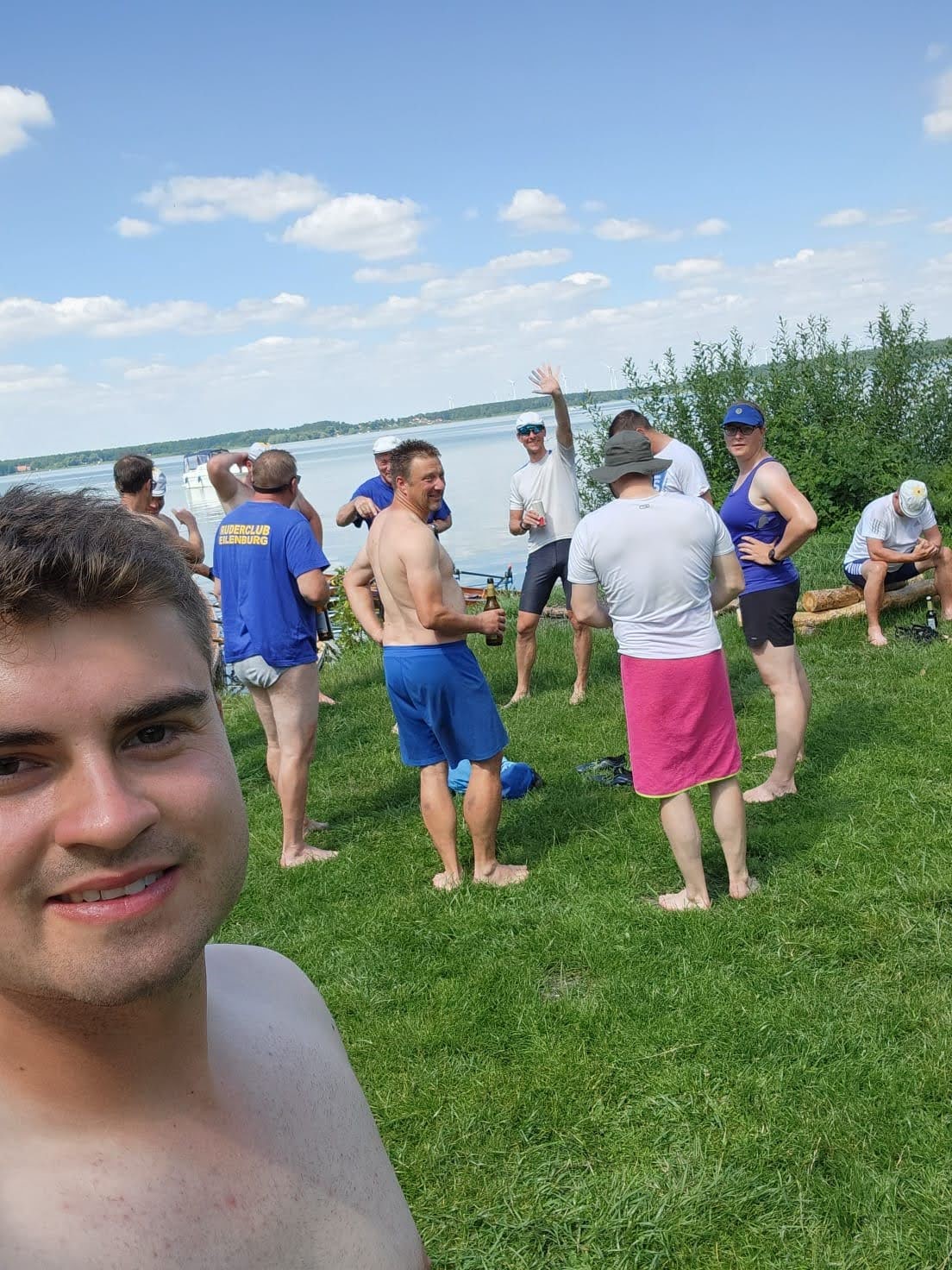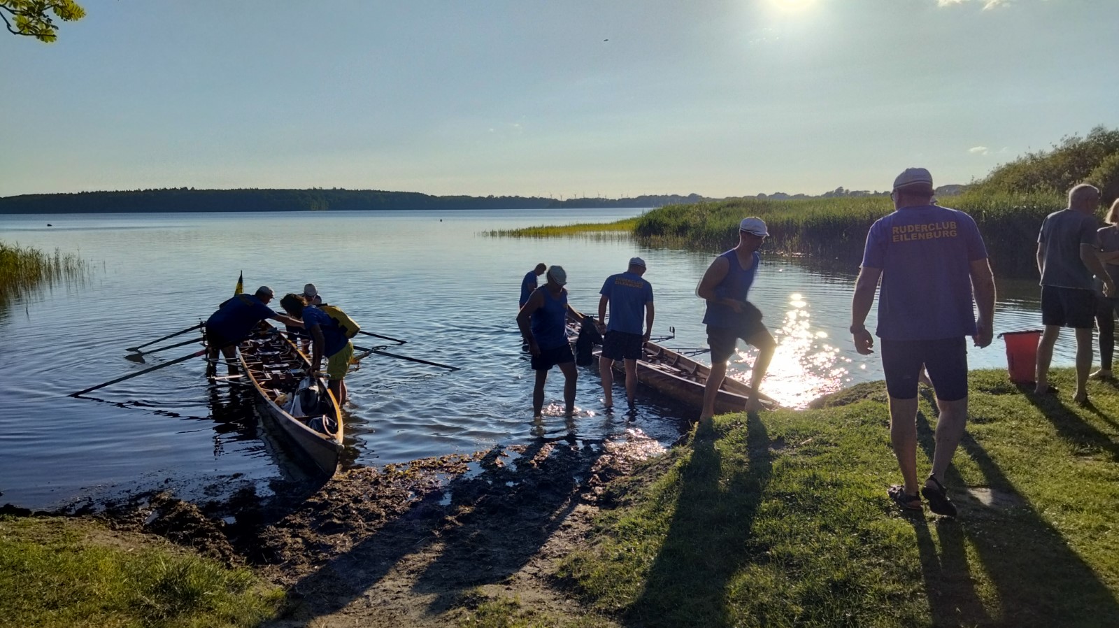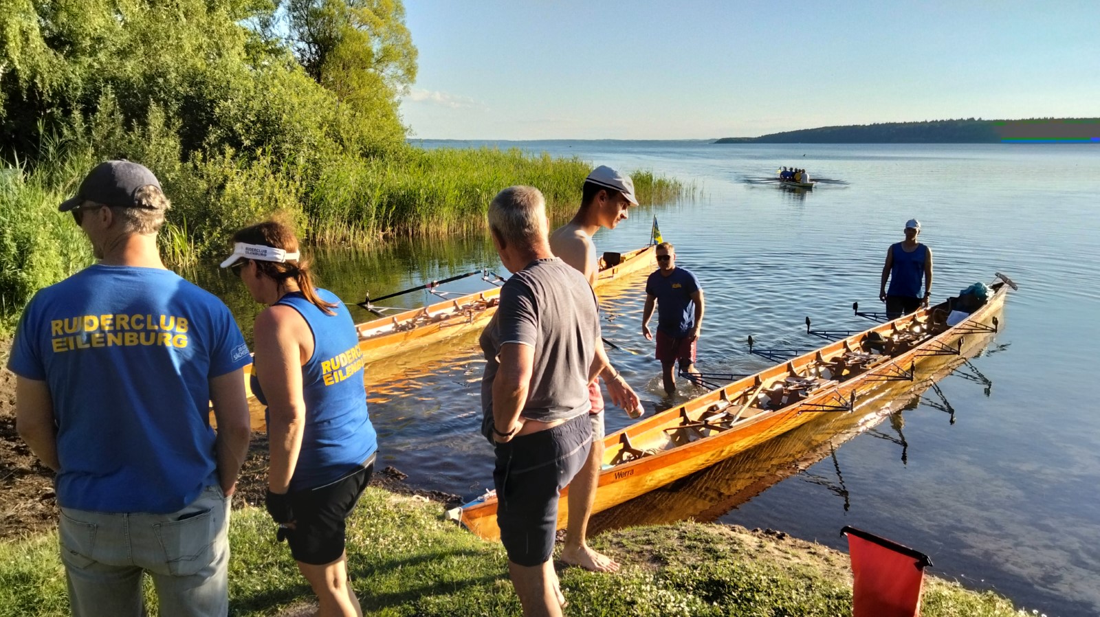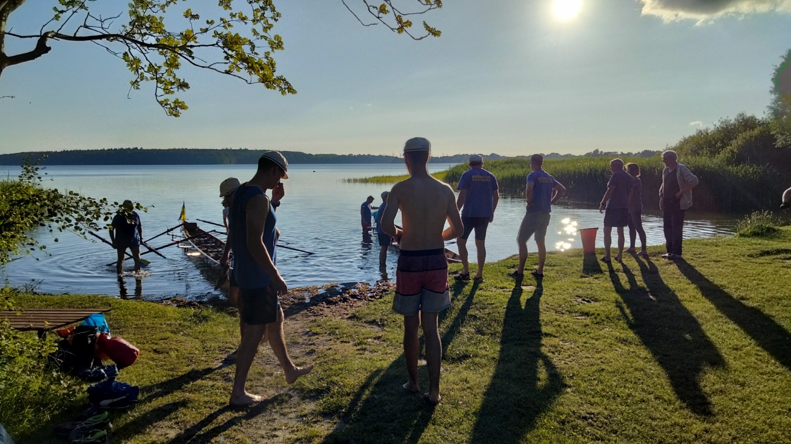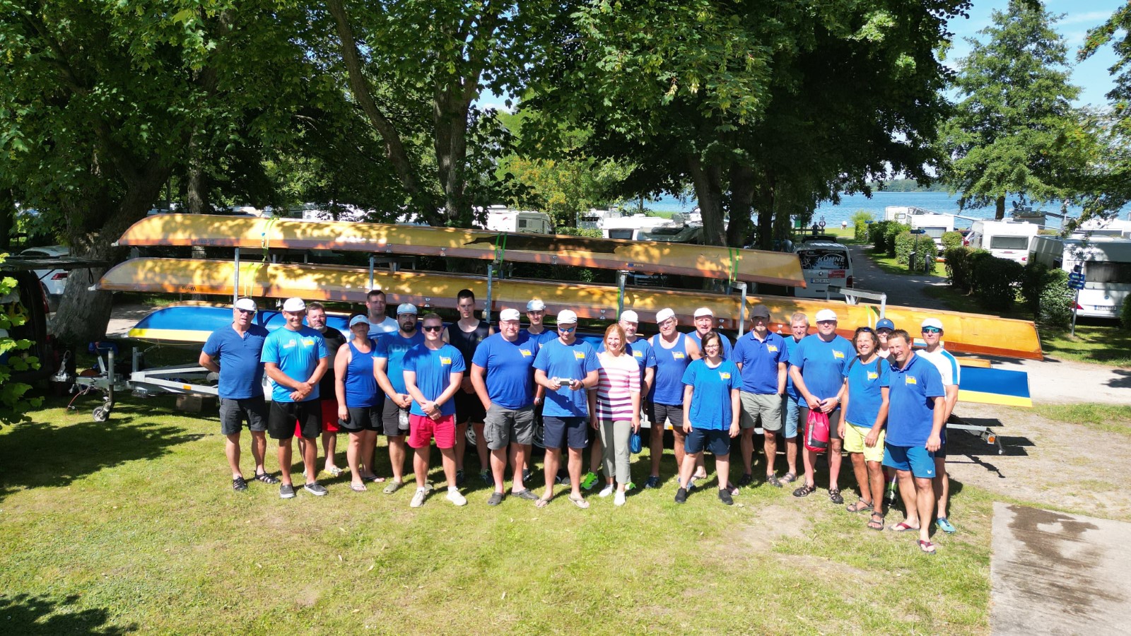 Die besuchten Zeltplätze waren einer schöner als der andere, mit ansprechenden sanitären Anlagen, Strom und Wasser an jedem Platz verfügbar. Für die letzten paar Kilometer war wieder ein strahlender Morgen im Angebot. Ein spiegelglatter See und sommerliche Temperaturen luden zum Bade. Dementsprechend verabredete man sich zur Badepause am Plauer Werder. Seit der Einfahrt in die Müritz war die Wasserqualität der Seen erstaunlich gut, meistens konnte man bis auf den Grund sehen. Einigen Wellen musste man dank ignoranter PS-Helden noch ausweichen, dann war das letzte Etappenziel in Sicht. Die Badewiese des Campingplatzes war zum Glück nicht übermäßig belegt. Im Schatten fanden die Boote genügend Platz zum Abriggern, während die Fahrzeuge aus Mirow geholt wurden. Der Bootshänger musste noch fix bis zur 13-Uhr-Mittagsruhe in Position gebracht werden, was nicht ganz einfach war. Nun hatte man 2 Stunden Zeit für das Beladen und das (erstaunlich leckere) Mittagessen in der nächstbesten Pizza- und Burgerbar. Schnell noch das obligatorische Gruppenfoto vor dem Hänger und ab auf die Piste. Gnädigerweise hielt sich die Verzögerung bei Werder in Grenzen, so dass alle einigermaßen pünktlich und wohlbehalten zu Hause ankamen. Ein großes Lob und Dankeschön geht raus an den Wanderruderwart und Fahrtenleiter Niclas, die Landdienstler und Hängerfahrer Veikko, Matthias und Jürgen, die PKW-Fahrer und alle, die ihren Teil zum Gelingen beigetragen haben.