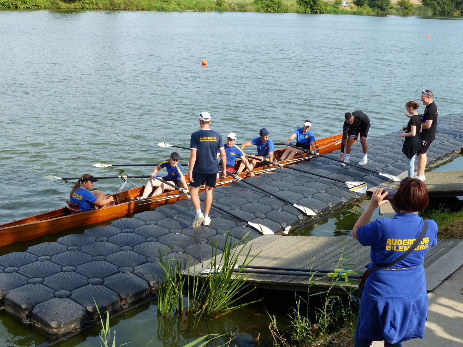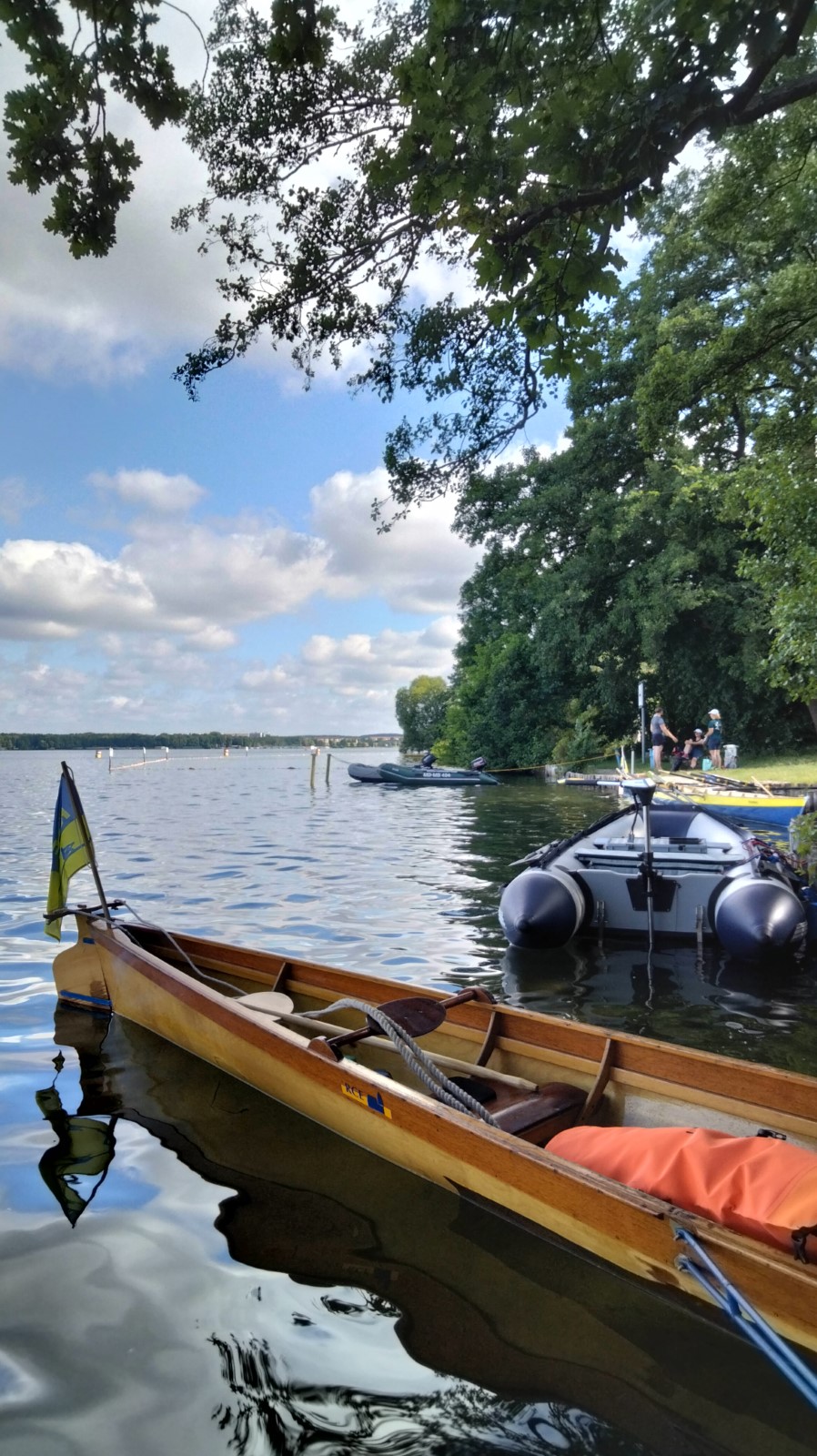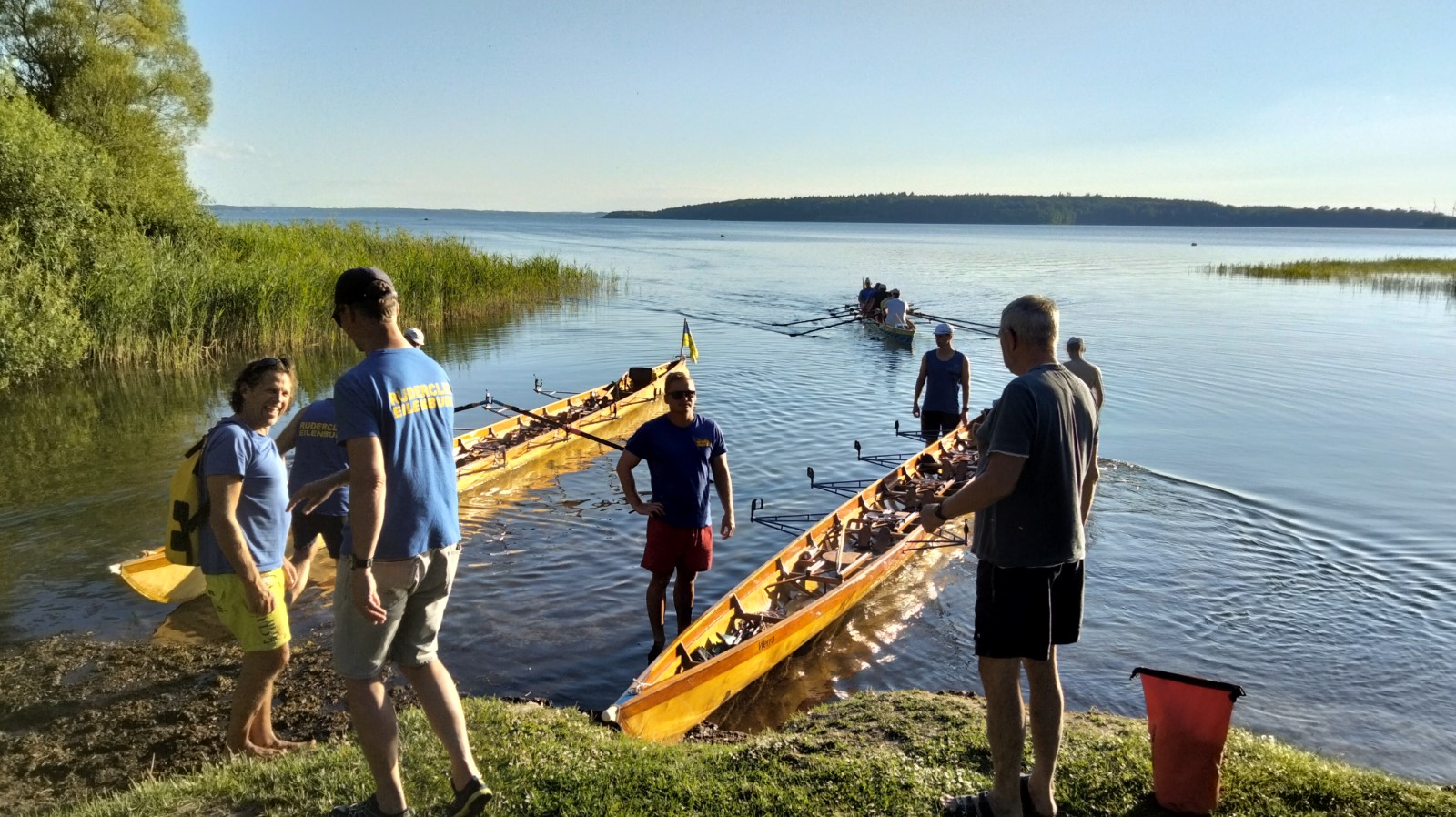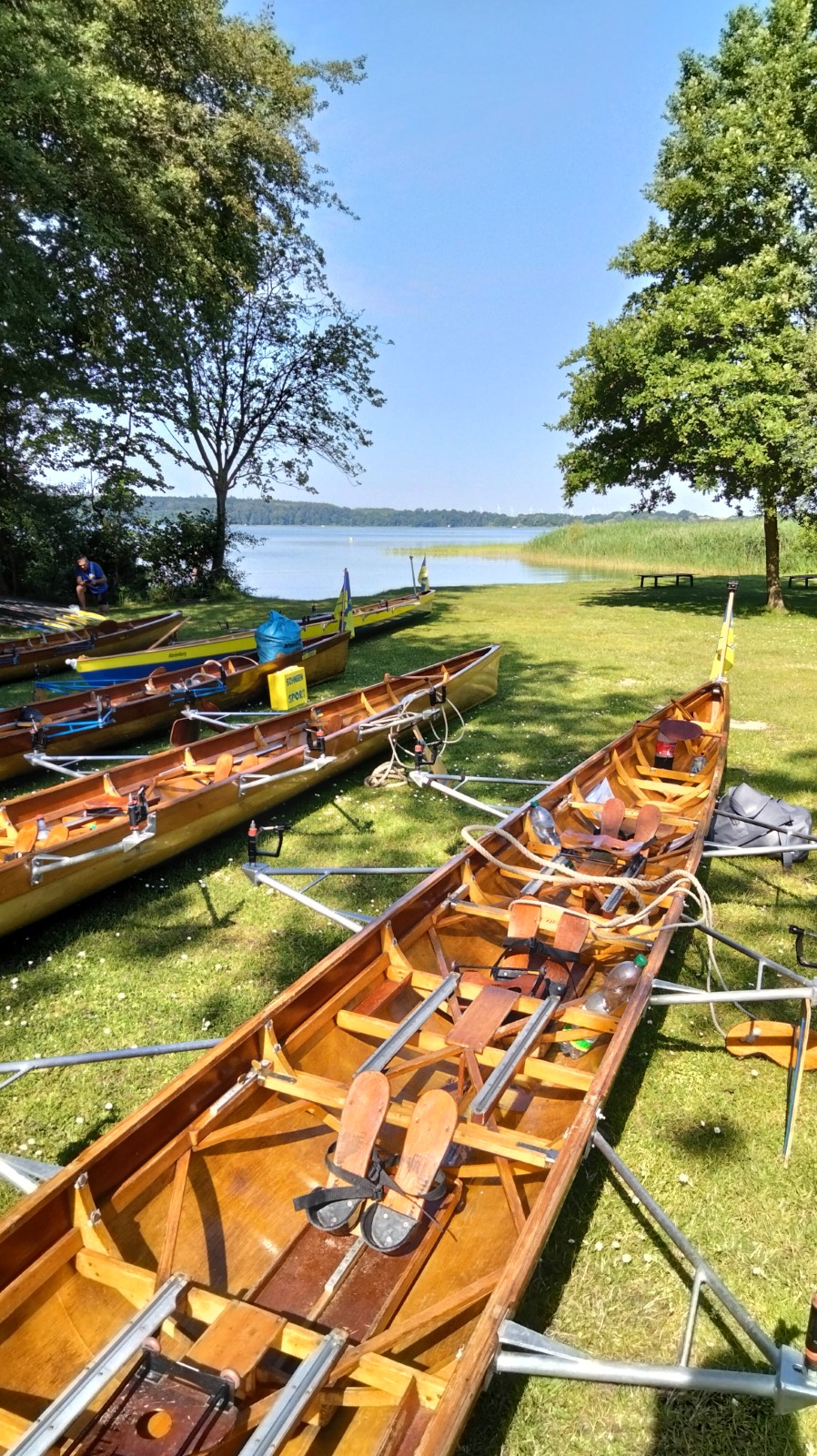 Die besuchten Zeltplätze waren einer schöner als der andere, mit ansprechenden sanitären Anlagen, Strom und Wasser an jedem Platz verfügbar. Für die letzten paar Kilometer war wieder ein strahlender Morgen im Angebot. Ein spiegelglatter See und sommerliche Temperaturen luden zum Bade. Dementsprechend verabredete man sich zur Badepause am Plauer Werder. Seit der Einfahrt in die Müritz war die Wasserqualität der Seen erstaunlich gut, meistens konnte man bis auf den Grund sehen. Einigen Wellen musste man dank ignoranter PS-Helden noch ausweichen, dann war das letzte Etappenziel in Sicht. Die Badewiese des Campingplatzes war zum Glück nicht übermäßig belegt. Im Schatten fanden die Boote genügend Platz zum Abriggern, während die Fahrzeuge aus Mirow geholt wurden. Der Bootshänger musste noch fix bis zur 13-Uhr-Mittagsruhe in Position gebracht werden, was nicht ganz einfach war. Nun hatte man 2 Stunden Zeit für das Beladen und das (erstaunlich leckere) Mittagessen in der nächstbesten Pizza- und Burgerbar. Schnell noch das obligatorische Gruppenfoto vor dem Hänger und ab auf die Piste. Gnädigerweise hielt sich die Verzögerung bei Werder in Grenzen, so dass alle einigermaßen pünktlich und wohlbehalten zu Hause ankamen. Ein großes Lob und Dankeschön geht raus an den Wanderruderwart und Fahrtenleiter Niclas, die Landdienstler und Hängerfahrer Veikko, Matthias und Jürgen, die PKW-Fahrer und alle, die ihren Teil zum Gelingen beigetragen haben.