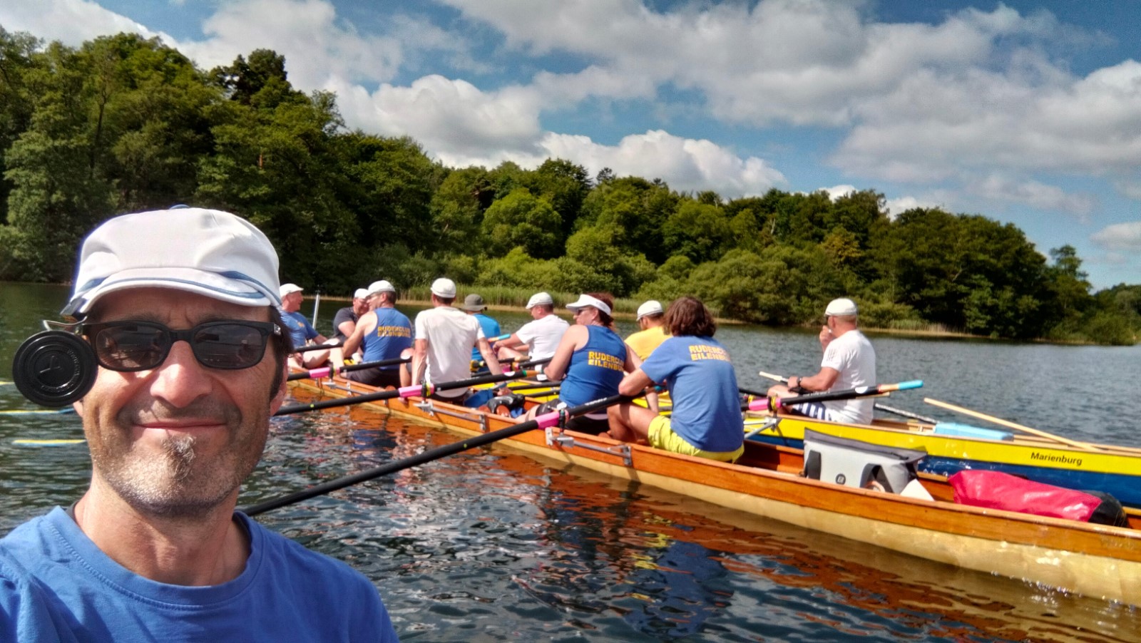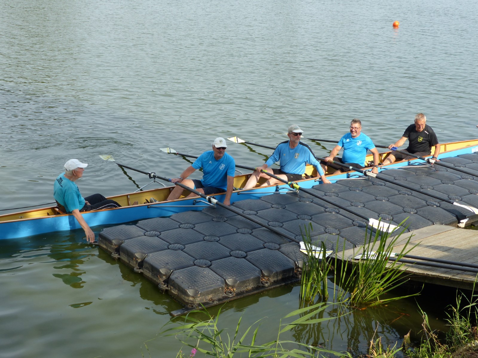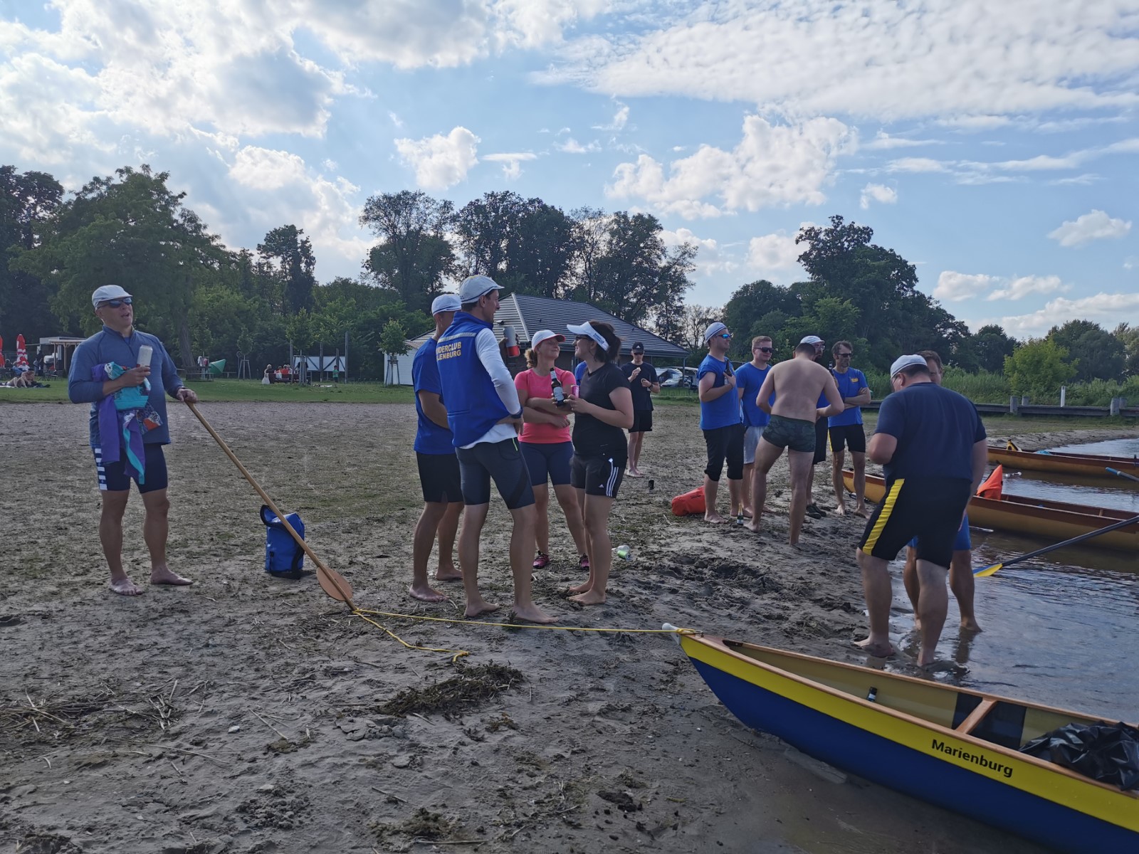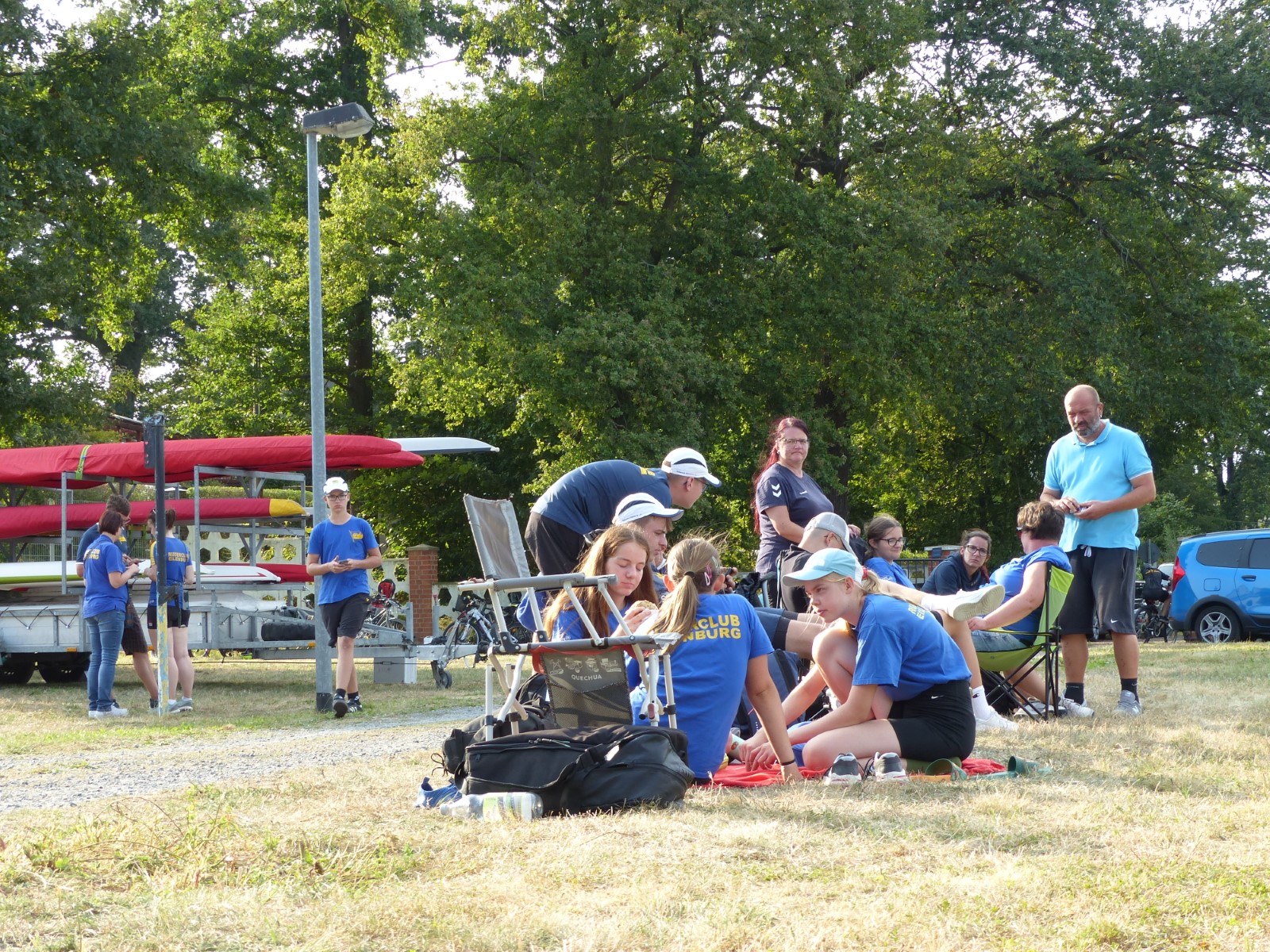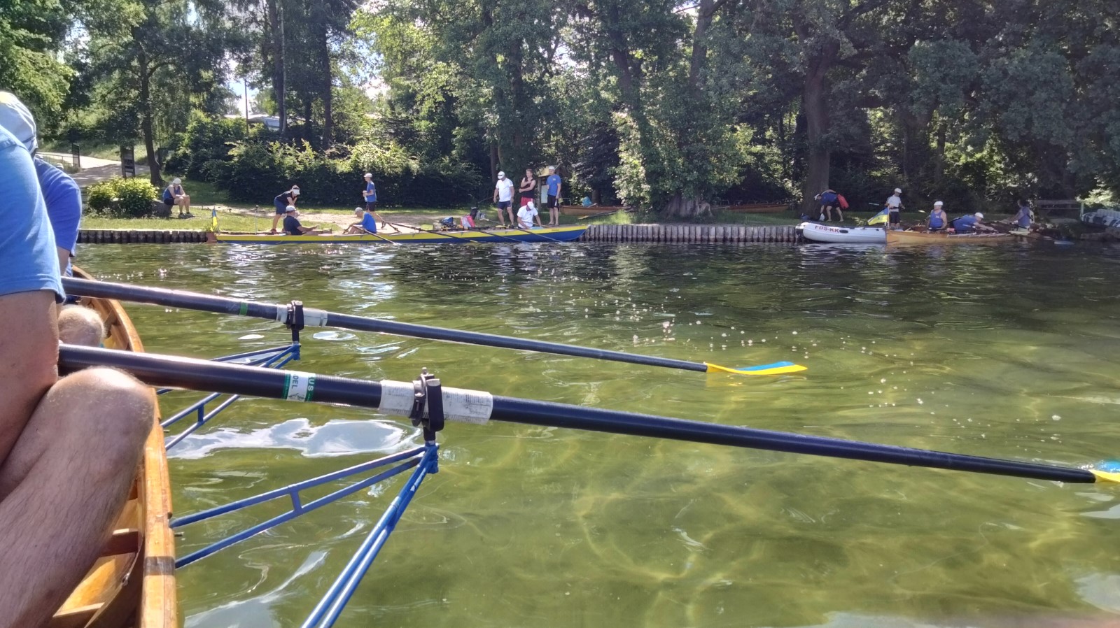 Die besuchten Zeltplätze waren einer schöner als der andere, mit ansprechenden sanitären Anlagen, Strom und Wasser an jedem Platz verfügbar. Für die letzten paar Kilometer war wieder ein strahlender Morgen im Angebot. Ein spiegelglatter See und sommerliche Temperaturen luden zum Bade. Dementsprechend verabredete man sich zur Badepause am Plauer Werder. Seit der Einfahrt in die Müritz war die Wasserqualität der Seen erstaunlich gut, meistens konnte man bis auf den Grund sehen. Einigen Wellen musste man dank ignoranter PS-Helden noch ausweichen, dann war das letzte Etappenziel in Sicht. Die Badewiese des Campingplatzes war zum Glück nicht übermäßig belegt. Im Schatten fanden die Boote genügend Platz zum Abriggern, während die Fahrzeuge aus Mirow geholt wurden. Der Bootshänger musste noch fix bis zur 13-Uhr-Mittagsruhe in Position gebracht werden, was nicht ganz einfach war. Nun hatte man 2 Stunden Zeit für das Beladen und das (erstaunlich leckere) Mittagessen in der nächstbesten Pizza- und Burgerbar. Schnell noch das obligatorische Gruppenfoto vor dem Hänger und ab auf die Piste. Gnädigerweise hielt sich die Verzögerung bei Werder in Grenzen, so dass alle einigermaßen pünktlich und wohlbehalten zu Hause ankamen. Ein großes Lob und Dankeschön geht raus an den Wanderruderwart und Fahrtenleiter Niclas, die Landdienstler und Hängerfahrer Veikko, Matthias und Jürgen, die PKW-Fahrer und alle, die ihren Teil zum Gelingen beigetragen haben.