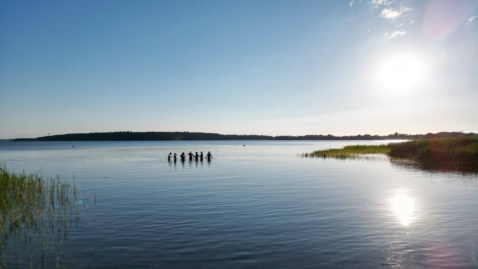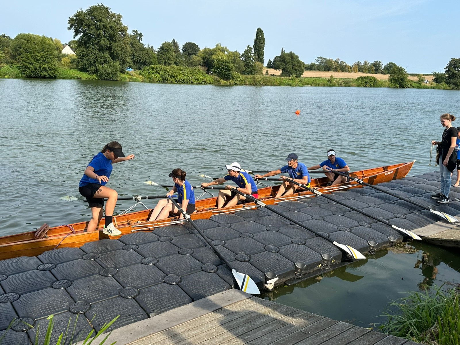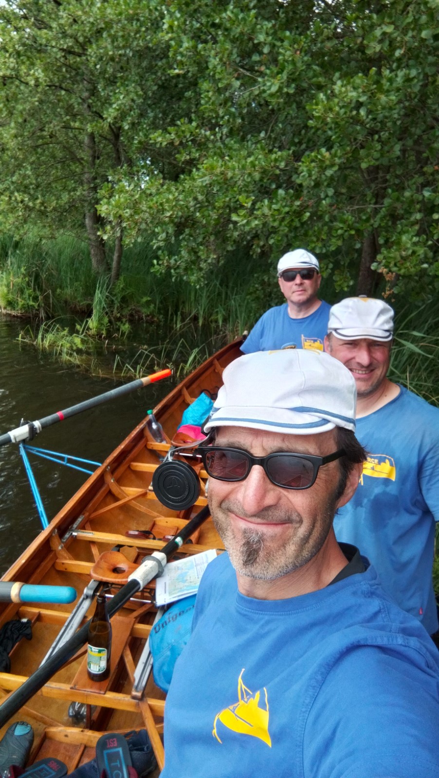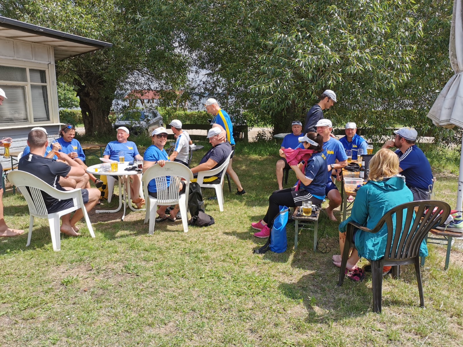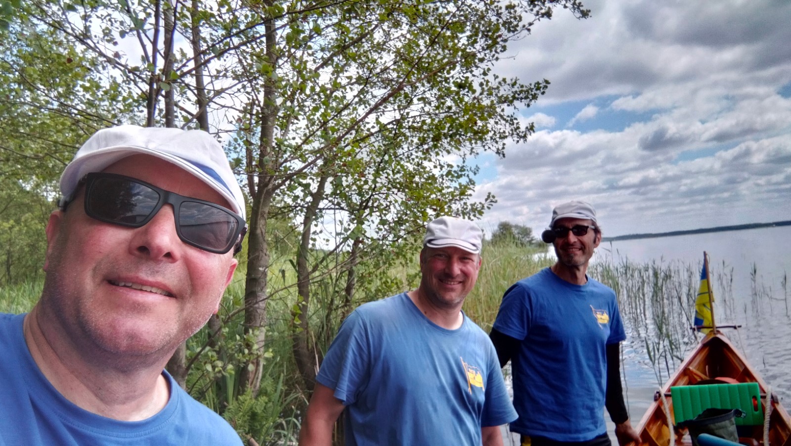Die besuchten Zeltplätze waren einer schöner als der andere, mit ansprechenden sanitären Anlagen, Strom und Wasser an jedem Platz verfügbar. Für die letzten paar Kilometer war wieder ein strahlender Morgen im Angebot. Ein spiegelglatter See und sommerliche Temperaturen luden zum Bade. Dementsprechend verabredete man sich zur Badepause am Plauer Werder. Seit der Einfahrt in die Müritz war die Wasserqualität der Seen erstaunlich gut, meistens konnte man bis auf den Grund sehen. Einigen Wellen musste man dank ignoranter PS-Helden noch ausweichen, dann war das letzte Etappenziel in Sicht. Die Badewiese des Campingplatzes war zum Glück nicht übermäßig belegt. Im Schatten fanden die Boote genügend Platz zum Abriggern, während die Fahrzeuge aus Mirow geholt wurden. Der Bootshänger musste noch fix bis zur 13-Uhr-Mittagsruhe in Position gebracht werden, was nicht ganz einfach war. Nun hatte man 2 Stunden Zeit für das Beladen und das (erstaunlich leckere) Mittagessen in der nächstbesten Pizza- und Burgerbar. Schnell noch das obligatorische Gruppenfoto vor dem Hänger und ab auf die Piste. Gnädigerweise hielt sich die Verzögerung bei Werder in Grenzen, so dass alle einigermaßen pünktlich und wohlbehalten zu Hause ankamen. Ein großes Lob und Dankeschön geht raus an den Wanderruderwart und Fahrtenleiter Niclas, die Landdienstler und Hängerfahrer Veikko, Matthias und Jürgen, die PKW-Fahrer und alle, die ihren Teil zum Gelingen beigetragen haben.