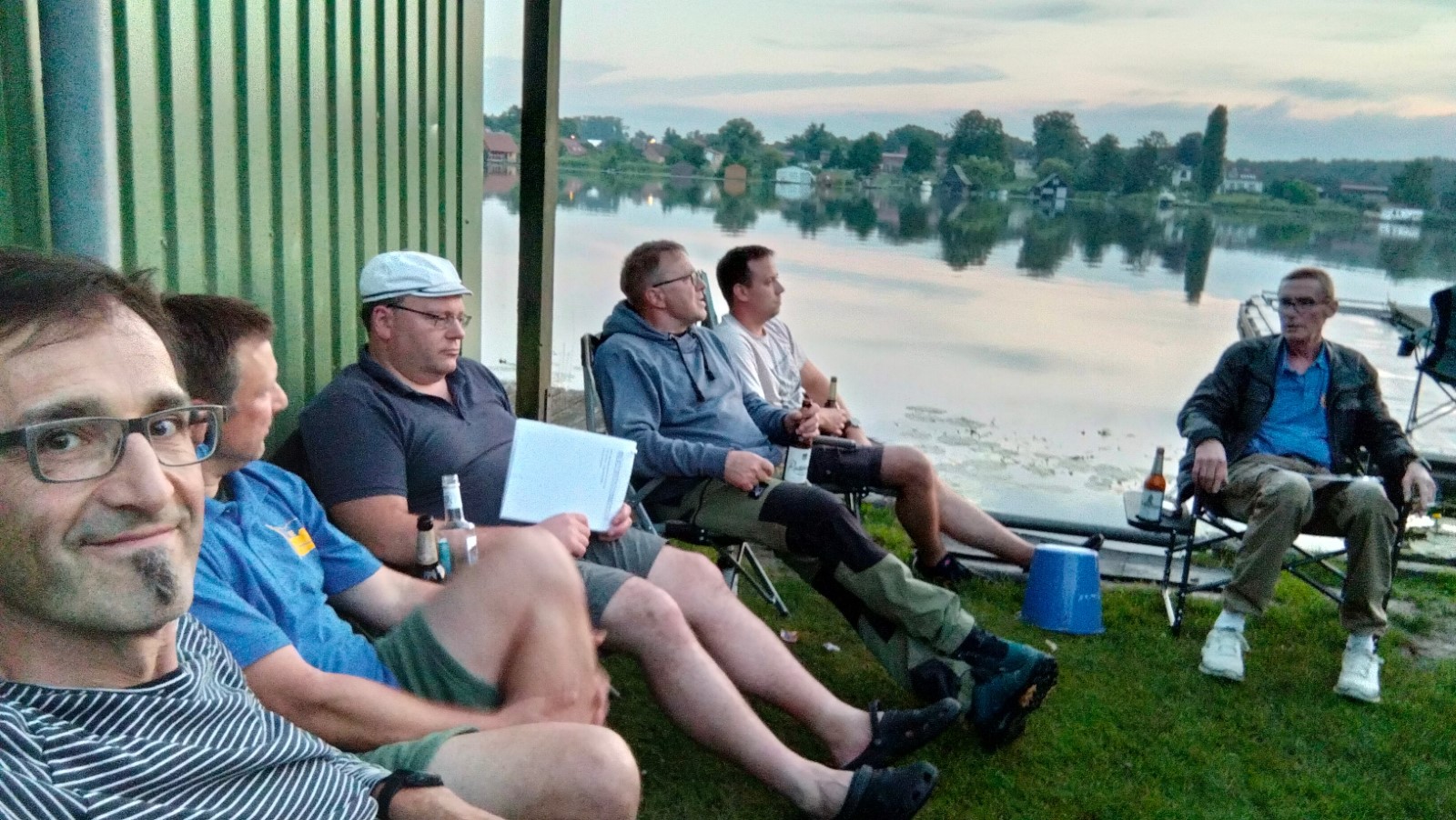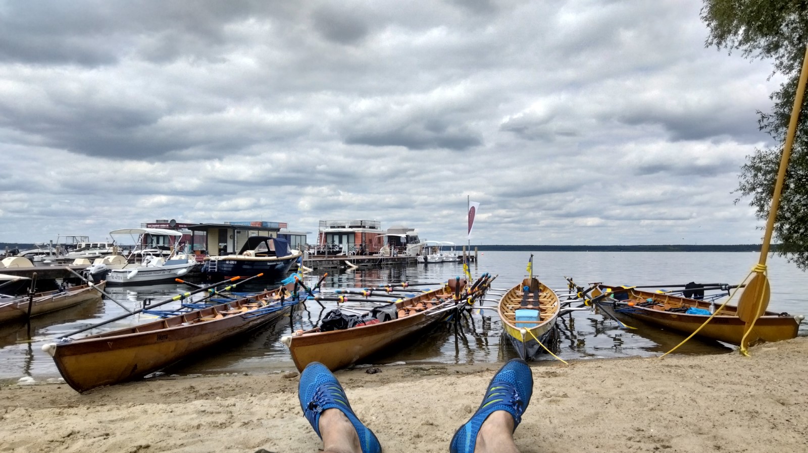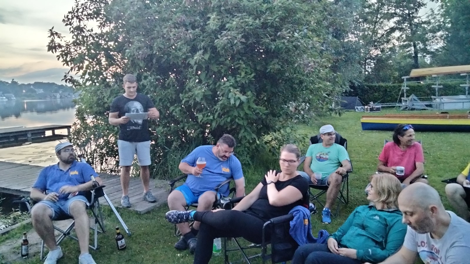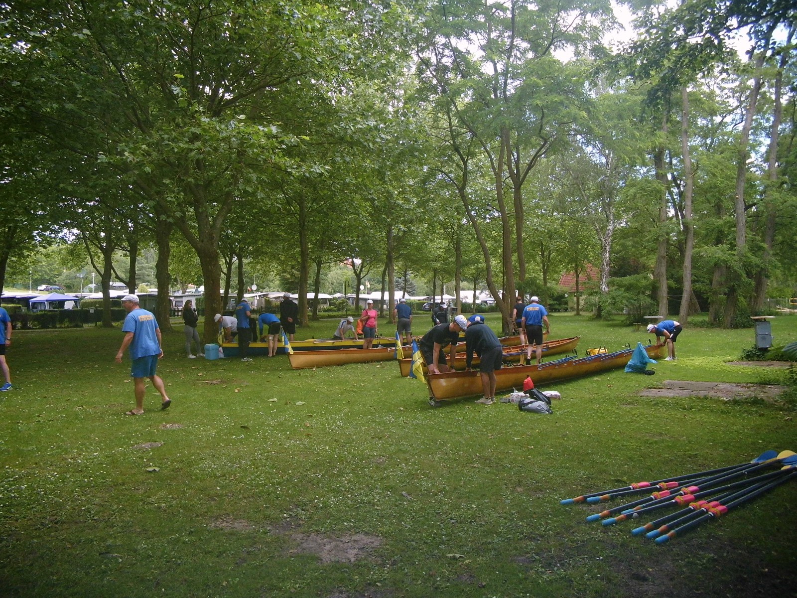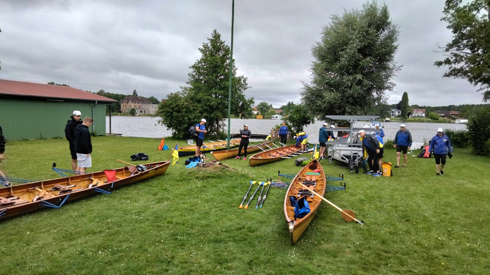 Zwischen 13 und 15 Uhr fanden sich die meisten auf der Piste ein. Aufgrund hoher Bustransfer-Kosten wurde im Vorfeld die individuelle Variante favorisert. Teilweise waren heftige Unwetter zu durchfahren. Stau auf der A10-Dauerbaustelle bei Werder, Umfahrungen genauso dicht. Einige meldeten sich vorsichtshalber von der reservierten Abendgastronomie ab und landeten in Neuruppin beim Griechen. Zufällig nebenan der aus alten Zeiten bekannte Ruderclub. Quartier dann bei den Mirower Ruderkameraden. Erstmal Hänger abladen, die einen bauten Zelte auf, andere nahmen mit der Gemeinschaftsbutze Vorlieb. Themen der ersten Lagebesprechung: wetterbedingte Routenänderung und Zeitdruck wegen hohem erwartetem Andrang bei einziger Schleuse. Im letzten Mittsommerlicht hatte man die meisten Boote noch fix angeriggert. Nächtliches Finale in gemeinsamer Runde am Steg.