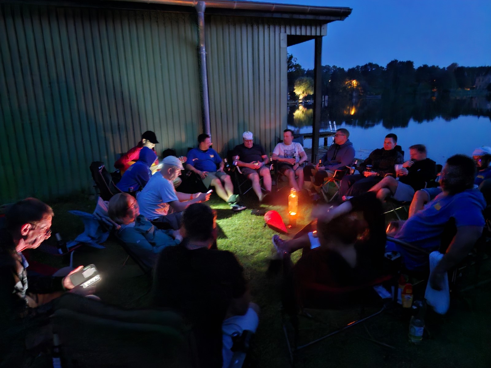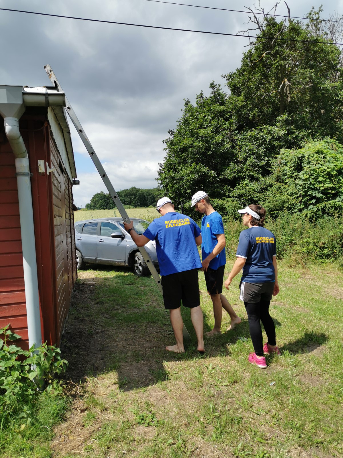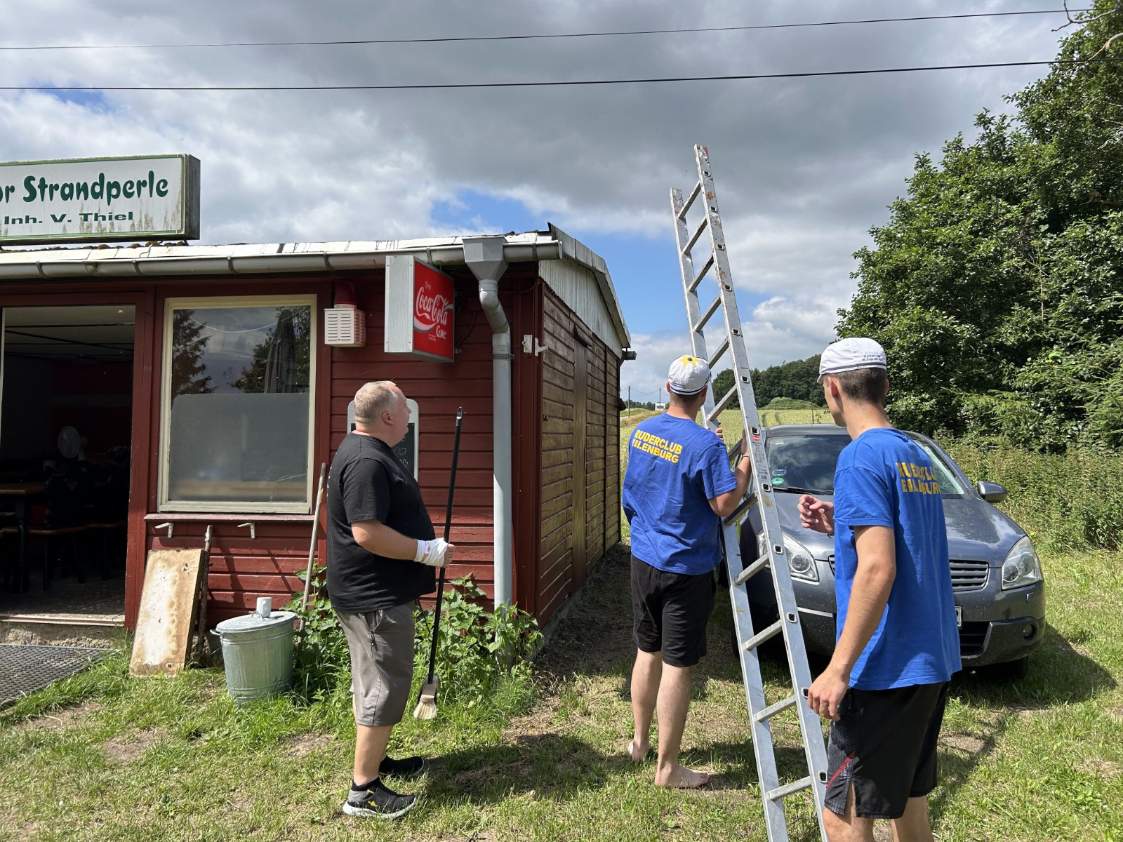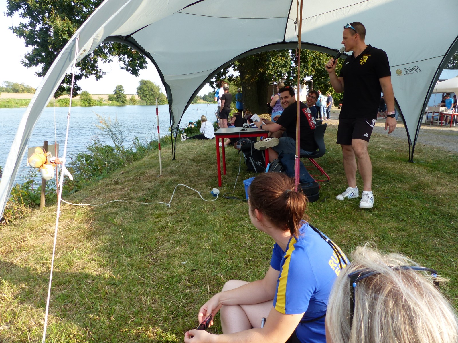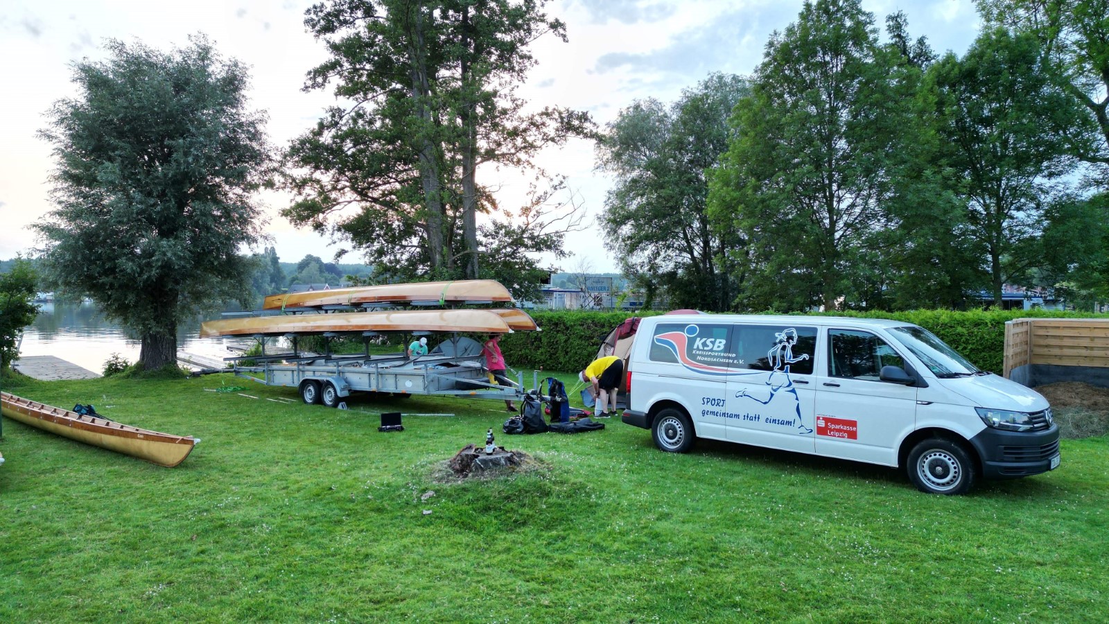 Zwischen 13 und 15 Uhr fanden sich die meisten auf der Piste ein. Aufgrund hoher Bustransfer-Kosten wurde im Vorfeld die individuelle Variante favorisert. Teilweise waren heftige Unwetter zu durchfahren. Stau auf der A10-Dauerbaustelle bei Werder, Umfahrungen genauso dicht. Einige meldeten sich vorsichtshalber von der reservierten Abendgastronomie ab und landeten in Neuruppin beim Griechen. Zufällig nebenan der aus alten Zeiten bekannte Ruderclub. Quartier dann bei den Mirower Ruderkameraden. Erstmal Hänger abladen, die einen bauten Zelte auf, andere nahmen mit der Gemeinschaftsbutze Vorlieb. Themen der ersten Lagebesprechung: wetterbedingte Routenänderung und Zeitdruck wegen hohem erwartetem Andrang bei einziger Schleuse. Im letzten Mittsommerlicht hatte man die meisten Boote noch fix angeriggert. Nächtliches Finale in gemeinsamer Runde am Steg.