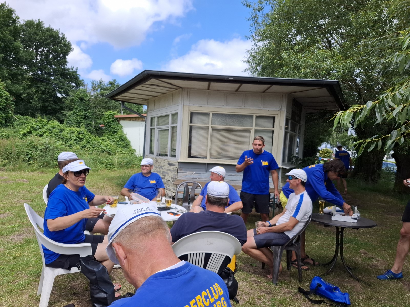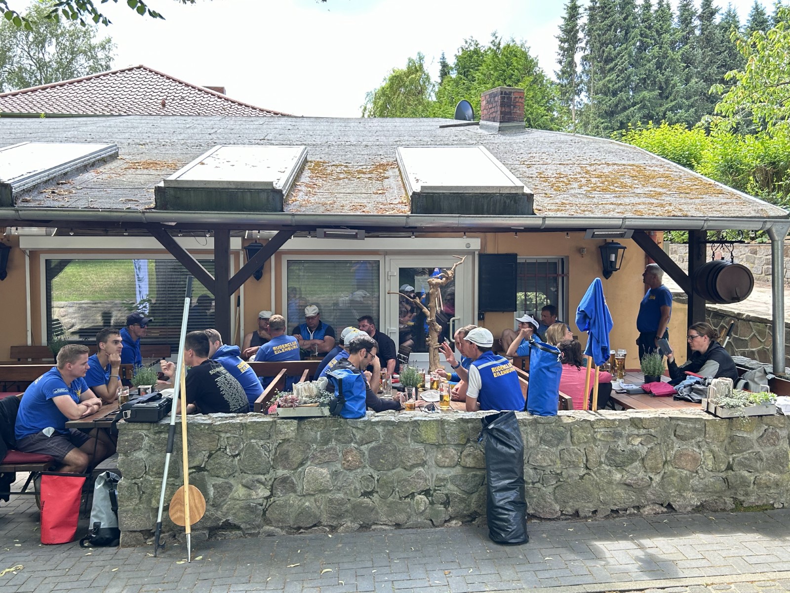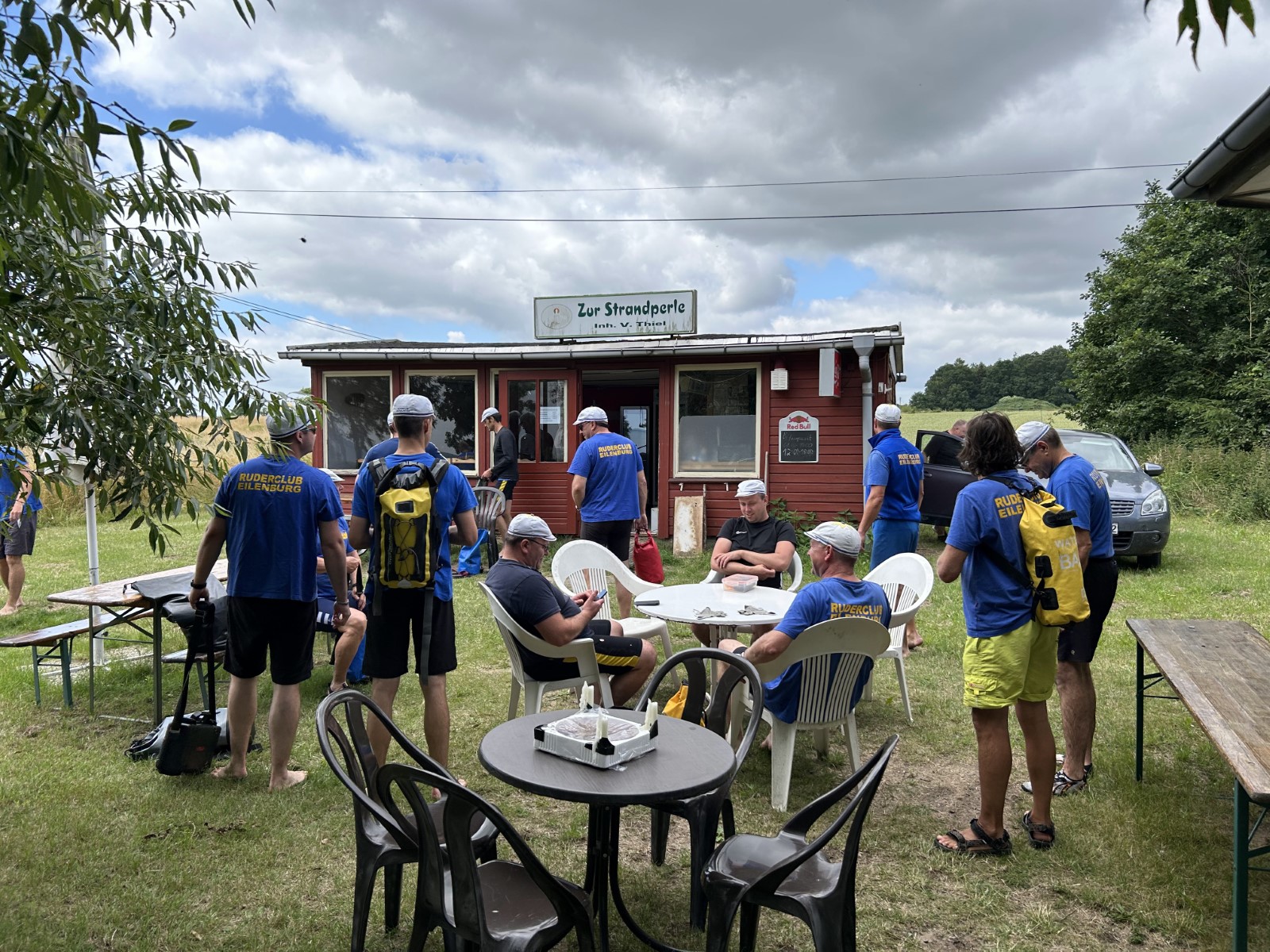 Derweil erfolgten im Bootshaus die Vorbereitungen des Mittagstischs. Das Tresen- und Küchenteam war dankenswerter Weise in die Bresche gesprungen. Diese hatte sich leider mit dem wohlverdienten Ruhestand unserer Haus- und Hof- Fleischerei Krause aufgetan. Doch nun wurden alsbald Rudernde wie Landläufige von Rinderrouladen mit Rotkraut und Klößen ins Bootshaus gelockt.