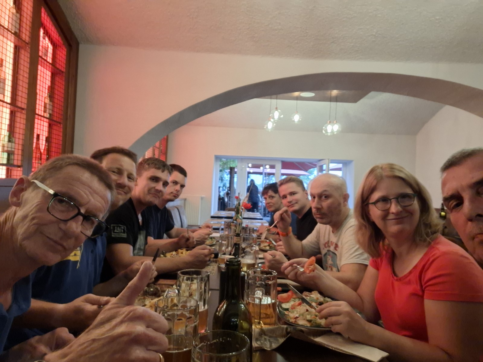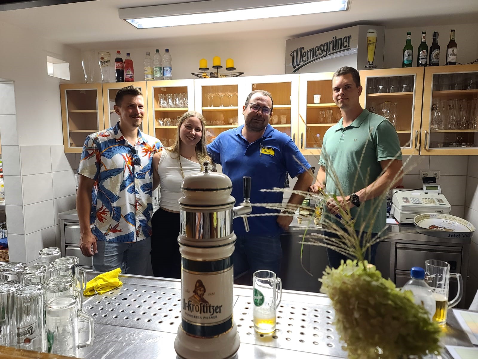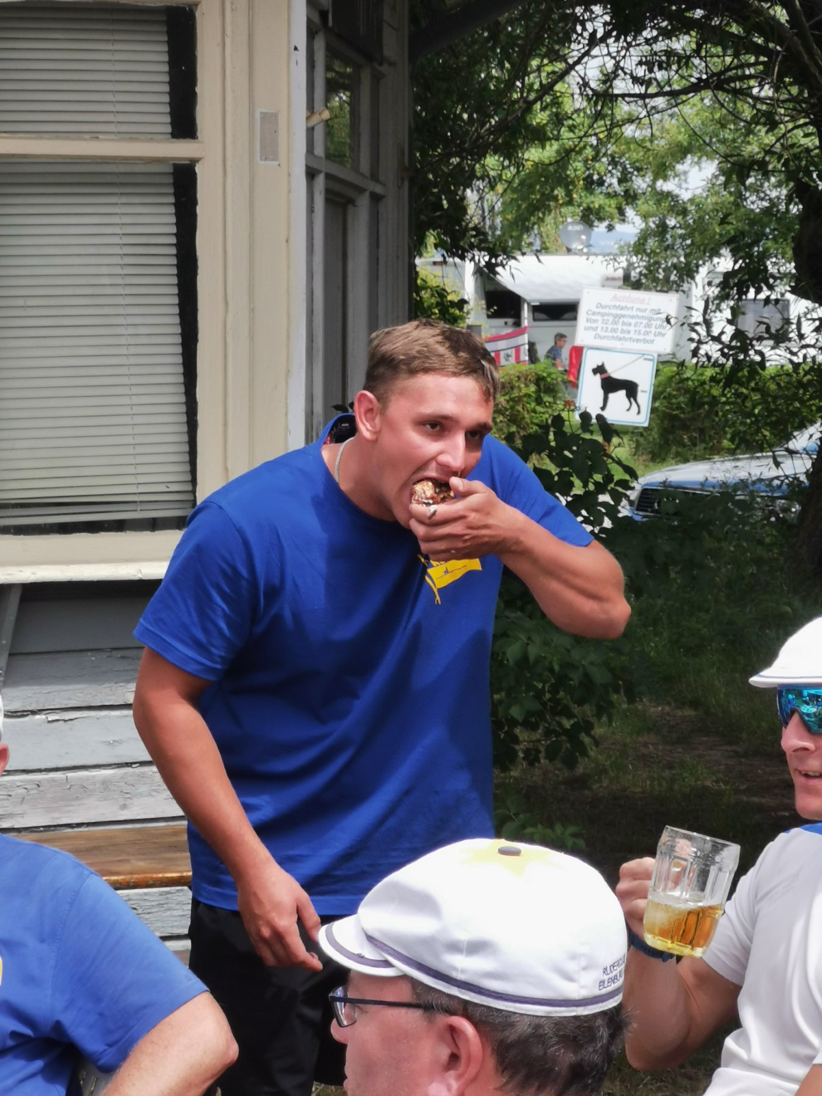 Derweil erfolgten im Bootshaus die Vorbereitungen des Mittagstischs. Das Tresen- und Küchenteam war dankenswerter Weise in die Bresche gesprungen. Diese hatte sich leider mit dem wohlverdienten Ruhestand unserer Haus- und Hof- Fleischerei Krause aufgetan. Doch nun wurden alsbald Rudernde wie Landläufige von Rinderrouladen mit Rotkraut und Klößen ins Bootshaus gelockt.