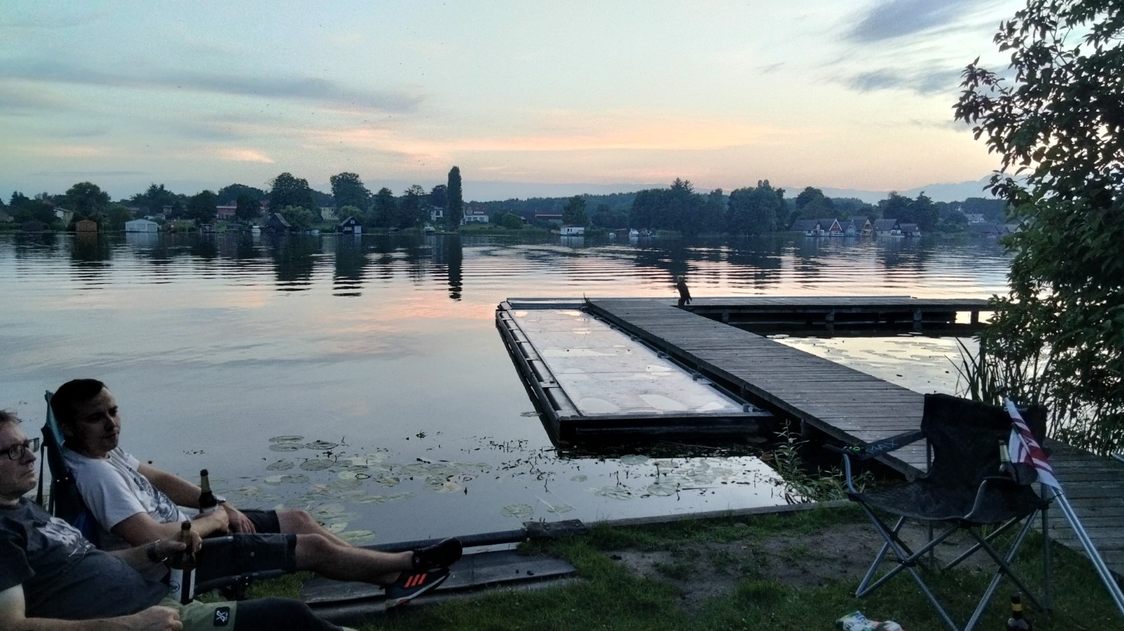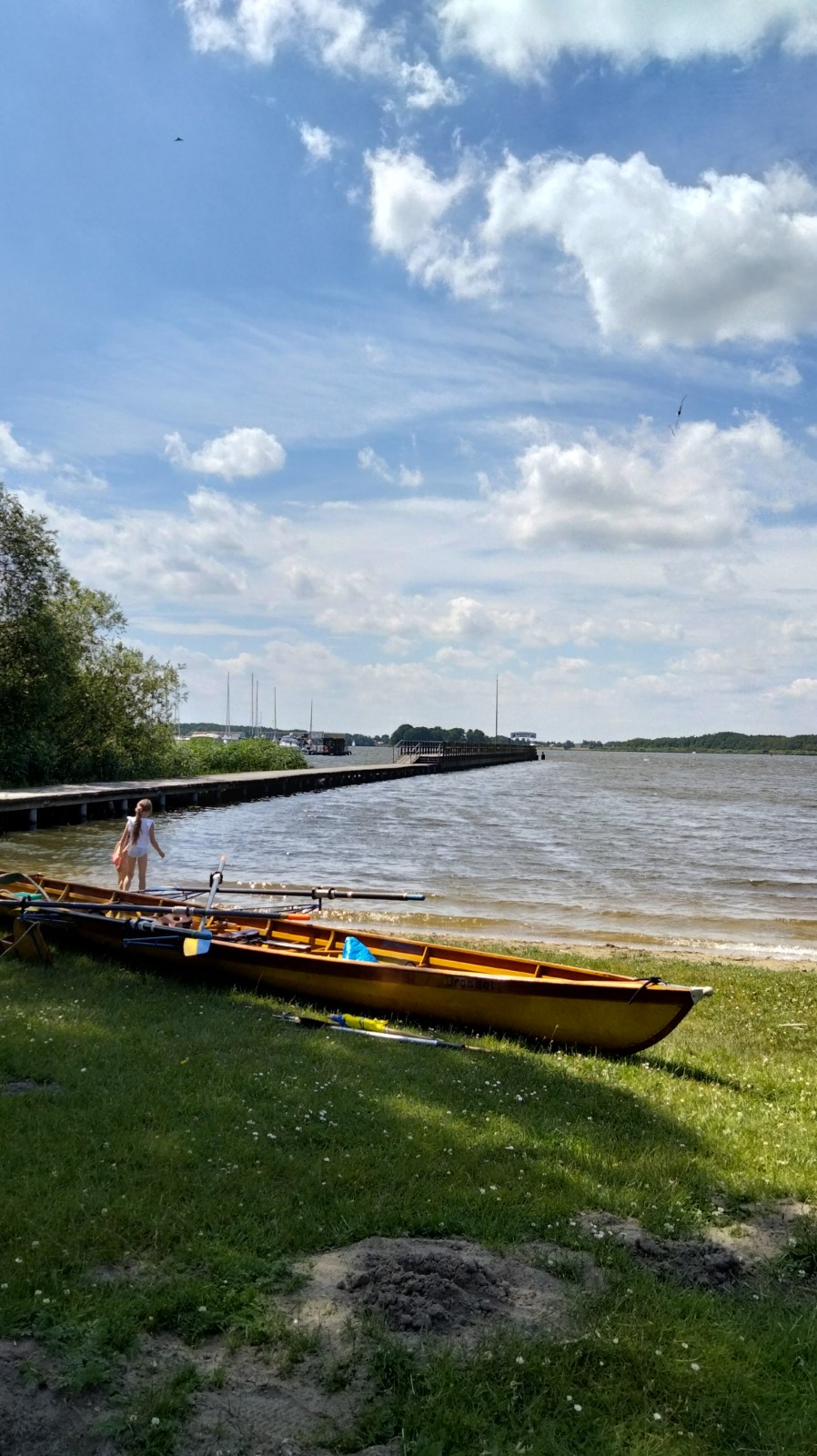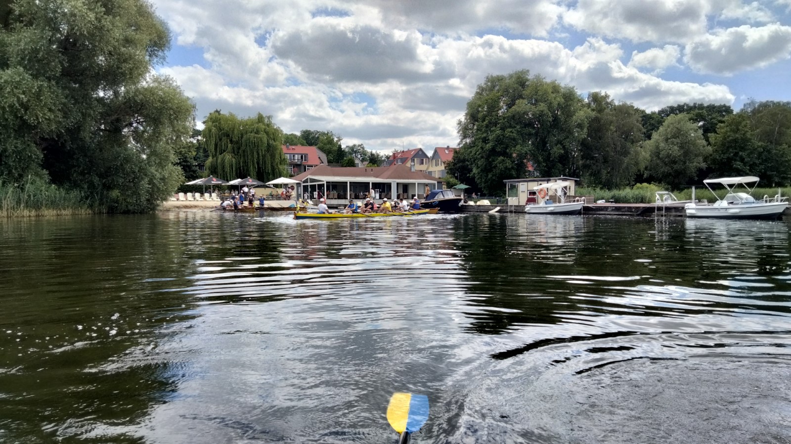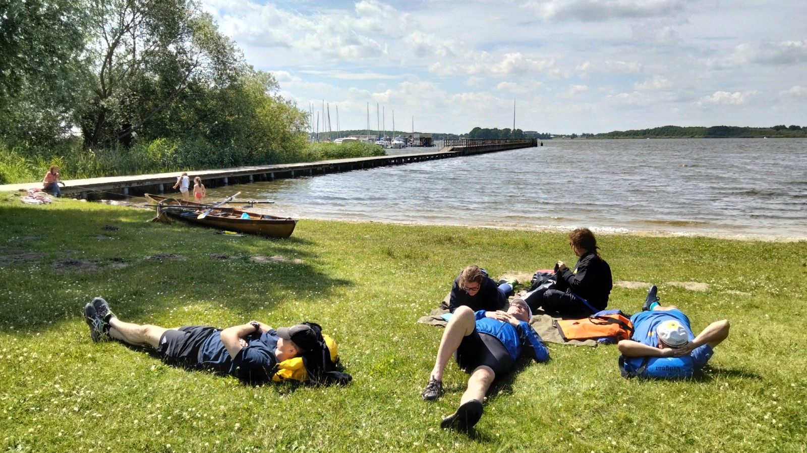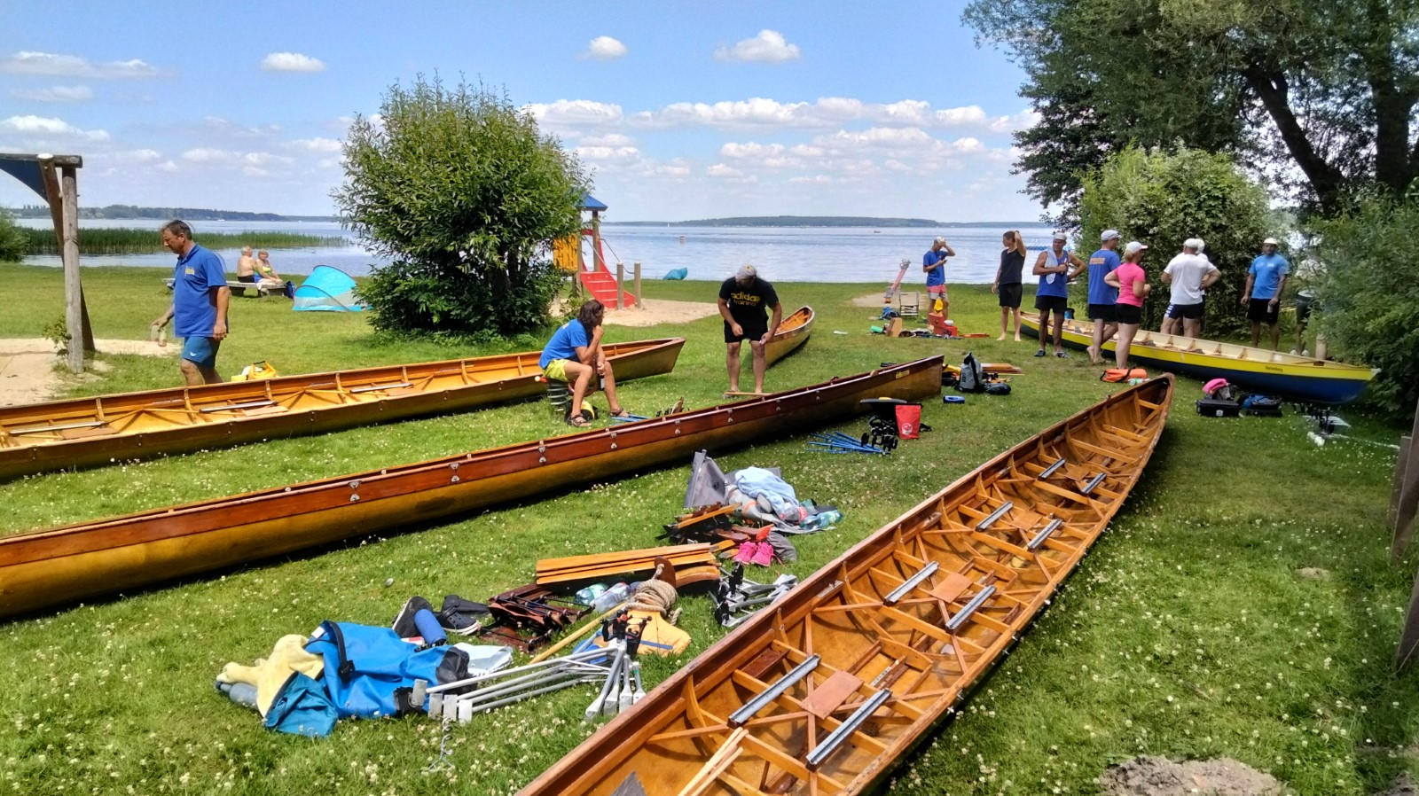Etwas aufgeregt war man schon ob der 30 Kilometer, die an diesem Tag geschafft werden mussten. Jedoch hatte der Wind sich beruhigt, die Strecke führte lediglich über mittelgroße Gewässer, bei Sonnenschein und ein paar Wölkchen. Wie beim Packen und Verladen, hatte sich auch nach dem Einsteigen auf dem Wasser eine gewisse Routine durchgesetzt. Hin und wieder musste man sich mit Wellen von Yachtkapitänen und Ausflugsdampfern arrangieren, insbesondere auf den schmaleren Verbindungen um Kölpin- und Fleesensee herum. Überpünktlich nahm die Spitzengruppe Kurs auf die Seewirtschaft in Untergöhren und gönnte sich noch einen Abstecher in den gediegenen Robinson-Beachclub. In der Wirtschaft wartete dann ein pfiffiger Kellner mit perfekt arrangierter langer Tafel am hauseigenen Sandstrand und einem sehr leckeren Mittagsmahl auf uns. Wahlweise gab es noch Liegestühle oder schattige Rasenflächen obendrauf. Der Abschied fiel nicht leicht, die Neugier trieb die Boote dann noch Richtung Malchow mit der Frage: Werden wir an der Drehbrücke lange warten müssen? Dort angekommen, war das Thema schnell erledigt, die Durchfahrt auch in geschlossenem Zustand kein Problem. Im Stadthafen war jede Menge Platz zum Liegen vorhanden. Der rührige Hafenmeister wies trotzdem jedes Boot ein, um das Risiko zu minimieren, von einem Freizeitskipper versenkt zu werden. Vom Freisitz des nahen Eiscafés „Al Porto“ behielten wir unsere Schmuckstücke sicherheitshalber im Auge. Außerdem konnten wir beobachten, wie sich vor der Brückenöffnung der Schiffsverkehr erheblich staute. Ein Glück, dass wir hier schon durch waren! Danach ging es durch Recken und Petersdorfer See mit der A15-Brücke in Richtung Tagesziel, nicht ohne in der Lenzer Hafengaststätte kurz vor Ladenschluss noch mal aufzutanken. Die Sonne stand schon etwas tiefer über dem Plauer See, als wir am Naturcamping ankamen. Nach dem Bade und Zeltaufbau verbrachte man den Abend mit Speisung aus der Kiste, dem Warten auf den Lieferservice und Dahindämmern. Der Tag war lang gewesen.