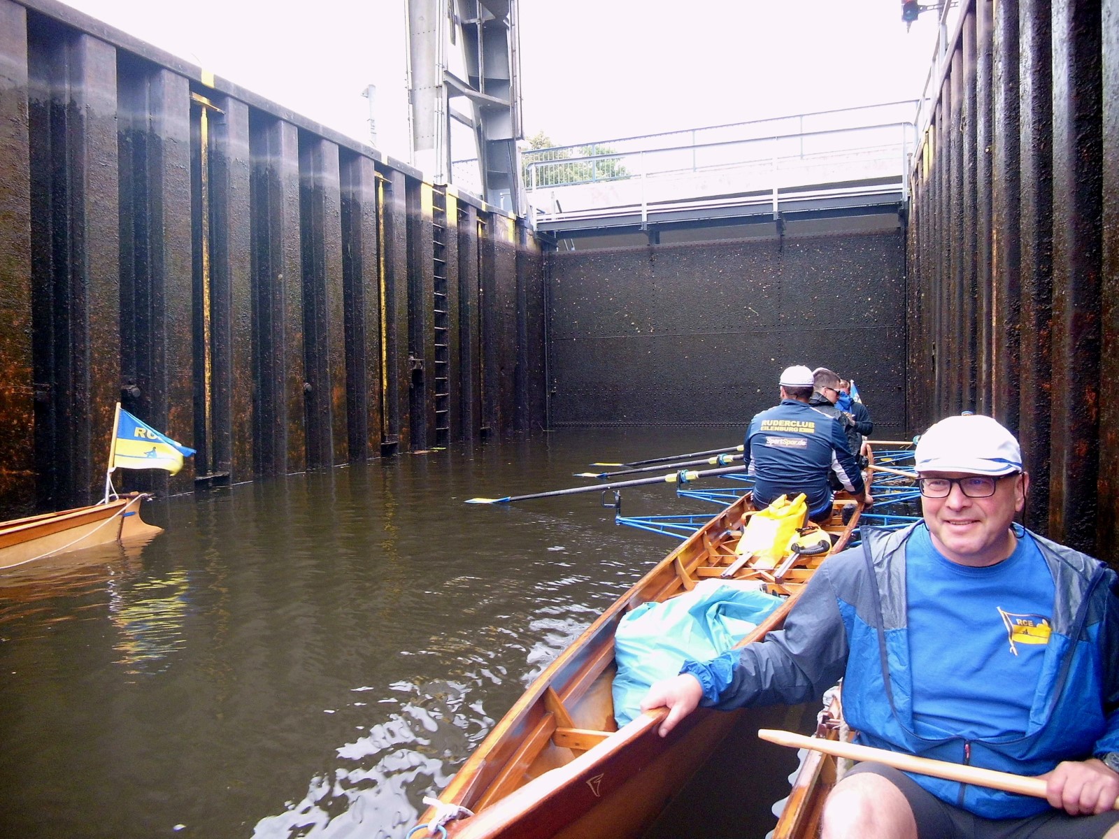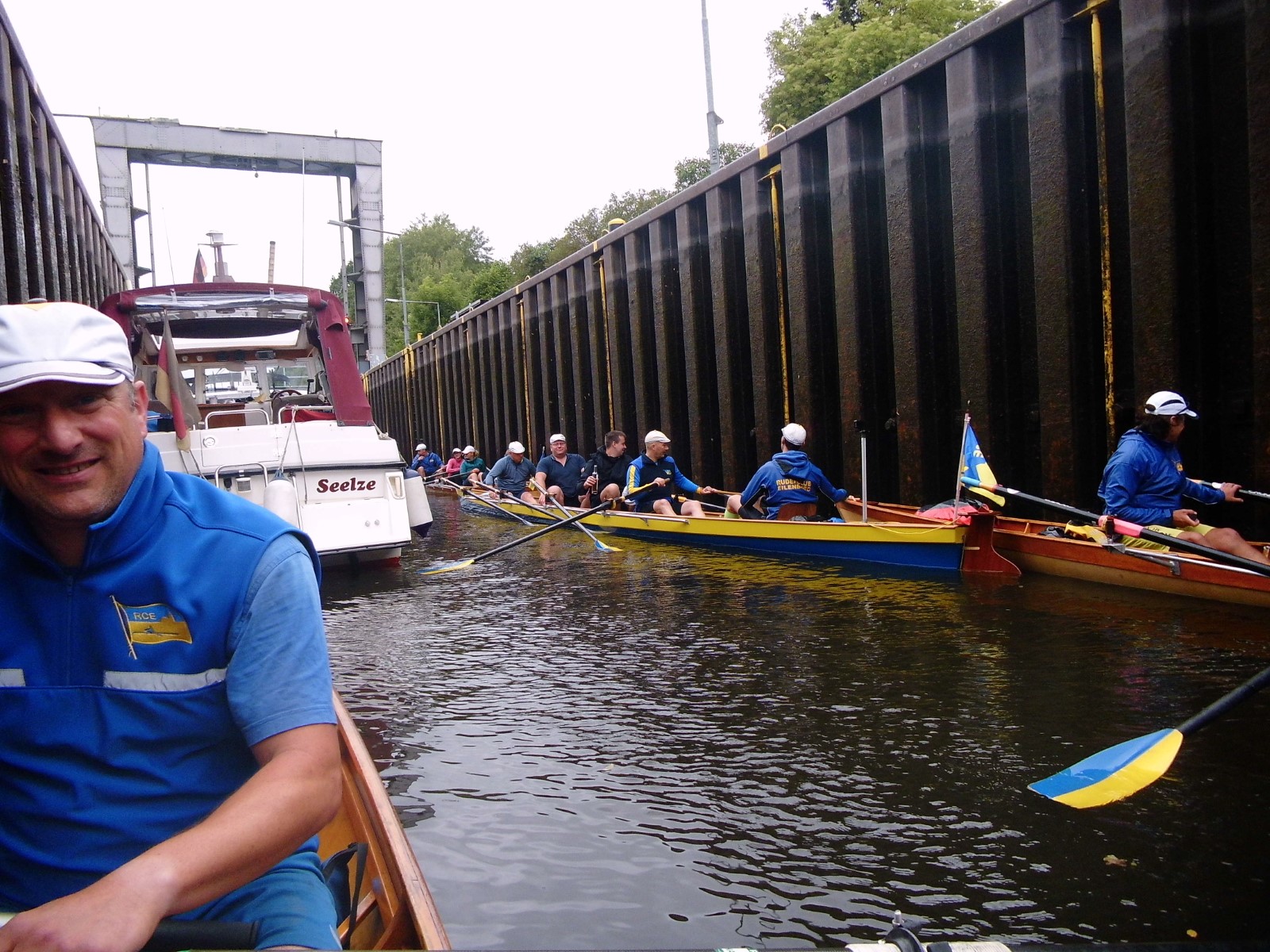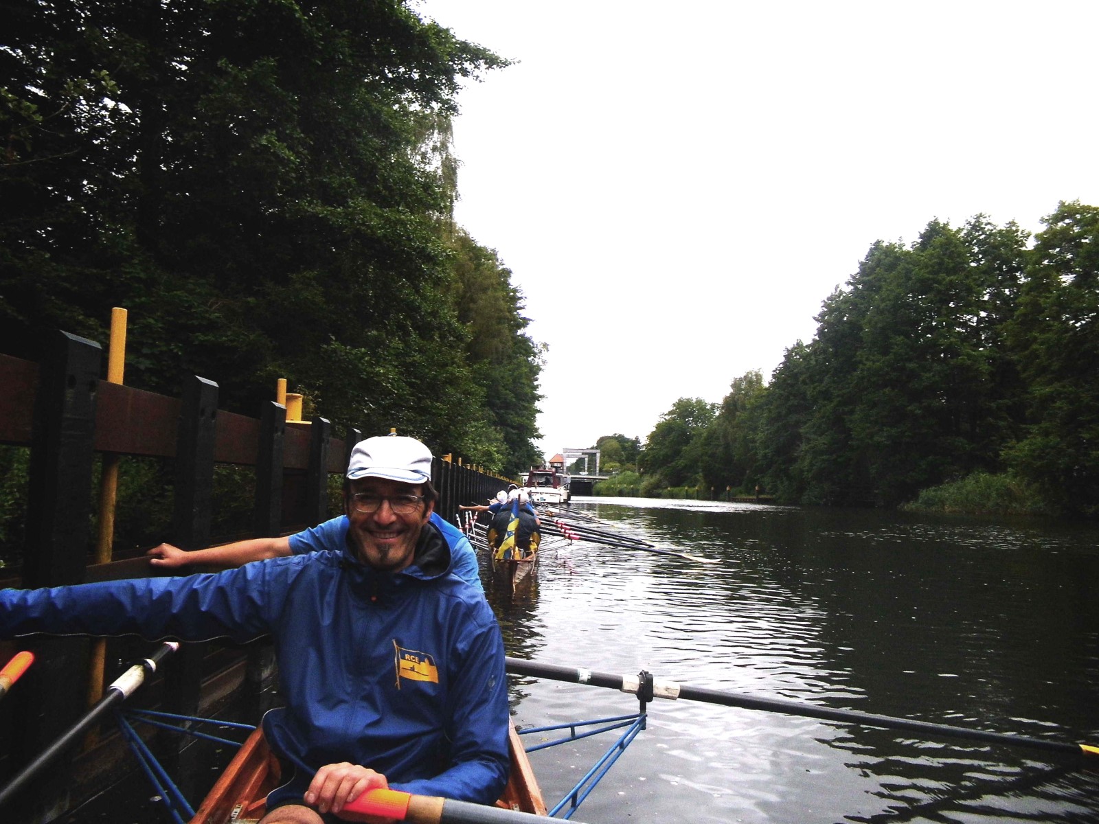 Windig, bewölkt, leicht nieselig. Angestrebte Startzeit aller Boote auf Wasser nur um 30 Minuten verfehlt. An der nahen Schleuse sah es noch entspannt aus. Man wartete geduldig auf die Öffnung, musste dann aber lautstark zwei Großbootkapitäne aus dem Überholmodus zurückpfeifen. Unterstützung gab es von der patenten Schleusenwärterin. So wurde die erste Hürde des Tages halbwegs charmant genommen. Es folgte mehrere entspannte Kilometer auf dem Kanal, der sich seit der letzten Begegnung wegen zunehmenden Baumbestandes positiv entwickelt hat.