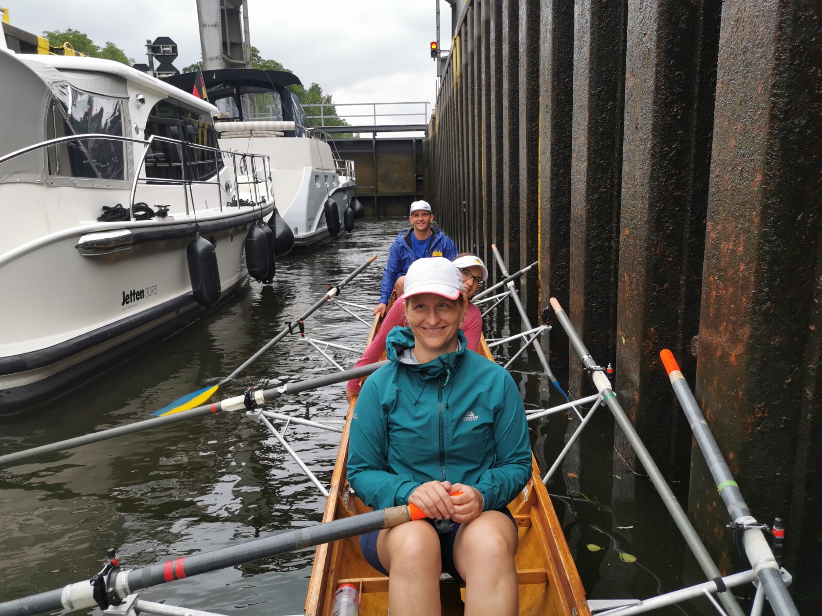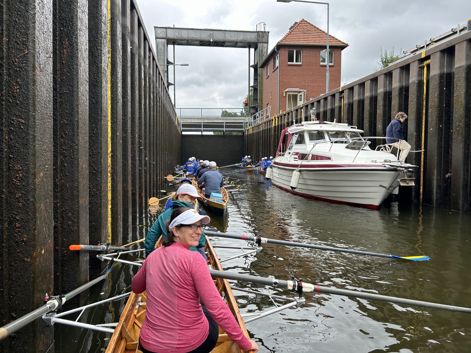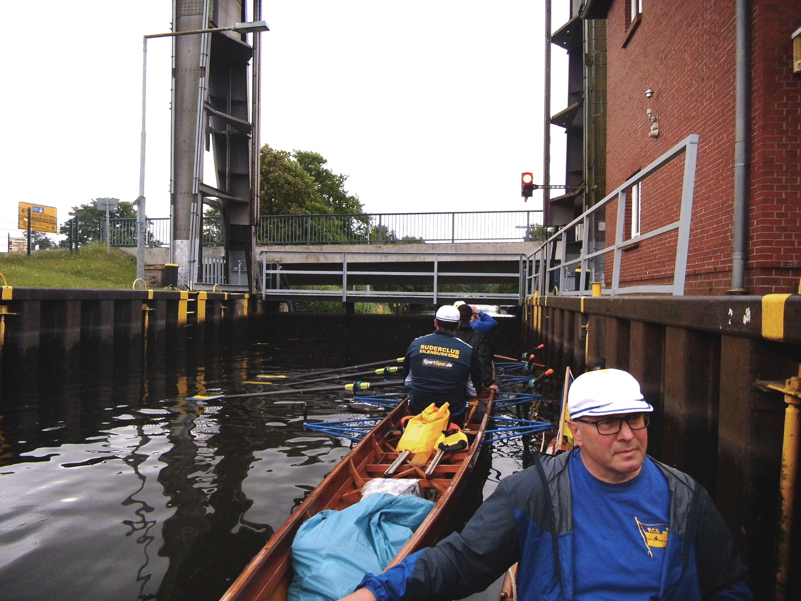 Windig, bewölkt, leicht nieselig. Angestrebte Startzeit aller Boote auf Wasser nur um 30 Minuten verfehlt. An der nahen Schleuse sah es noch entspannt aus. Man wartete geduldig auf die Öffnung, musste dann aber lautstark zwei Großbootkapitäne aus dem Überholmodus zurückpfeifen. Unterstützung gab es von der patenten Schleusenwärterin. So wurde die erste Hürde des Tages halbwegs charmant genommen. Es folgte mehrere entspannte Kilometer auf dem Kanal, der sich seit der letzten Begegnung wegen zunehmenden Baumbestandes positiv entwickelt hat.