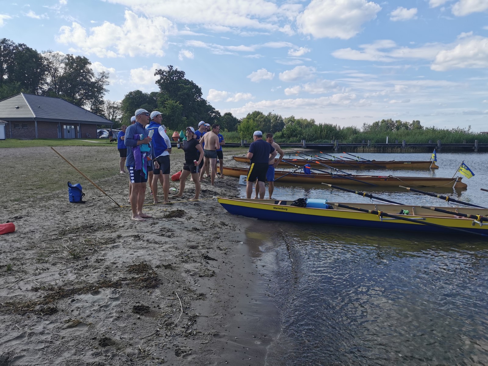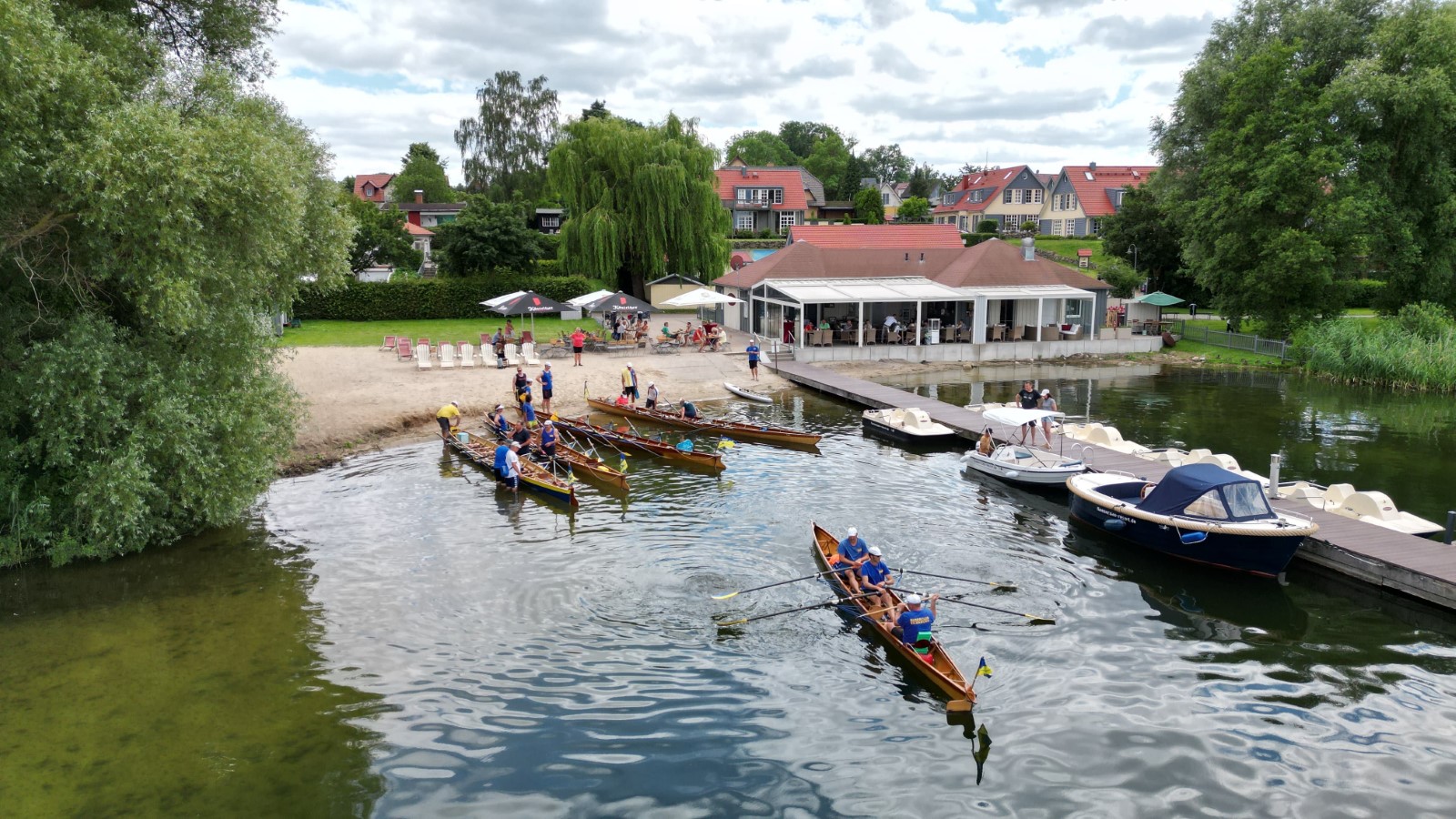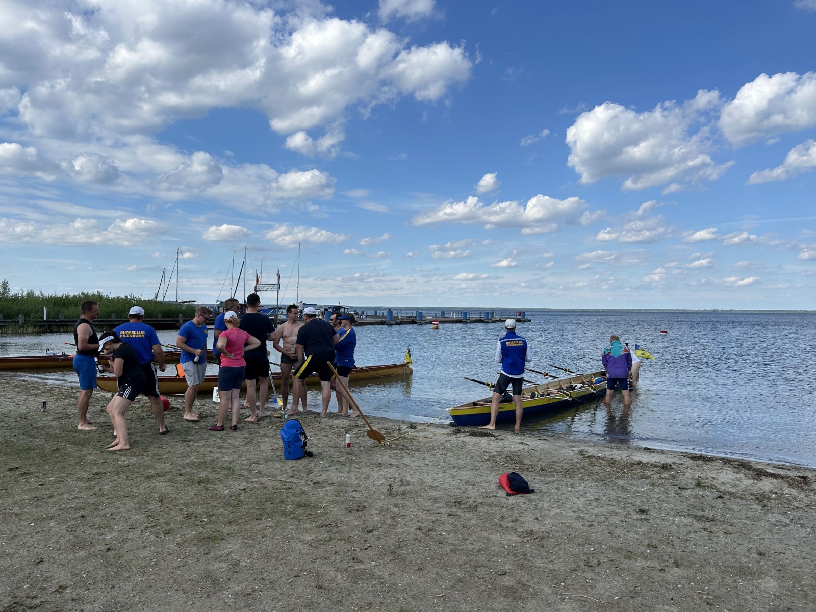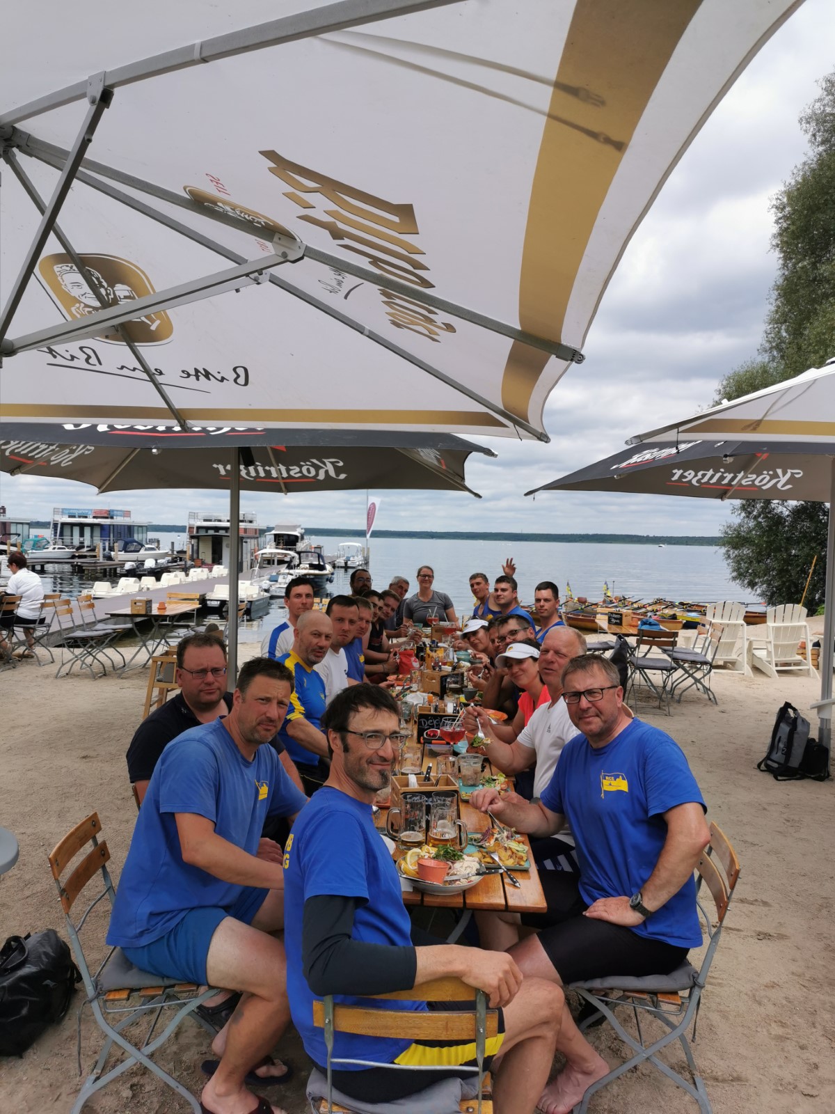 Nach der Einfahrt in die kleine Müritz machten wir schon mal eine erste Bekanntschaft mit dem strammen Westwind, vor allem bei der Anfahrt an das östlich gelegene Rechliner Mittagsziel. Die meisten bogen in den Yachtbereich ein, wofür der Hafenmeister eine saftige Liegegebühr kassierte. Sowas war neu und sollte uns noch einige Male auf der Fahrt passieren. Der gute Mann prophezeite aktuell und bis in den Abend hinein 1,5 Meter hohe Wellen auf der Müritz und hoffte wohl auch auf weitere Einnahmen. Vorerst sprach man dem gepflegten gastronomischen Angebot der Hafengaststätte zu und diskutierte das Für und Wider der weiteren Tagesplanung. Diese hatte eine überwiegend windgeschützte Route unter Land vorgesehen. Dennoch entschied sich eine Mannschaft für den sicheren Transfer mit dem Bootshänger. Drei Vierer und ein Zweier nahmen den Wasserweg und sollten es trotz zweier Passagen mit Anspruch nicht bereuen. Tolles Gefühl, kurz vor der Ausfahrt die ostseeartige Weite der Müritz in ihrer ganzen Länge wahrzunehmen. Auf dem Weg nahm man eine angenehme Baderast am Campingplatz Ludorf mit, bevor es etwas spezieller wurde. Am Ende gab es verschiedene Taktiken gegen die Wellen. Die einen versuchten es im 90°-Winkel und mussten hin und wieder schöpfen, waren aber die schnellsten. Andere kreuzten mehr oder weniger leicht gegen den Wind und kamen so zurecht. Die ‚Marienburg' war mit rudern, steuern und pausieren komplett ausgelastet und gelangte daher etwas abgeschlagen und wasserlastig ans sichere Röbeler Ufer. Kaum waren die Boote an Land, wartete die nächste Erfrischung an „Marie‘s Strandbar“. Bald standen auch die Zelte am Campingplatz „Pappelbucht“. Frisch geduscht machte man sich auf den Weg in die Gaststätte „Regattahaus“, wo in fröhlicher Runde angemessen gespeist und getrunken wurde. Danach ließen sich einige von herüber schallender Musik zur Hafenparty locken. Der Rest machte es sich im Zeltlager bequem, wo zu später Stunde noch die Welturaufführung von Franks beeindruckenden Dokumentarfilm zur 2022er Unstrut-Saale-Wanderfahrt des RCE auf Leinwand gebeamt wurde.
