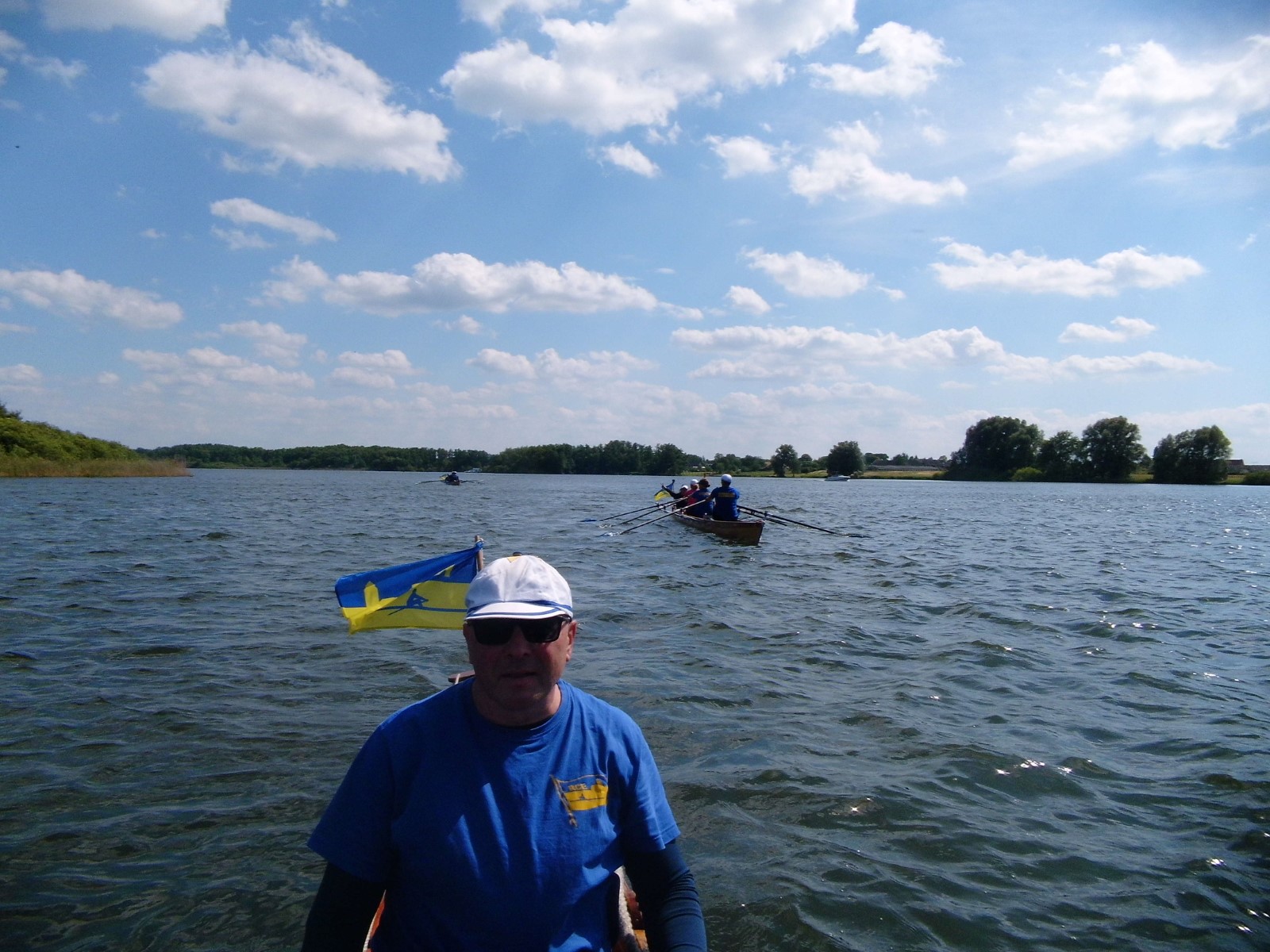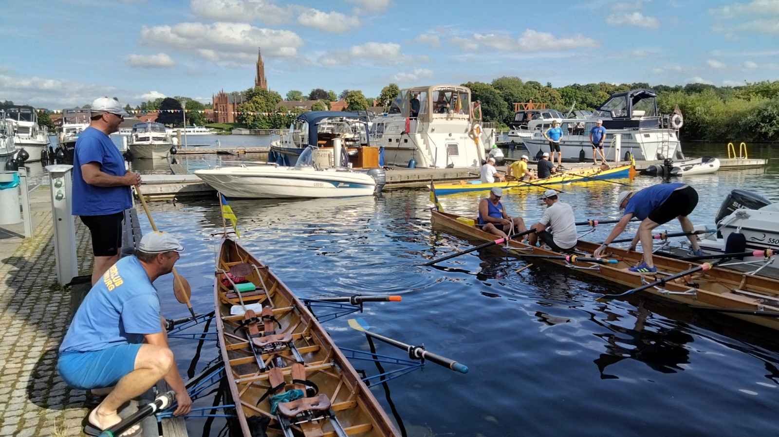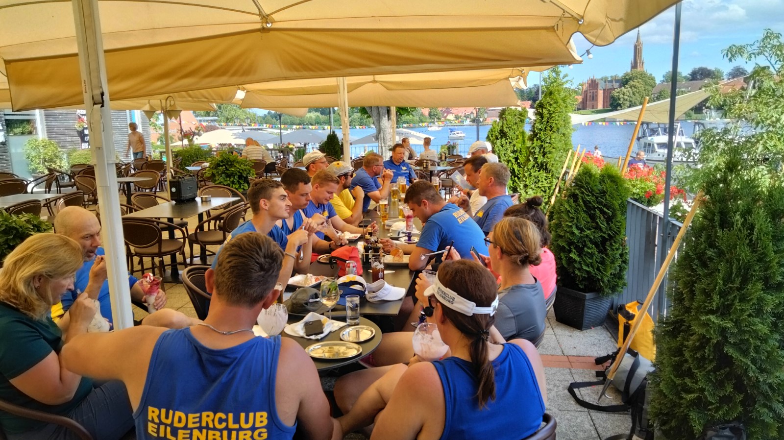 Nach der Einfahrt in die kleine Müritz machten wir schon mal eine erste Bekanntschaft mit dem strammen Westwind, vor allem bei der Anfahrt an das östlich gelegene Rechliner Mittagsziel. Die meisten bogen in den Yachtbereich ein, wofür der Hafenmeister eine saftige Liegegebühr kassierte. Sowas war neu und sollte uns noch einige Male auf der Fahrt passieren. Der gute Mann prophezeite aktuell und bis in den Abend hinein 1,5 Meter hohe Wellen auf der Müritz und hoffte wohl auch auf weitere Einnahmen. Vorerst sprach man dem gepflegten gastronomischen Angebot der Hafengaststätte zu und diskutierte das Für und Wider der weiteren Tagesplanung. Diese hatte eine überwiegend windgeschützte Route unter Land vorgesehen. Dennoch entschied sich eine Mannschaft für den sicheren Transfer mit dem Bootshänger. Drei Vierer und ein Zweier nahmen den Wasserweg und sollten es trotz zweier Passagen mit Anspruch nicht bereuen. Tolles Gefühl, kurz vor der Ausfahrt die ostseeartige Weite der Müritz in ihrer ganzen Länge wahrzunehmen. Auf dem Weg nahm man eine angenehme Baderast am Campingplatz Ludorf mit, bevor es etwas spezieller wurde. Am Ende gab es verschiedene Taktiken gegen die Wellen. Die einen versuchten es im 90°-Winkel und mussten hin und wieder schöpfen, waren aber die schnellsten. Andere kreuzten mehr oder weniger leicht gegen den Wind und kamen so zurecht. Die ‚Marienburg' war mit rudern, steuern und pausieren komplett ausgelastet und gelangte daher etwas abgeschlagen und wasserlastig ans sichere Röbeler Ufer. Kaum waren die Boote an Land, wartete die nächste Erfrischung an „Marie‘s Strandbar“. Bald standen auch die Zelte am Campingplatz „Pappelbucht“. Frisch geduscht machte man sich auf den Weg in die Gaststätte „Regattahaus“, wo in fröhlicher Runde angemessen gespeist und getrunken wurde. Danach ließen sich einige von herüber schallender Musik zur Hafenparty locken. Der Rest machte es sich im Zeltlager bequem, wo zu später Stunde noch die Welturaufführung von Franks beeindruckenden Dokumentarfilm zur 2022er Unstrut-Saale-Wanderfahrt des RCE auf Leinwand gebeamt wurde.