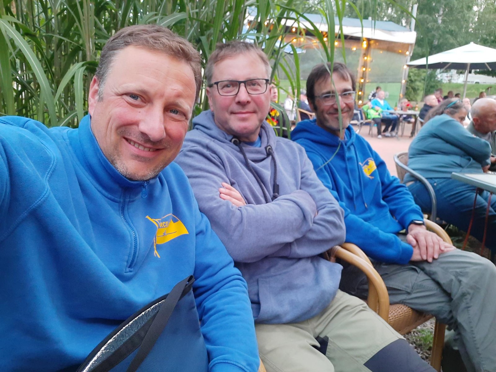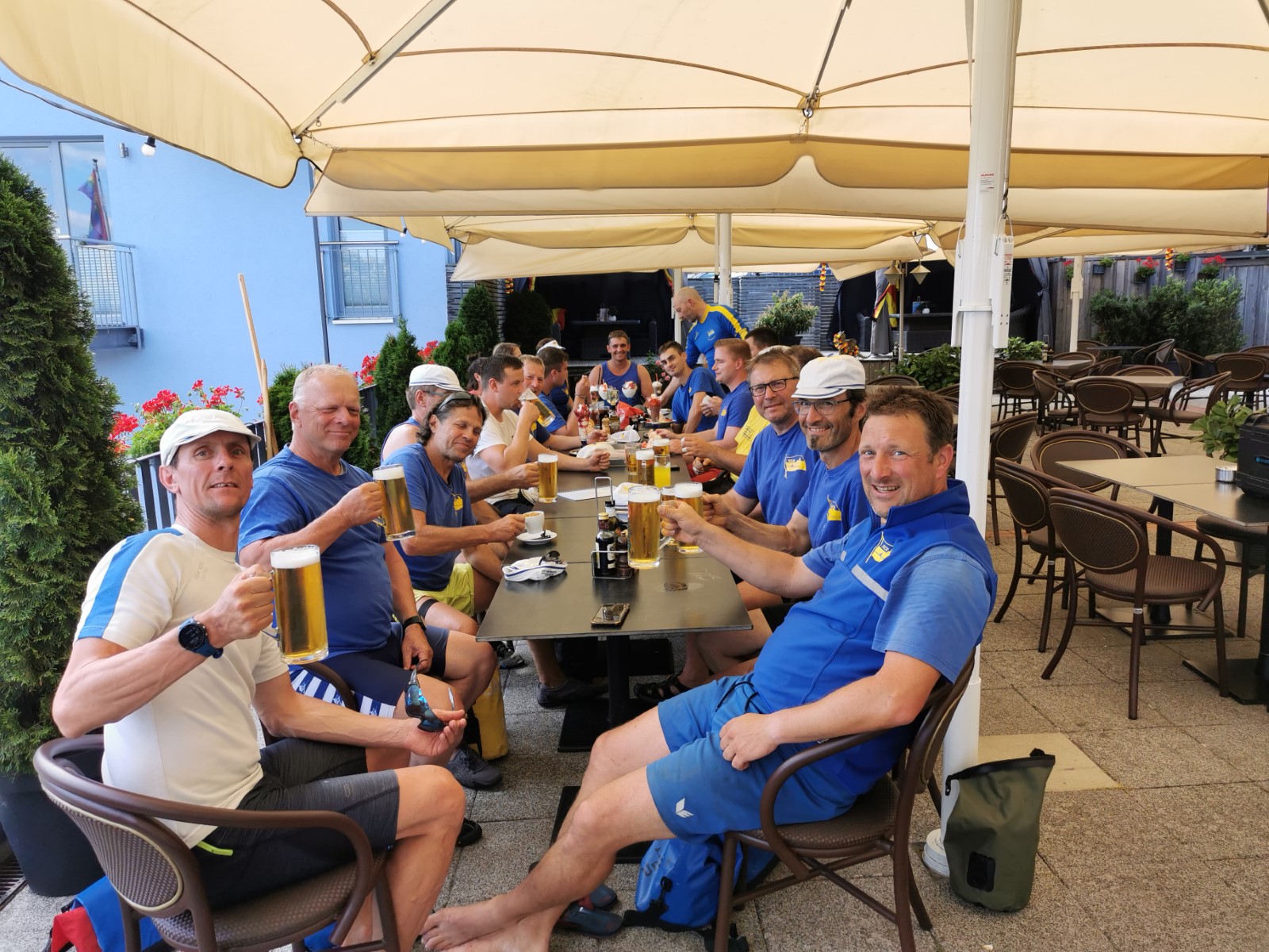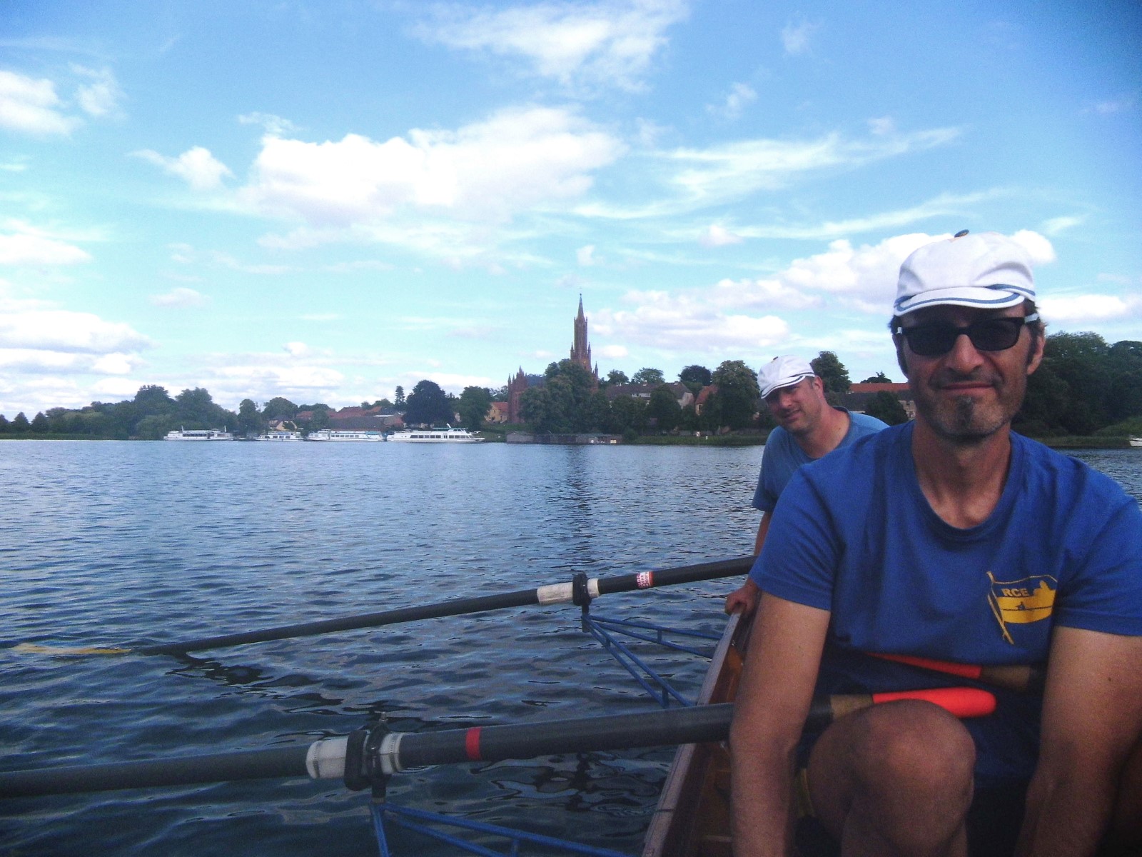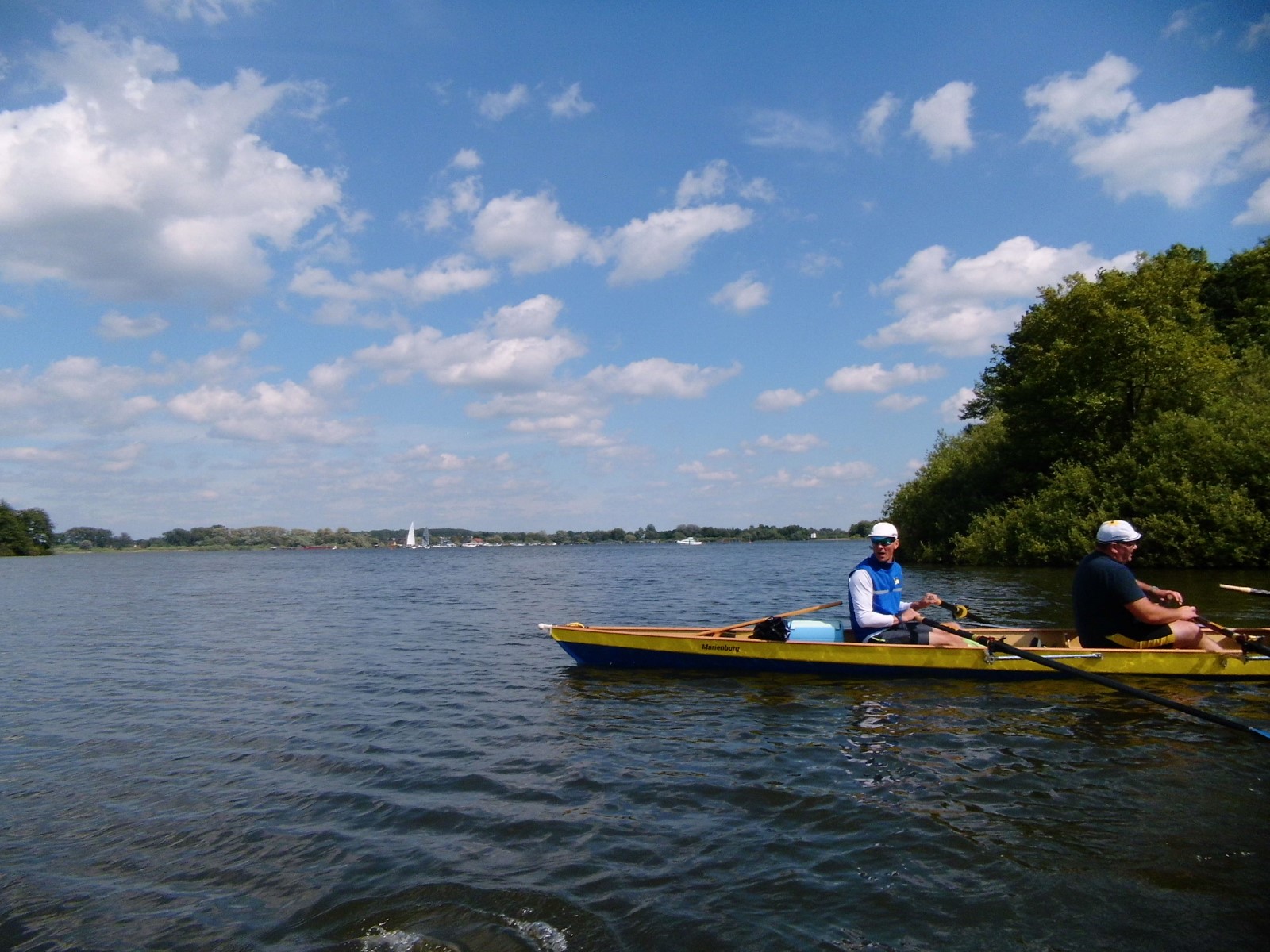 Nach der Einfahrt in die kleine Müritz machten wir schon mal eine erste Bekanntschaft mit dem strammen Westwind, vor allem bei der Anfahrt an das östlich gelegene Rechliner Mittagsziel. Die meisten bogen in den Yachtbereich ein, wofür der Hafenmeister eine saftige Liegegebühr kassierte. Sowas war neu und sollte uns noch einige Male auf der Fahrt passieren. Der gute Mann prophezeite aktuell und bis in den Abend hinein 1,5 Meter hohe Wellen auf der Müritz und hoffte wohl auch auf weitere Einnahmen. Vorerst sprach man dem gepflegten gastronomischen Angebot der Hafengaststätte zu und diskutierte das Für und Wider der weiteren Tagesplanung. Diese hatte eine überwiegend windgeschützte Route unter Land vorgesehen. Dennoch entschied sich eine Mannschaft für den sicheren Transfer mit dem Bootshänger. Drei Vierer und ein Zweier nahmen den Wasserweg und sollten es trotz zweier Passagen mit Anspruch nicht bereuen. Tolles Gefühl, kurz vor der Ausfahrt die ostseeartige Weite der Müritz in ihrer ganzen Länge wahrzunehmen. Auf dem Weg nahm man eine angenehme Baderast am Campingplatz Ludorf mit, bevor es etwas spezieller wurde. Am Ende gab es verschiedene Taktiken gegen die Wellen. Die einen versuchten es im 90°-Winkel und mussten hin und wieder schöpfen, waren aber die schnellsten. Andere kreuzten mehr oder weniger leicht gegen den Wind und kamen so zurecht. Die ‚Marienburg' war mit rudern, steuern und pausieren komplett ausgelastet und gelangte daher etwas abgeschlagen und wasserlastig ans sichere Röbeler Ufer. Kaum waren die Boote an Land, wartete die nächste Erfrischung an „Marie‘s Strandbar“. Bald standen auch die Zelte am Campingplatz „Pappelbucht“. Frisch geduscht machte man sich auf den Weg in die Gaststätte „Regattahaus“, wo in fröhlicher Runde angemessen gespeist und getrunken wurde. Danach ließen sich einige von herüber schallender Musik zur Hafenparty locken. Der Rest machte es sich im Zeltlager bequem, wo zu später Stunde noch die Welturaufführung von Franks beeindruckenden Dokumentarfilm zur 2022er Unstrut-Saale-Wanderfahrt des RCE auf Leinwand gebeamt wurde.