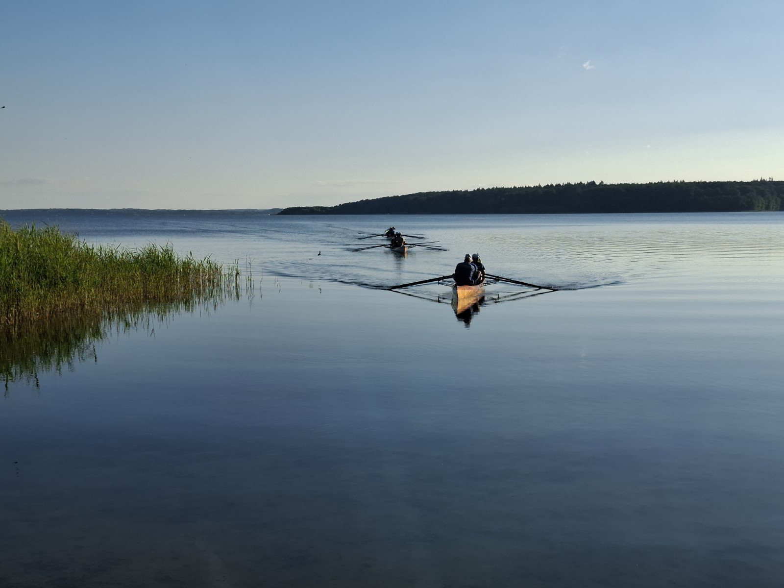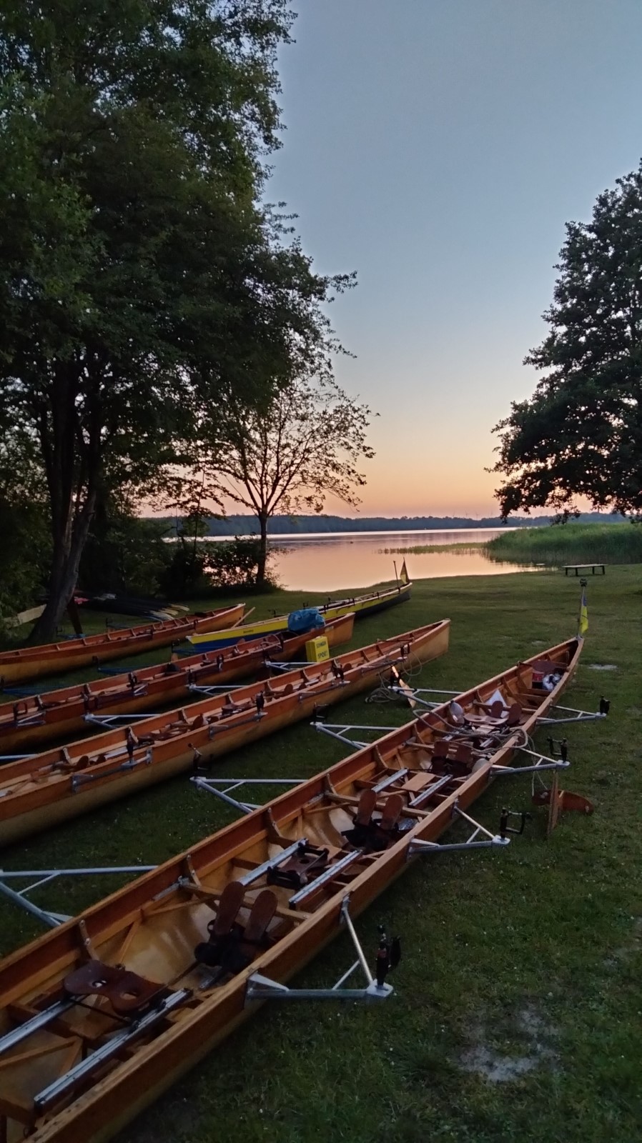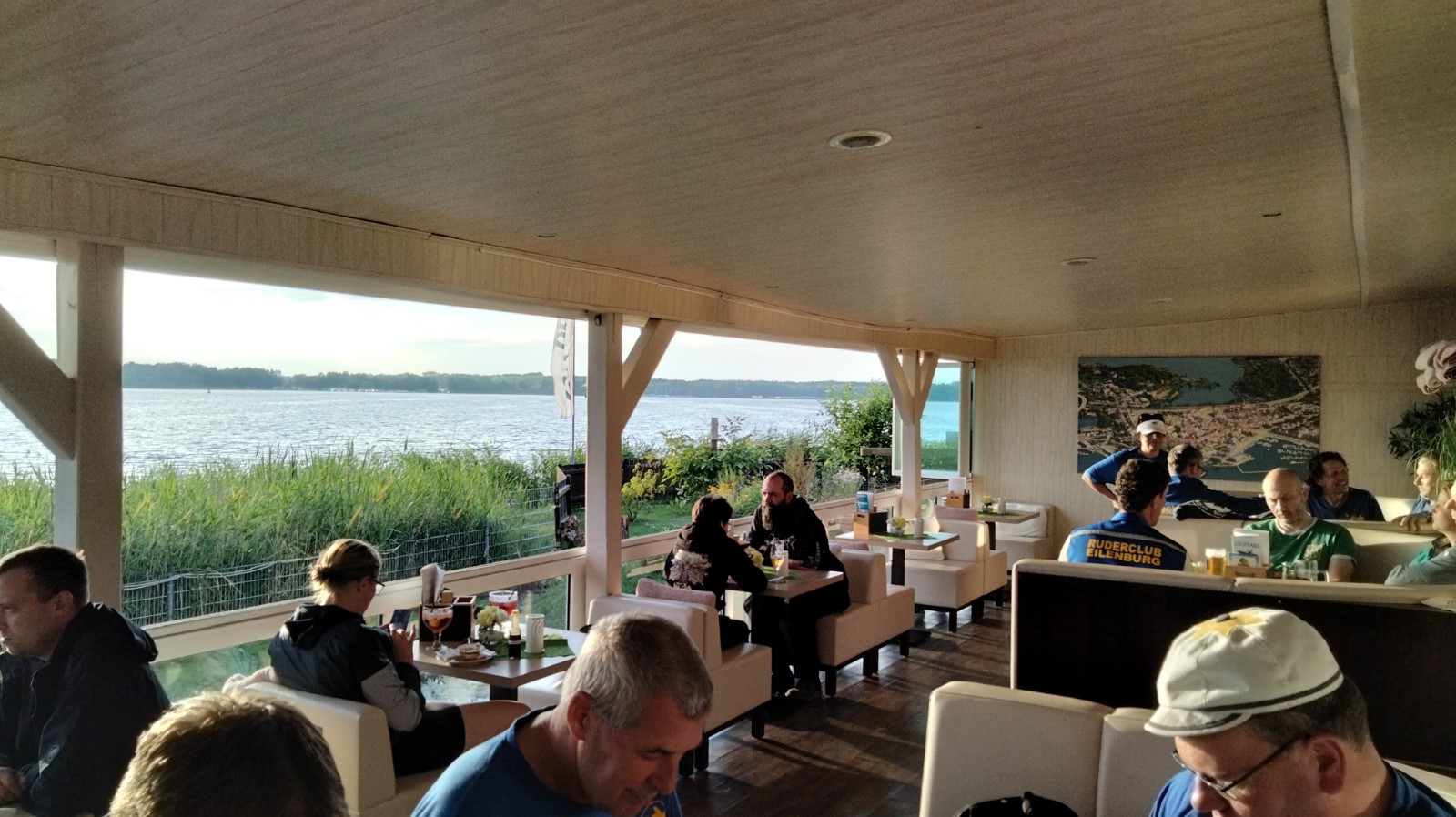 Bei strahlender Morgensonne und angenehmen Temperaturen kam ein Boot nach dem anderen über die schmale Einsatzstelle unter hohen Bäumen aufs Wasser. Es standen nur etwa 12 Kilometer auf dem Plan, deshalb wollte man den Tag ruhig angehen. Schon am Campingplatz Nitschow deshalb die erste Rast, wo der Wirt seine Imbissbude uns zu Liebe vorzeitig öffnete. Nach der nächsten Landspitze schob der mäßige Wind wieder etwas mehr Wellen zusammen, die man jedoch routiniert zu nehmen wusste. Schließlich lockte Sietow-Dorf zum Mittagstisch mit Fischbrötchen und Flammkuchen in einem neu eröffneten Lokal. Der Bäcker und seine Frau hatten ihre liebe Not mit unserem Ansturm auf Ofen und Ausschank, verabschiedeten uns am Ende aber glücklich und zufrieden. Danach ging es unter Land weiter bis nach Klink mit beeindruckendem Neorenaissance-Schloss und vor allem einem Ristorante mit rotblondem Müritz-Gold vom Fass, wahlweise auch Aperol oder Limoncello -Sprizz. Im schattigen Freisitz verging die Zeit schneller als gedacht. Nun noch die letzten beiden Kilometer auf dem größten deutschen Binnensee... und die Reservierungszeit im Lokal "Seebad" war gerissen. Wir kamen aus unserer Sicht 30 Minuten zu spät, das Personal ging von einer Stunde aus. Und machte an diesem Sonntagabend aus ihrem Mangel an Begeisterung keinen Hehl. Zumindest die Bedienung nahm es sportlich. Das wunderschöne Panorama mit Abendsonne machte auch einiges wett, es reichte jedoch nicht zur vollen kulinarischen Zufriedenheit. Zur Rückkehr lief schon die heftig umstrittene Fußball-EM-Partie Deutschland gegen Schweiz. Das Campingplatz-Bistro hatte mehrere große Bildschirme im Freisitz verteilt, hier und da fand sich noch ein Plätzchen für den geneigten Wanderruderer. Alle anderen klönten noch geraume Zeit im Stuhlkreis zwischen Fahrzeug und Bootshänger bei den Zelten. Nach dem 1:1 kehrte auch hier irgendwann Ruhe ein.
