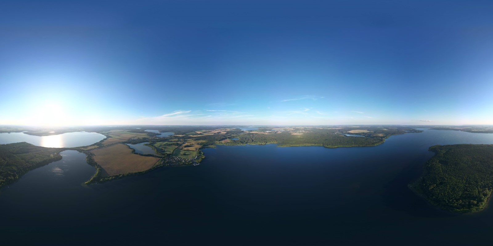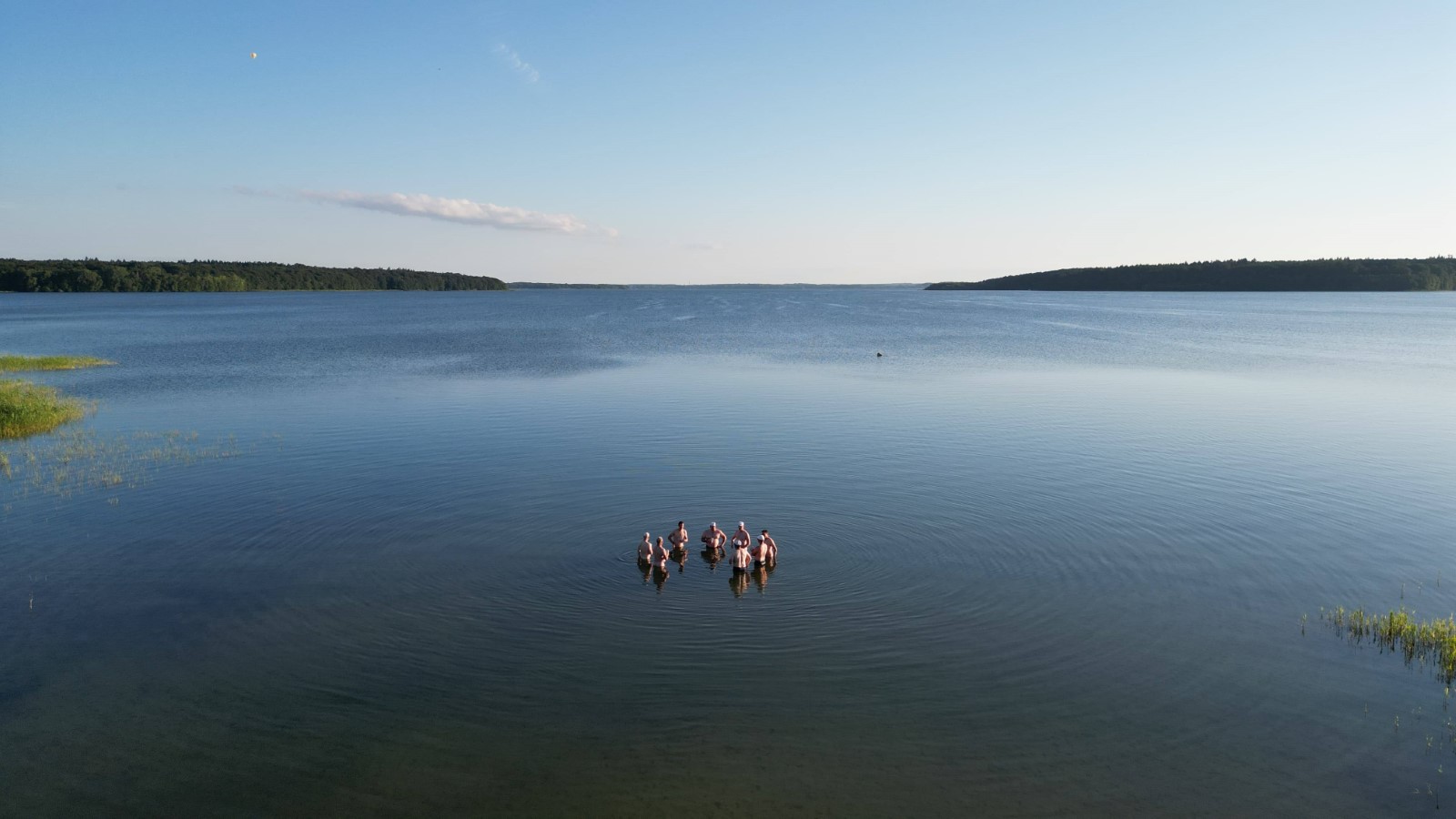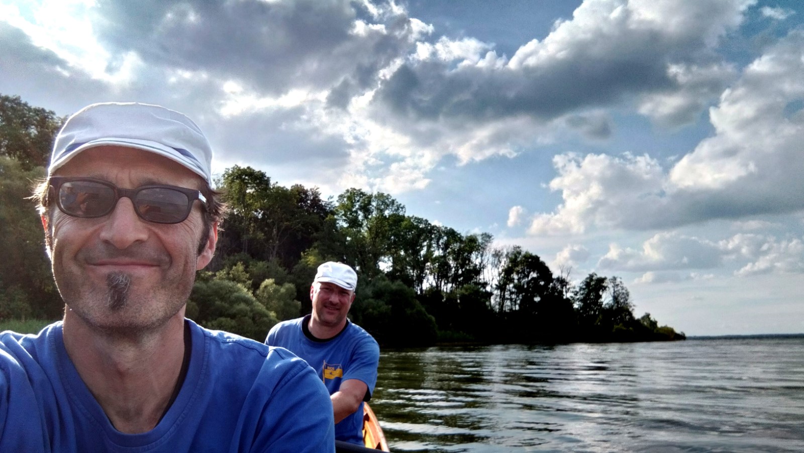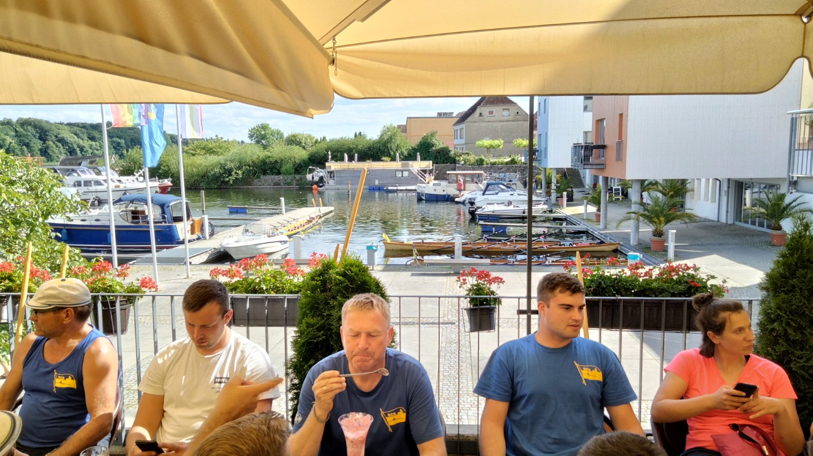 Bei strahlender Morgensonne und angenehmen Temperaturen kam ein Boot nach dem anderen über die schmale Einsatzstelle unter hohen Bäumen aufs Wasser. Es standen nur etwa 12 Kilometer auf dem Plan, deshalb wollte man den Tag ruhig angehen. Schon am Campingplatz Nitschow deshalb die erste Rast, wo der Wirt seine Imbissbude uns zu Liebe vorzeitig öffnete. Nach der nächsten Landspitze schob der mäßige Wind wieder etwas mehr Wellen zusammen, die man jedoch routiniert zu nehmen wusste. Schließlich lockte Sietow-Dorf zum Mittagstisch mit Fischbrötchen und Flammkuchen in einem neu eröffneten Lokal. Der Bäcker und seine Frau hatten ihre liebe Not mit unserem Ansturm auf Ofen und Ausschank, verabschiedeten uns am Ende aber glücklich und zufrieden. Danach ging es unter Land weiter bis nach Klink mit beeindruckendem Neorenaissance-Schloss und vor allem einem Ristorante mit rotblondem Müritz-Gold vom Fass, wahlweise auch Aperol oder Limoncello -Sprizz. Im schattigen Freisitz verging die Zeit schneller als gedacht. Nun noch die letzten beiden Kilometer auf dem größten deutschen Binnensee... und die Reservierungszeit im Lokal "Seebad" war gerissen. Wir kamen aus unserer Sicht 30 Minuten zu spät, das Personal ging von einer Stunde aus. Und machte an diesem Sonntagabend aus ihrem Mangel an Begeisterung keinen Hehl. Zumindest die Bedienung nahm es sportlich. Das wunderschöne Panorama mit Abendsonne machte auch einiges wett, es reichte jedoch nicht zur vollen kulinarischen Zufriedenheit. Zur Rückkehr lief schon die heftig umstrittene Fußball-EM-Partie Deutschland gegen Schweiz. Das Campingplatz-Bistro hatte mehrere große Bildschirme im Freisitz verteilt, hier und da fand sich noch ein Plätzchen für den geneigten Wanderruderer. Alle anderen klönten noch geraume Zeit im Stuhlkreis zwischen Fahrzeug und Bootshänger bei den Zelten. Nach dem 1:1 kehrte auch hier irgendwann Ruhe ein.