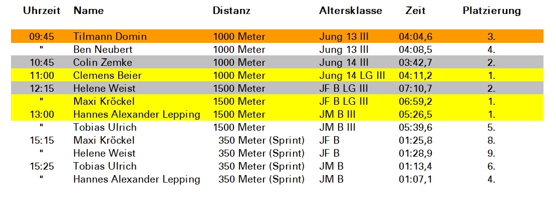 Daya Stiebitz holte sich auf 1000 Metern den 2.Platz im Mädchen-Einer der 13-Jährigen. Mit gleichem Ergebnis war Hannes Lepping als Junior dabei. Im Sprintrennen über 350m der Männer-Doppelzweier nahmen Tony Palm und Julius Kötter Platz 3 mit nach Hause. Colin Zemke sprintete im Einer der 14-Jährigen als zweiter durchs Ziel. Mit sechs Zehnteln Vorsprung gelang der Juniorin Maxi Kröckel ein dritter Rang auf gleicher Strecke. Zu guter Letzt legte Hannes Lepping noch mal nach: Platz 2 im Sprint!